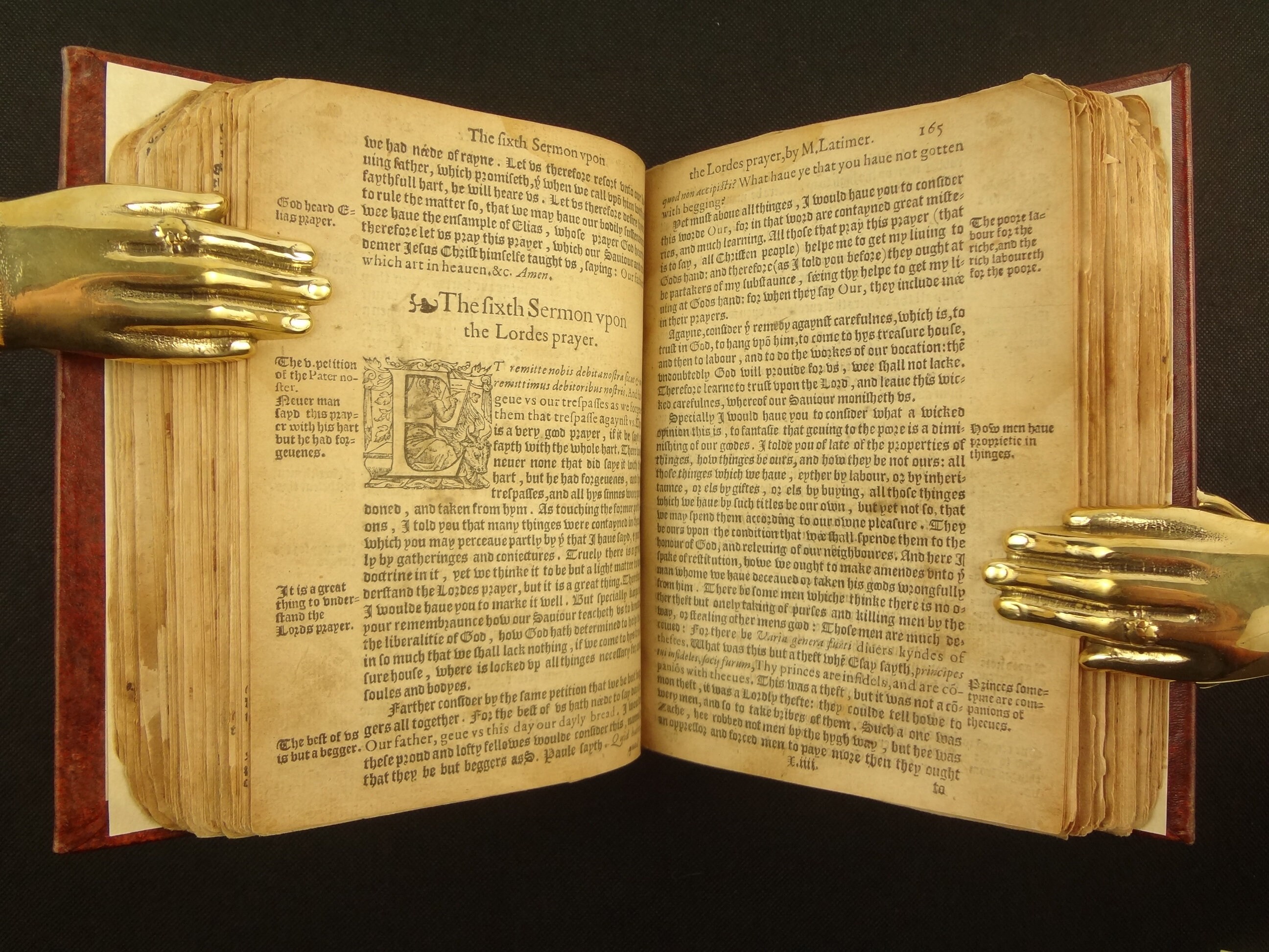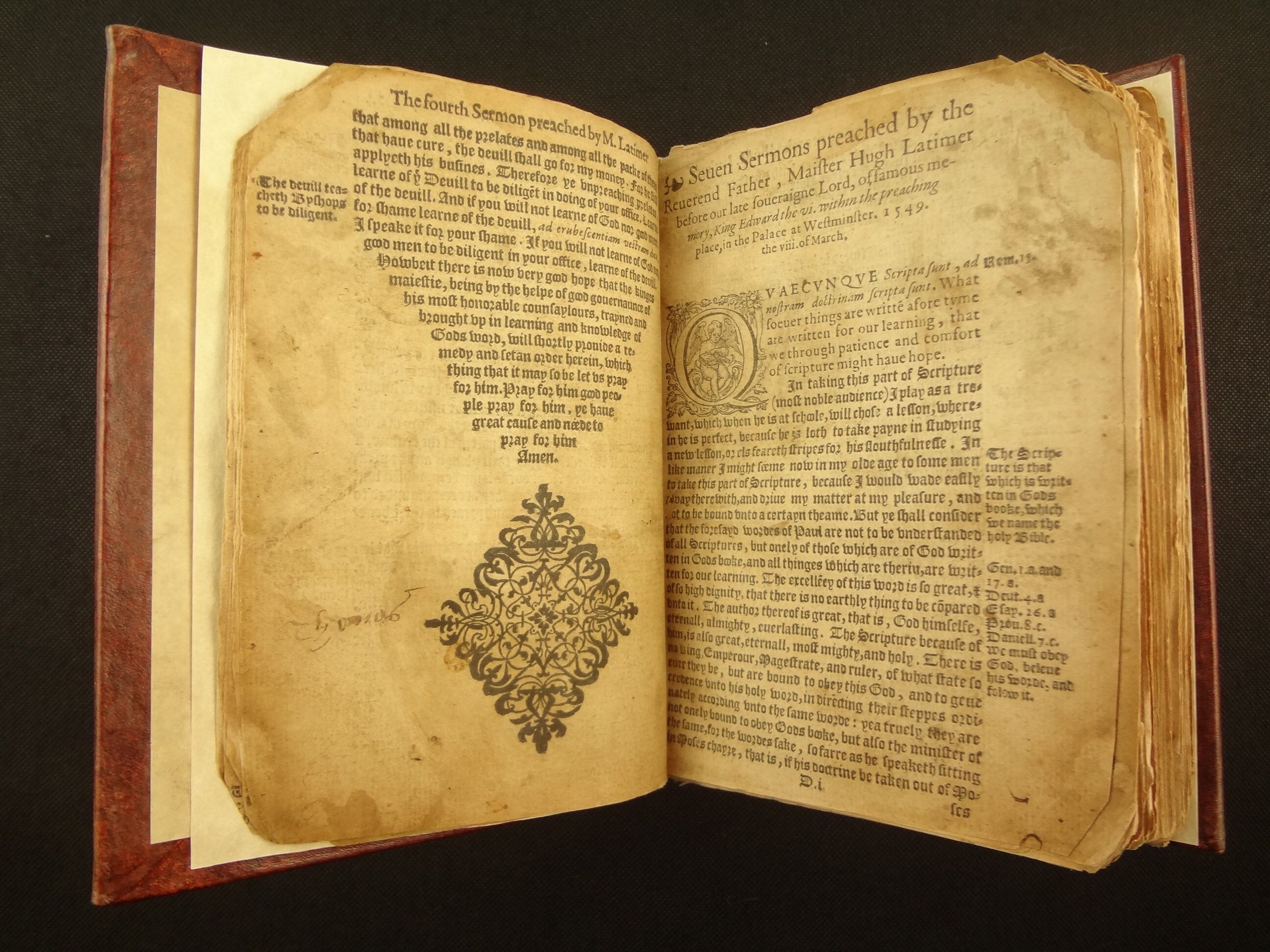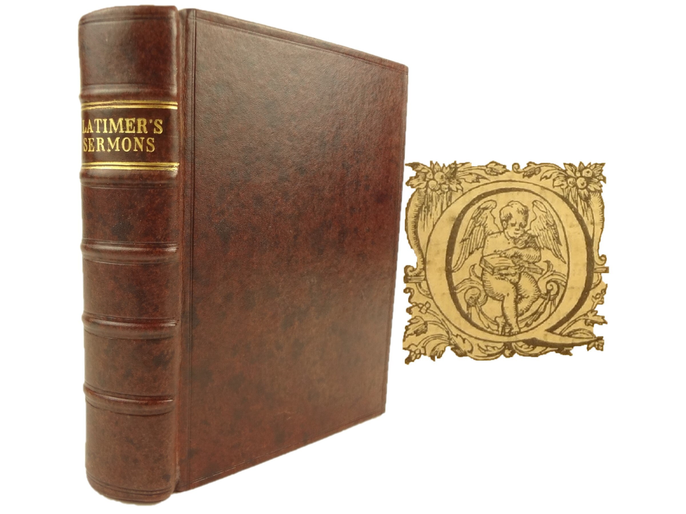 See pictures. Binding is modern and almost perfect; I see only a light rub on the front board, approx. 2 cm (perhaps a ring rub). Latimer portrait over pastedown (inside the front board). Missing 55 leaves (mostly at front, and rest at rear), 276 leaves present. Refreshed endpapers. Browning, corners clipped, thumb marks, occasional fox spots, fore-edge tears, small tears, old tissue repairs, etc., throughout. Whoever organized the signatures for binding must have been drinking; quite a few quires and leaves out of place (see collation). Occasional marginal annotations in an old hand ("Willm Pla(tt?) of Bury", p98). ​Price reflects condition. Great binding, but 1/6th of the work isn't here, and the pages are a little rough. But it's a rare work, hard to find at any cost.
