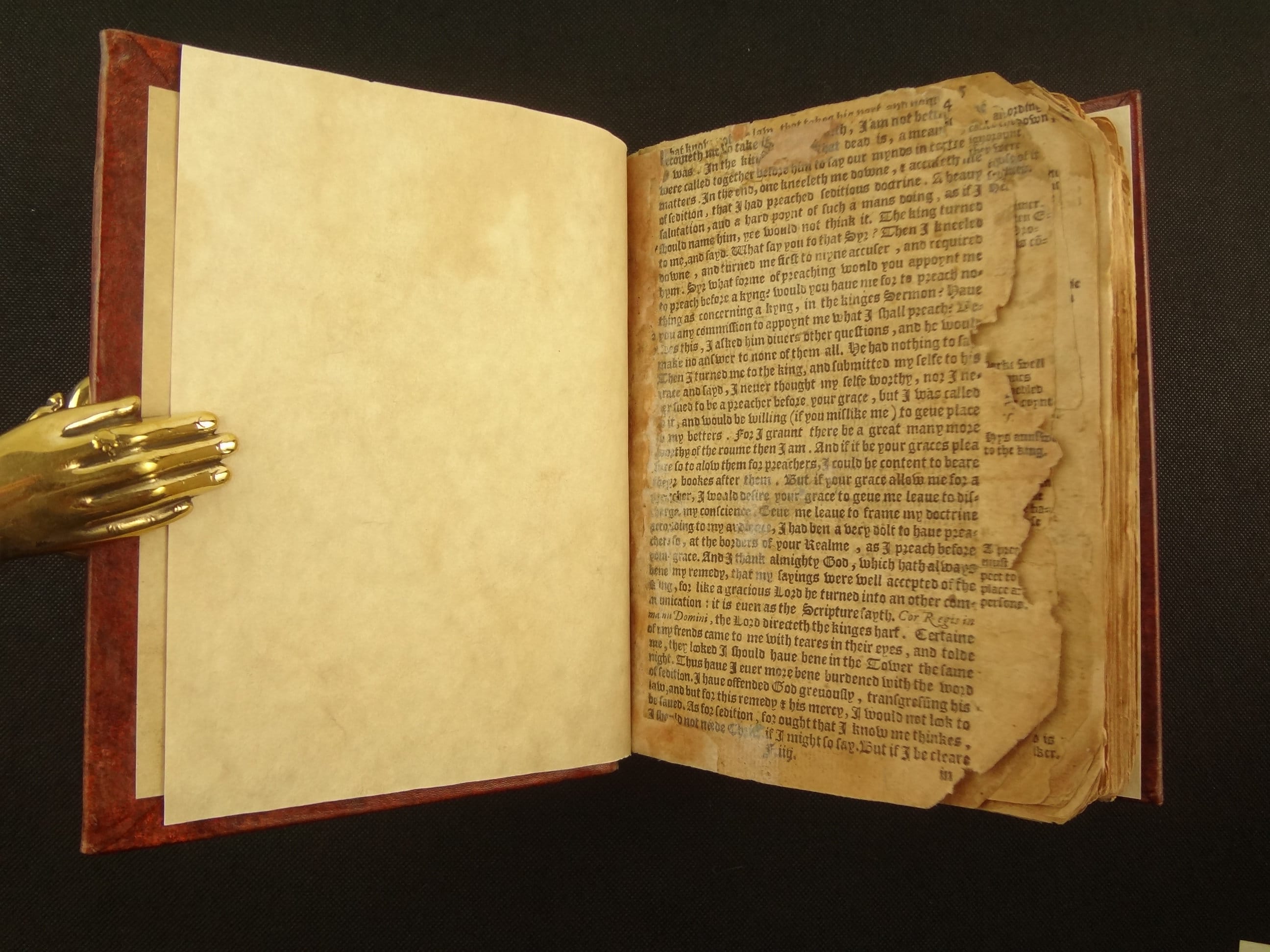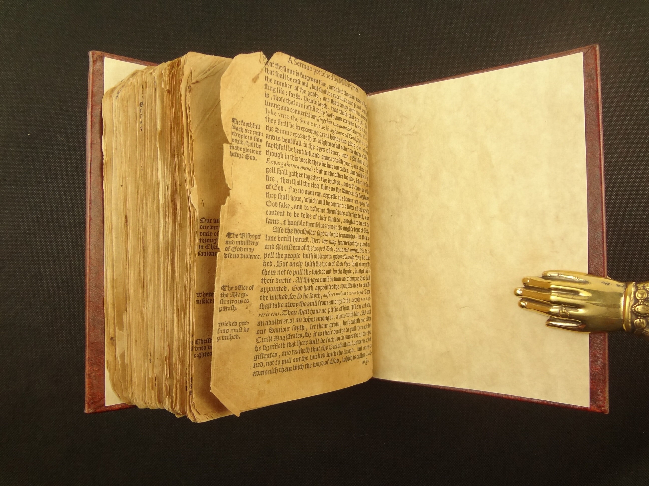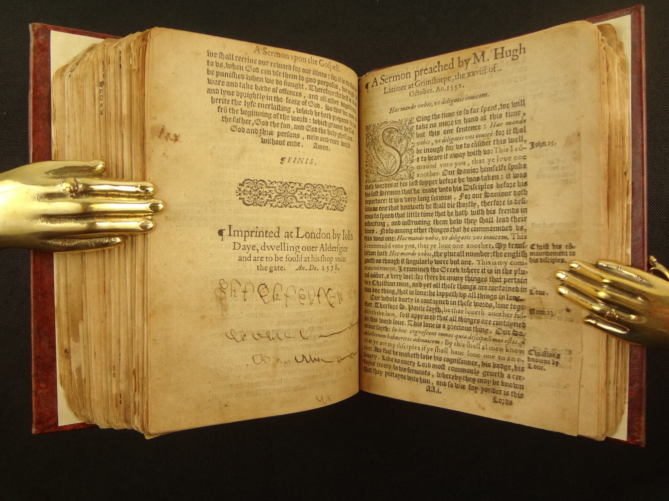See pictures. Binding is modern and almost perfect; I see only a light rub on the front board, approx. 2 cm (perhaps a ring rub). Latimer portrait over pastedown (inside the front board). Missing 55 leaves (mostly at front, and rest at rear), 276 leaves present. Refreshed endpapers. Browning, corners clipped, thumb marks, occasional fox spots, fore-edge tears, small tears, old tissue repairs, etc., throughout. Whoever organized the signatures for binding must have been drinking; quite a few quires and leaves out of place (see collation). Occasional marginal annotations in an old hand ("Willm Pla(tt?) of Bury", p98). ​Price reflects condition. Great binding, but 1/6th of the work isn't here, and the pages are a little rough. But it's a rare work, hard to find at any cost.