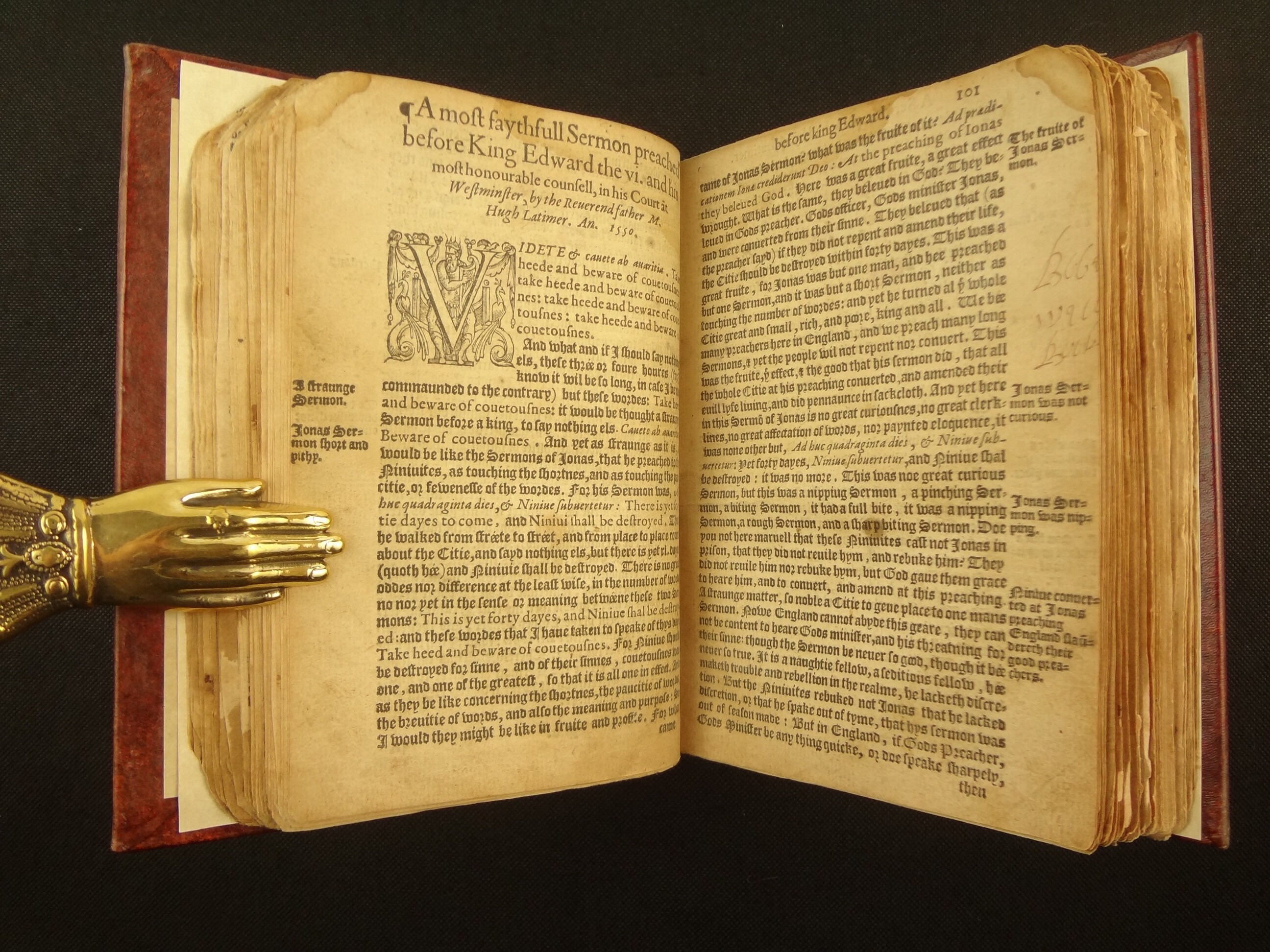 A 1578 printing of the Sermons of the Christian martyr Hugh Latimer, who was burned at the stake in 1555. This copy has a wonderful binding, but the work it holds is rough, is missing about 1/6th of the leaves, and there are some leaves bound in the wrong place. At the time of listing this book, "good" copies of 16th century Latimer's Frutefull Sermons are selling for approx. $2,500, per Vialibri; I'll offer this copy at a 1/3rd of the cost, to reflect condition.