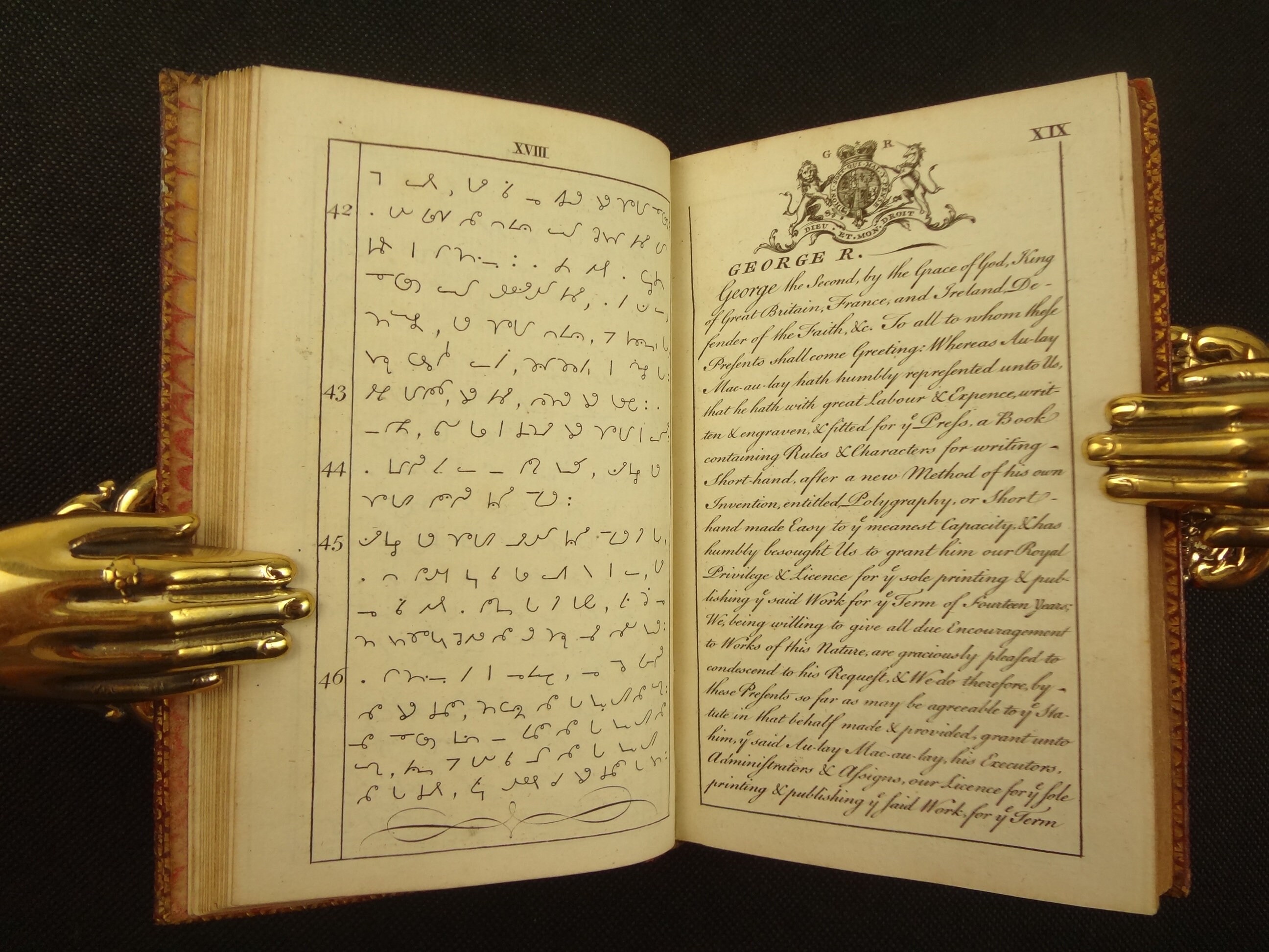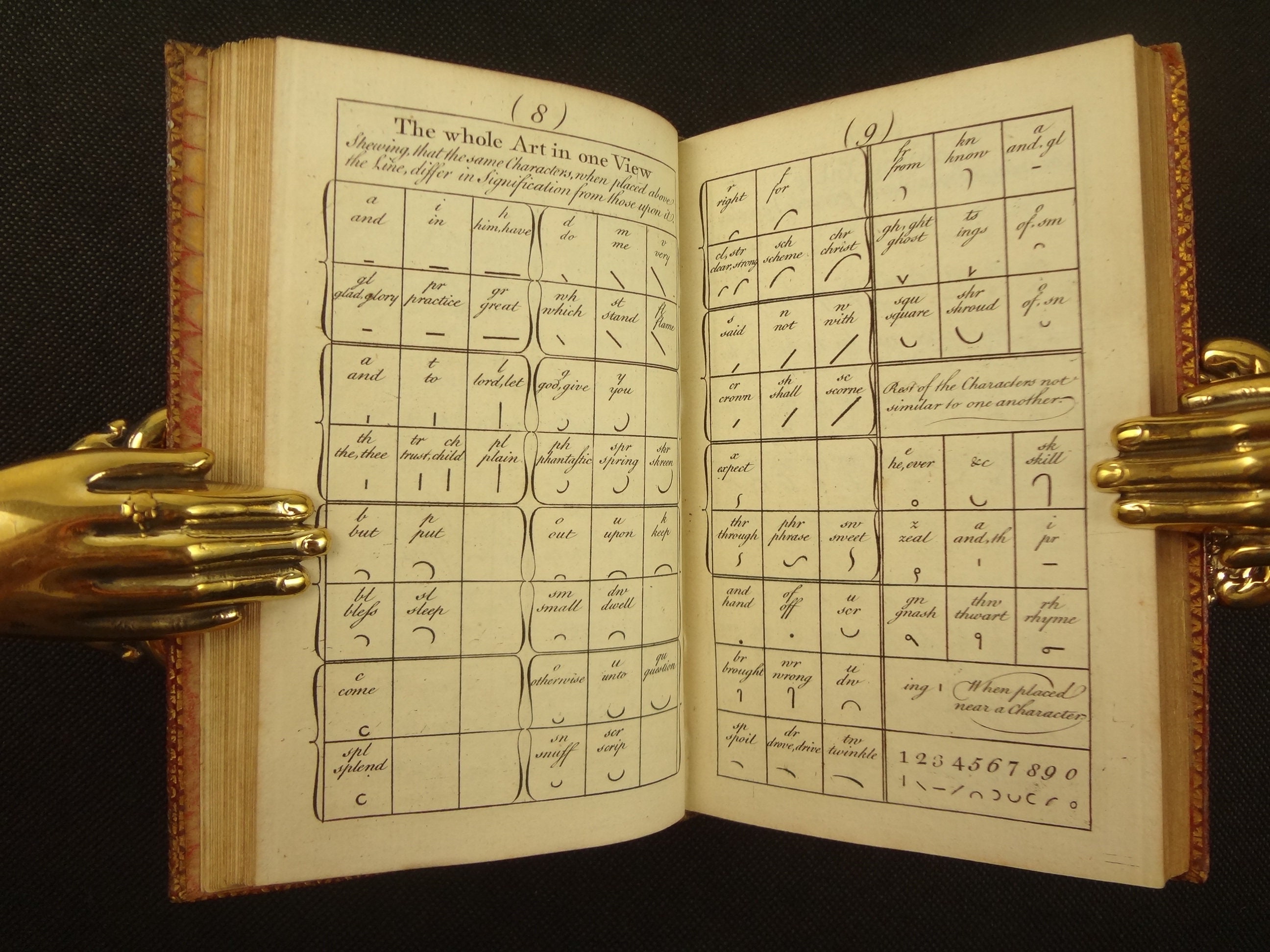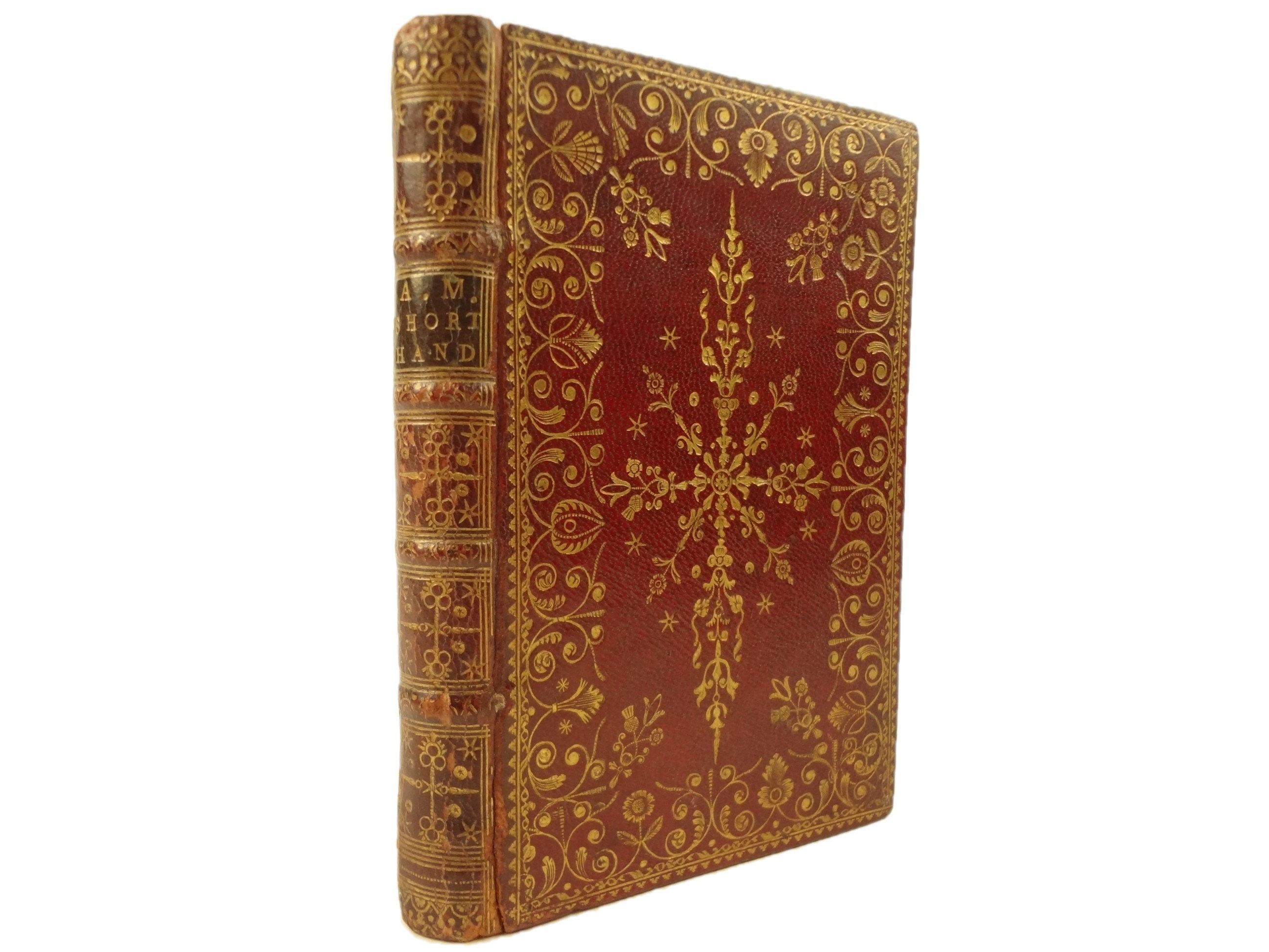 Measures approx. 14 x 9 x 2 cm. Red morocco binding the 18th century style. Gilt outer board frames include leaves, budding flowers, dentelle florets, etc.; central medallion is comprised of many tools and reminiscent of the Harleian diamond panels. Spine with four raised bands; four compartment with a selection of gilt tools including a sun and stars like motif, one compartment with "A.M. SHORTHAND" in gilt on black morocco. Marbled endpapers. One fold-out. Royal arms. Missing frontis illustration. Pages - (3 leaves), I-XXVI, 119 (1).