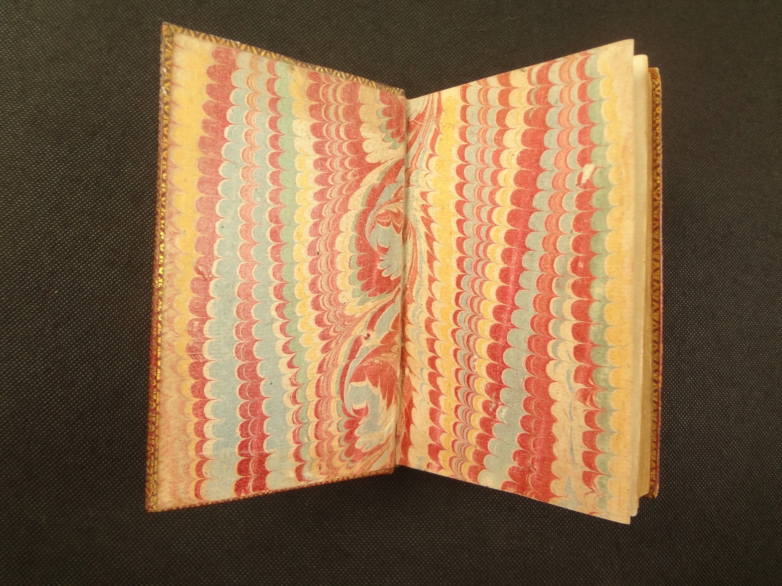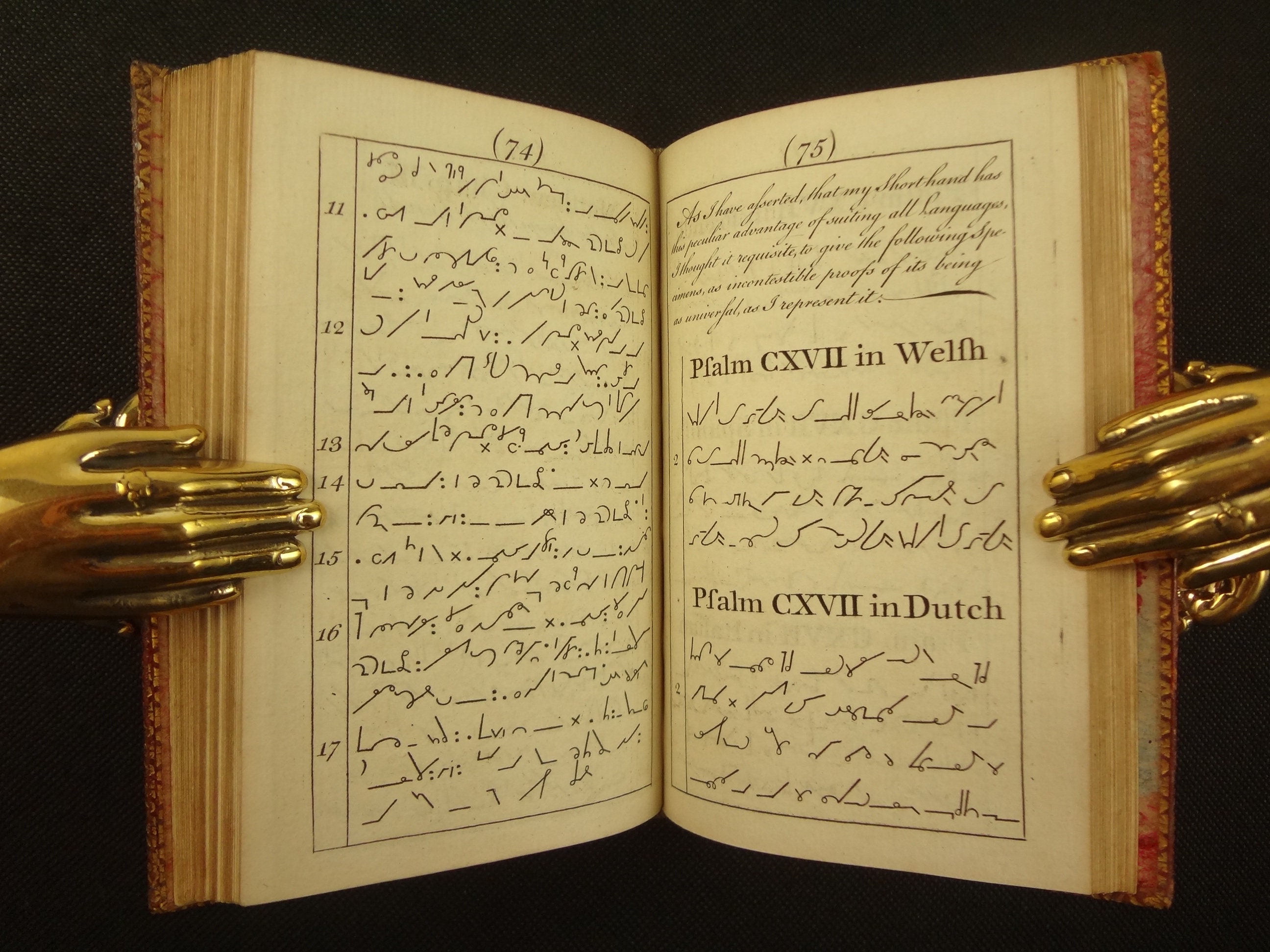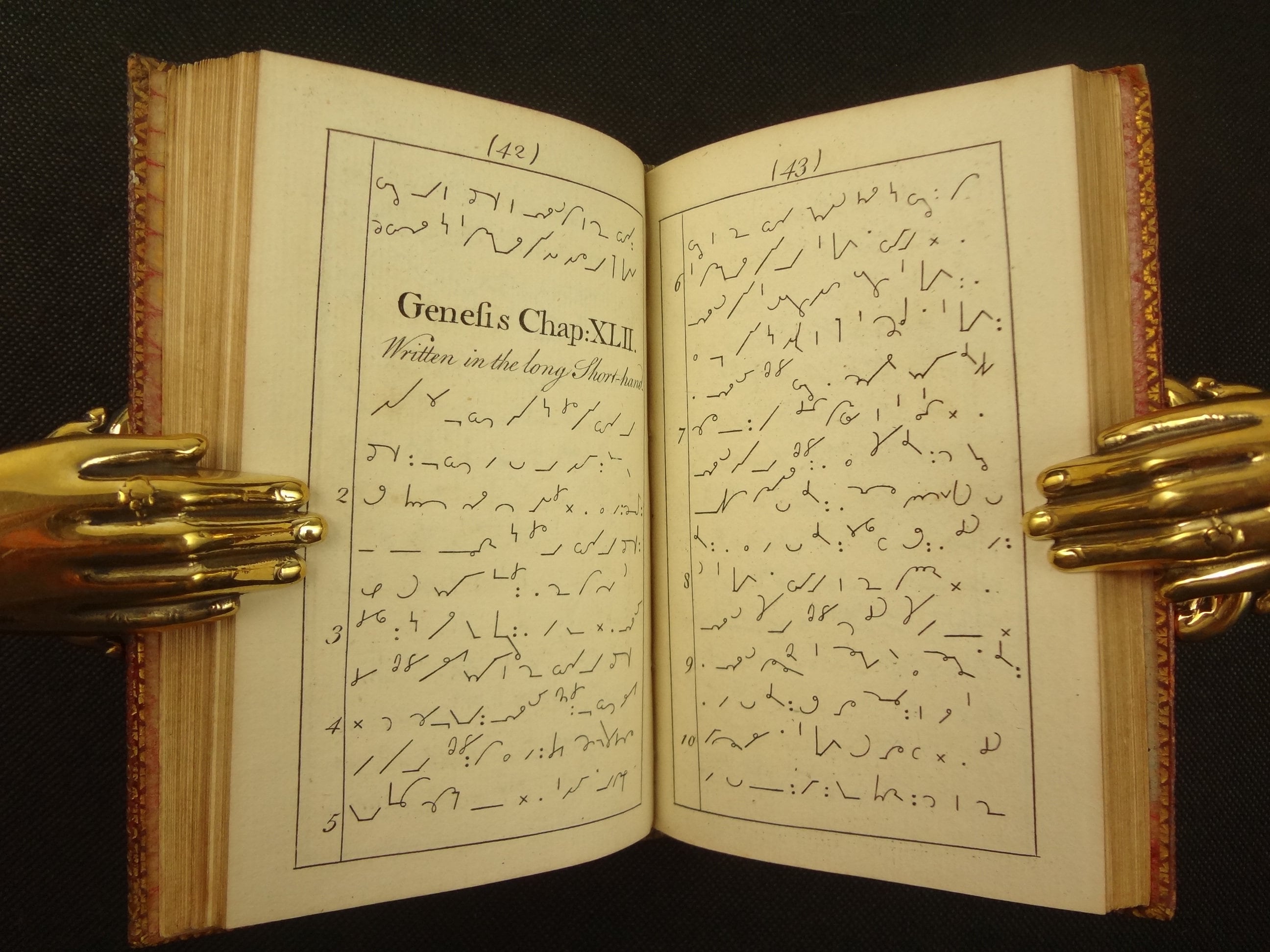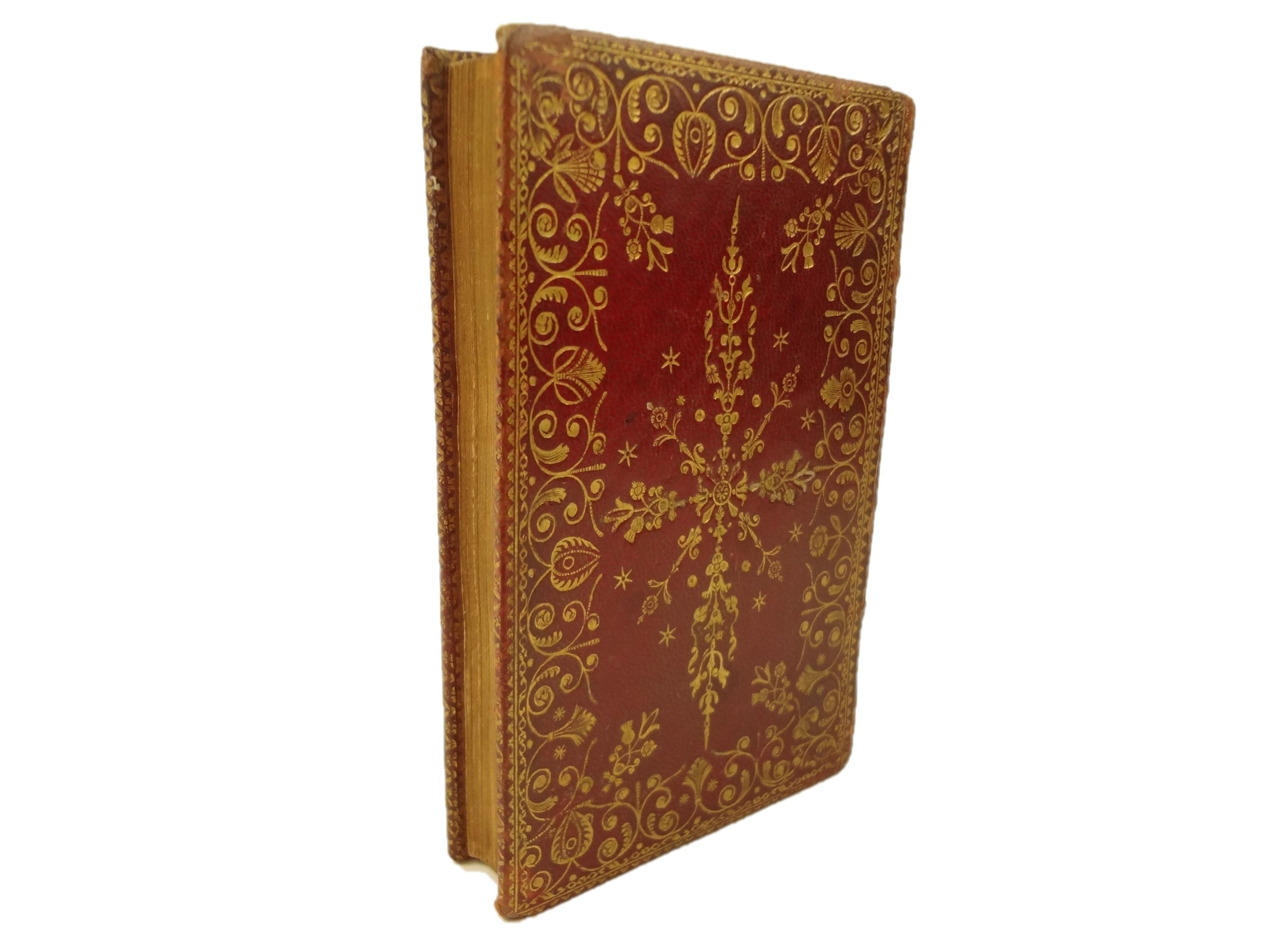 Measures approx. 14 x 9 x 2 cm. Red morocco binding the 18th century style. Gilt outer board frames include leaves, budding flowers, dentelle florets, etc.; central medallion is comprised of many tools and reminiscent of the Harleian diamond panels. Spine with four raised bands; four compartment with a selection of gilt tools including a sun and stars like motif, one compartment with "A.M. SHORTHAND" in gilt on black morocco. Marbled endpapers. One fold-out. Royal arms. Missing frontis illustration. Pages - (3 leaves), I-XXVI, 119 (1).
