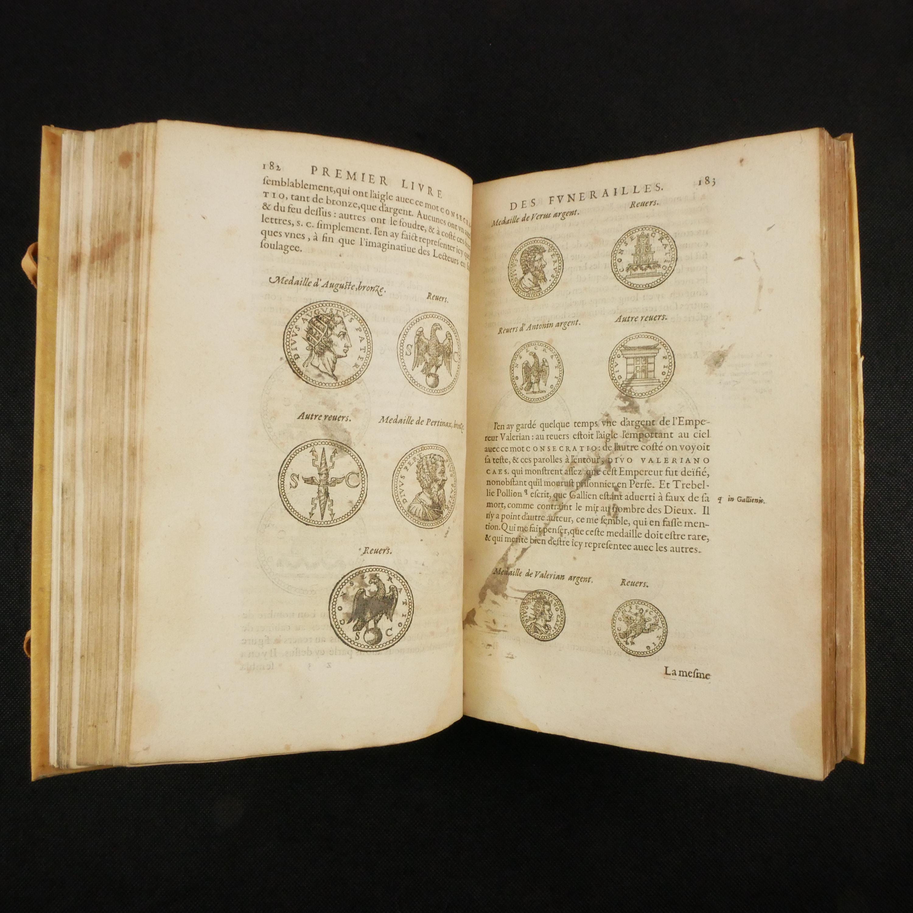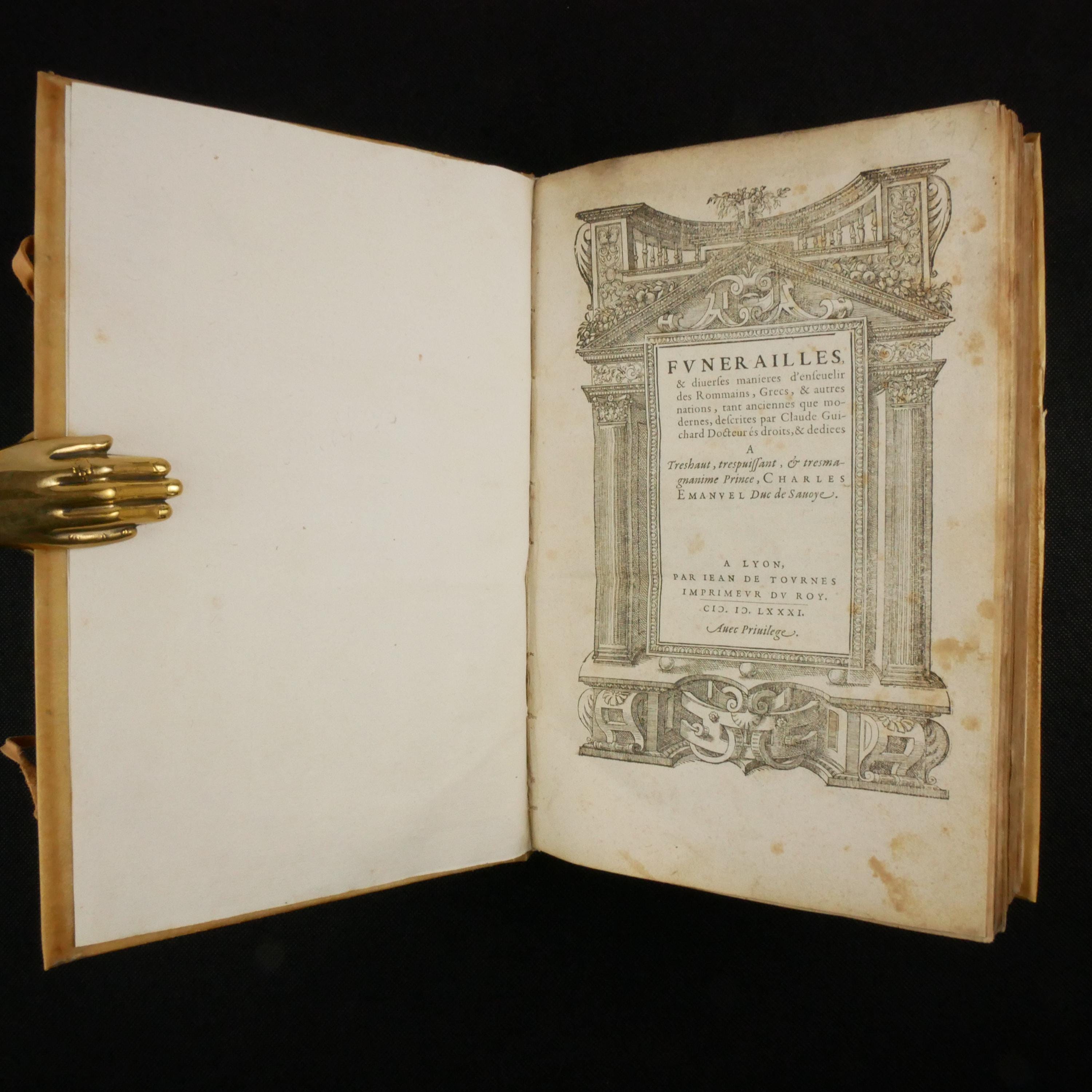 1581, first edition of Guichard's work on funeral rites, including a section on the practices of North Americans (considered a first appearance). This work is also lightly illustrated. Although expanded, Guichard built upon Livy's Treatise on the Funeral of the Ancients, at the request of the Duke of Savoy Charles-Emmanuel.