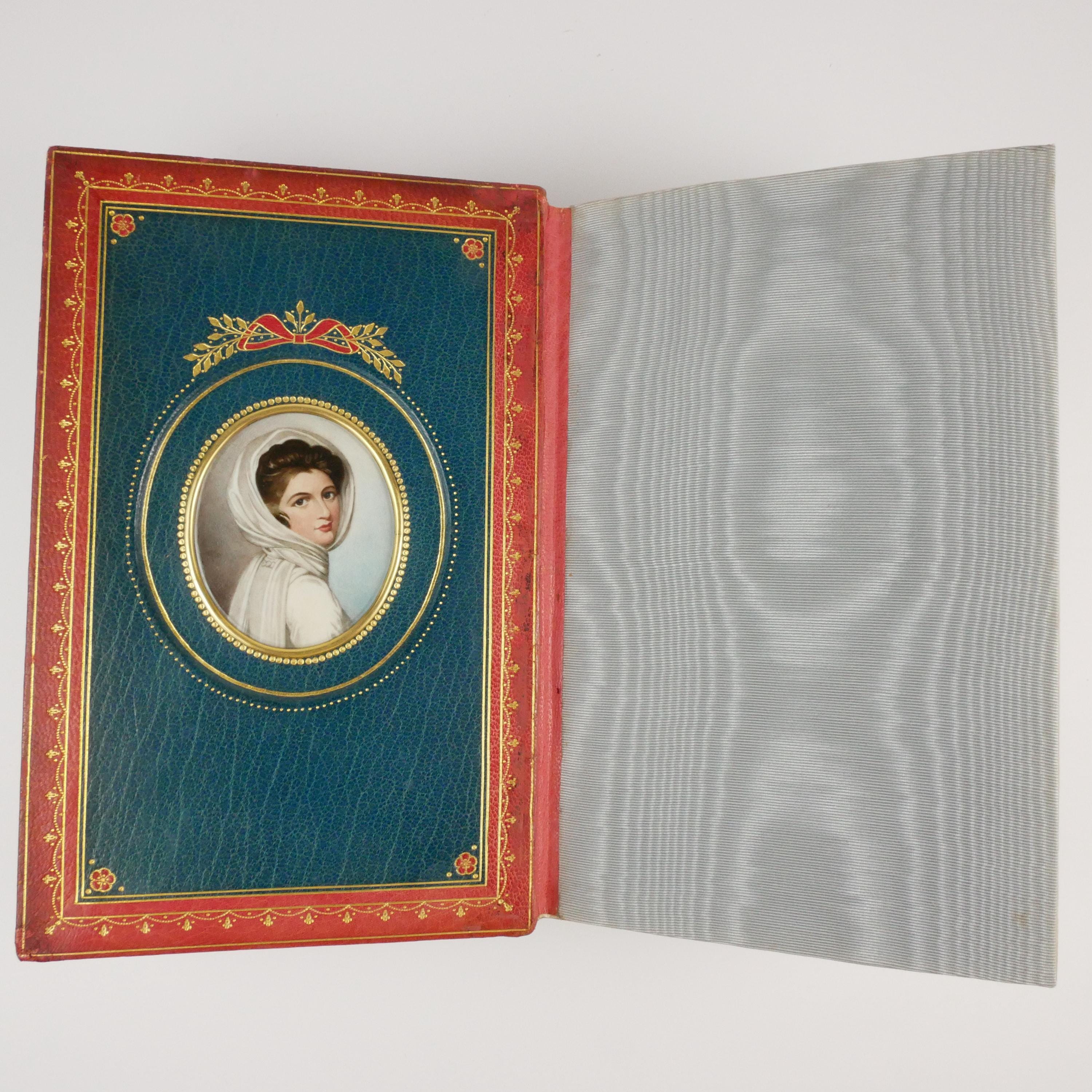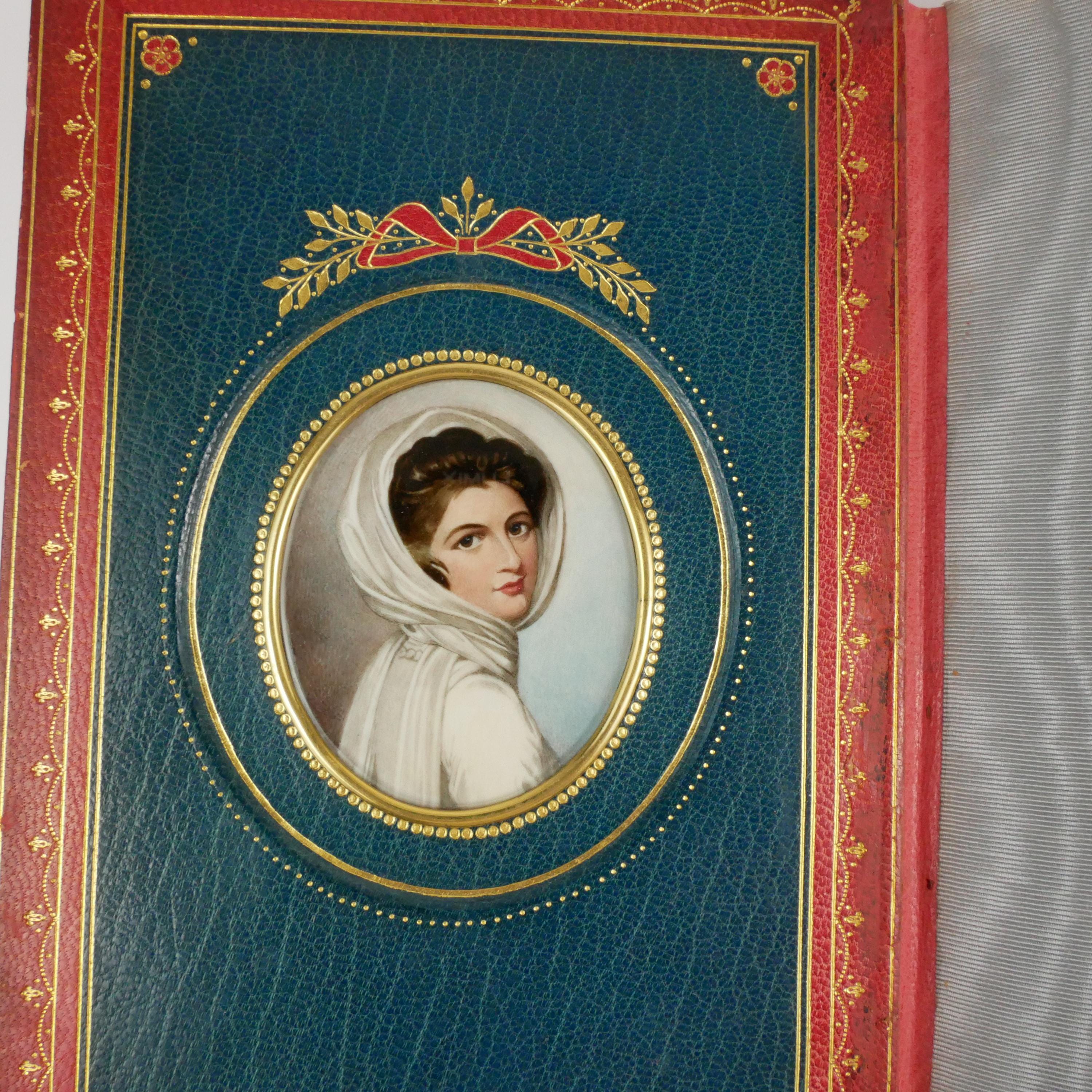Cosway-style book measures approx. 21 x 14 x 4.5 cm. It's rebacked and cornered. Leather binding. Boards with outer frames of gilt tooling, inner frames with florets surrounded by leaves in gilt, with the florets having blue morocco onlays. Central gilt medallion of leaves, with "E" monogram, and more onlay florets. Board edges with gilt fillets. Spine with five raised bands; four compartments with a central floret onlay and two with the title and author in gilt. All edges gilt. Inner boards with doublures of blue morocco and corner florets with onlays. Turn-ins and hinge with a roll of flowing pointille in gilt. Miniature of Lady Hamilton crowned by wreath with red onlay bow and circular frame of gilt and medal (inner). Flyleaves of silk. Rear board with no miniature, but the stamp of Sangorski and Sutcliffe at bottom of doublure. Hinges repaired. Book is well-illustrated.