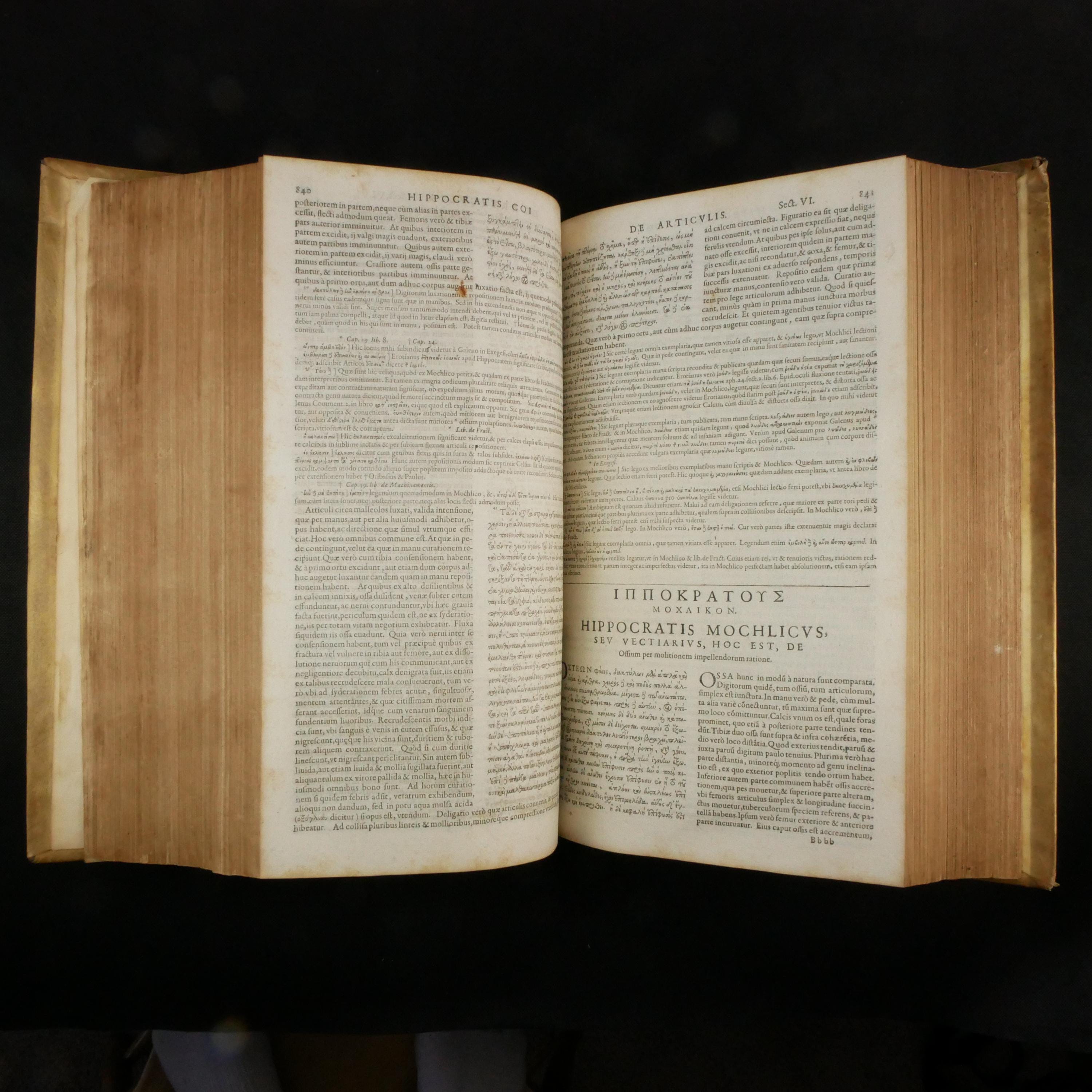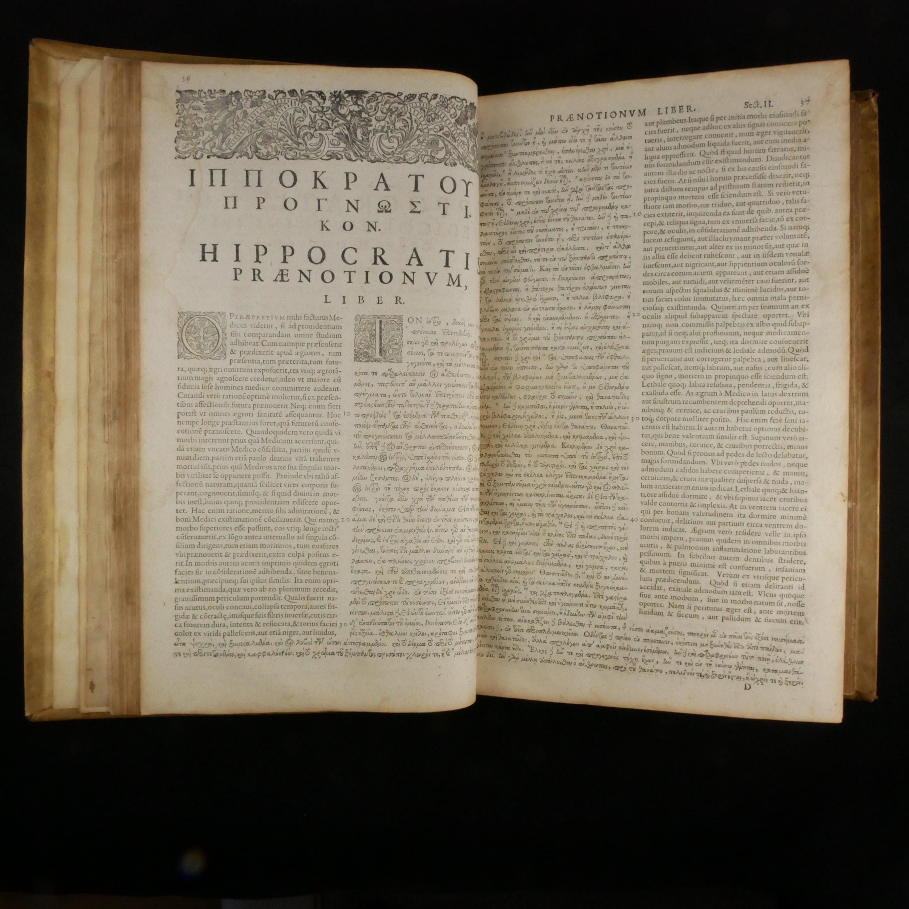 Two expansive works of Hippocrates, in parallel Latin and Greek, in large imposing folio format, bound in a handsome binding with a coat-of-arms applied to the boards.