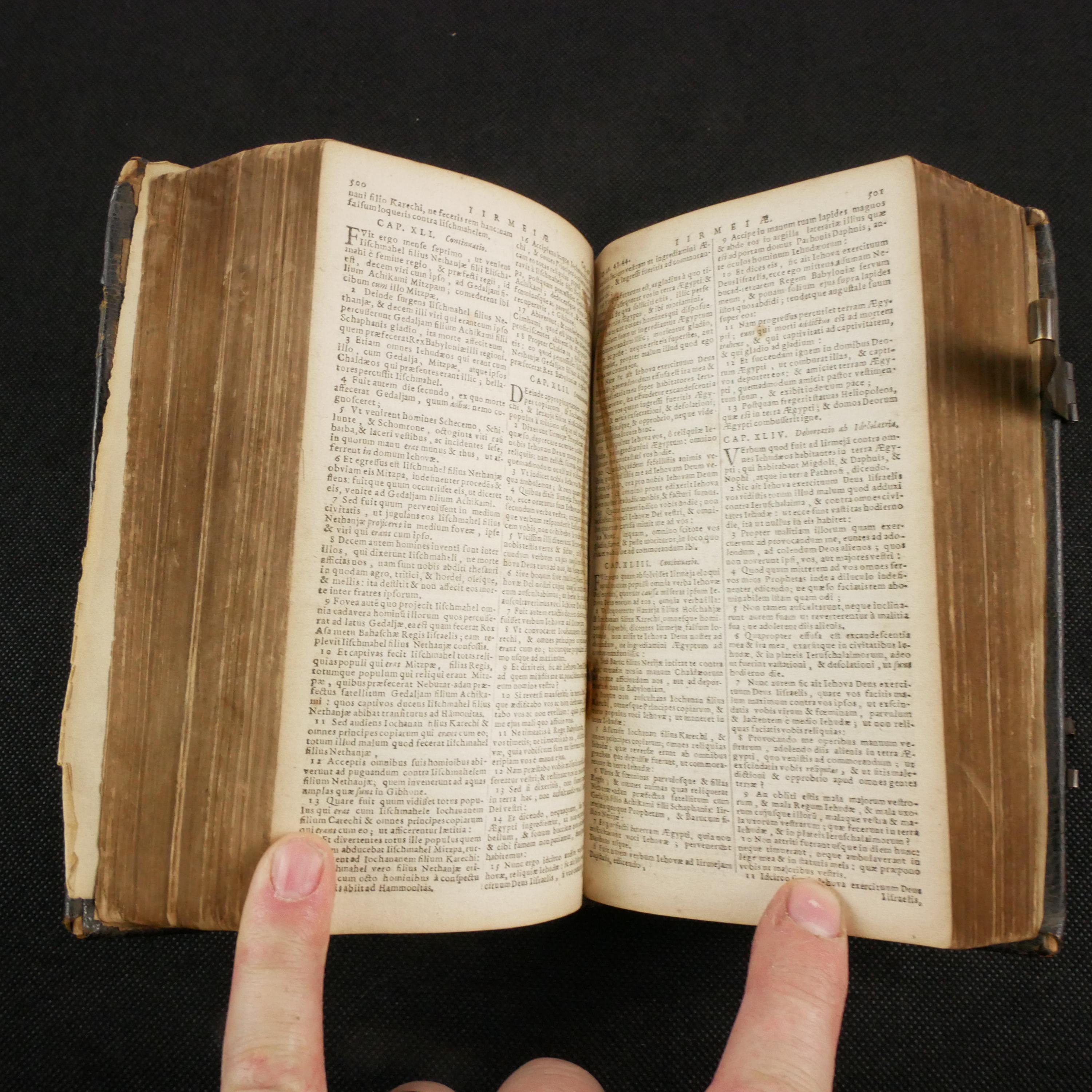 1633 Biblia Sacra (Vetus et Novum) and at the rear is bound the 1637 Whole Booke of Psalmes printed by George Miller in London. In a handsome black leather and gilt binding, with one clasp still working.