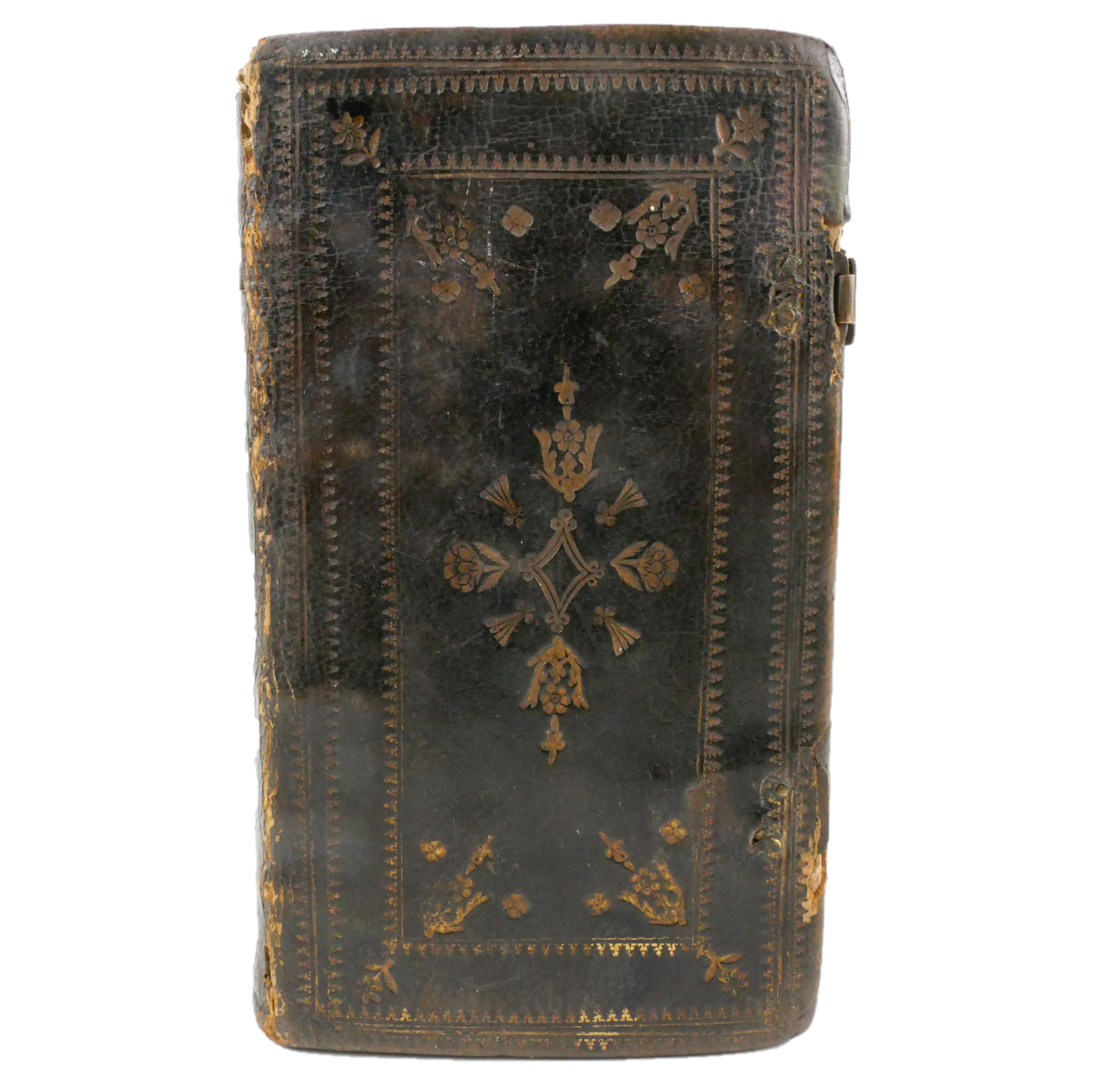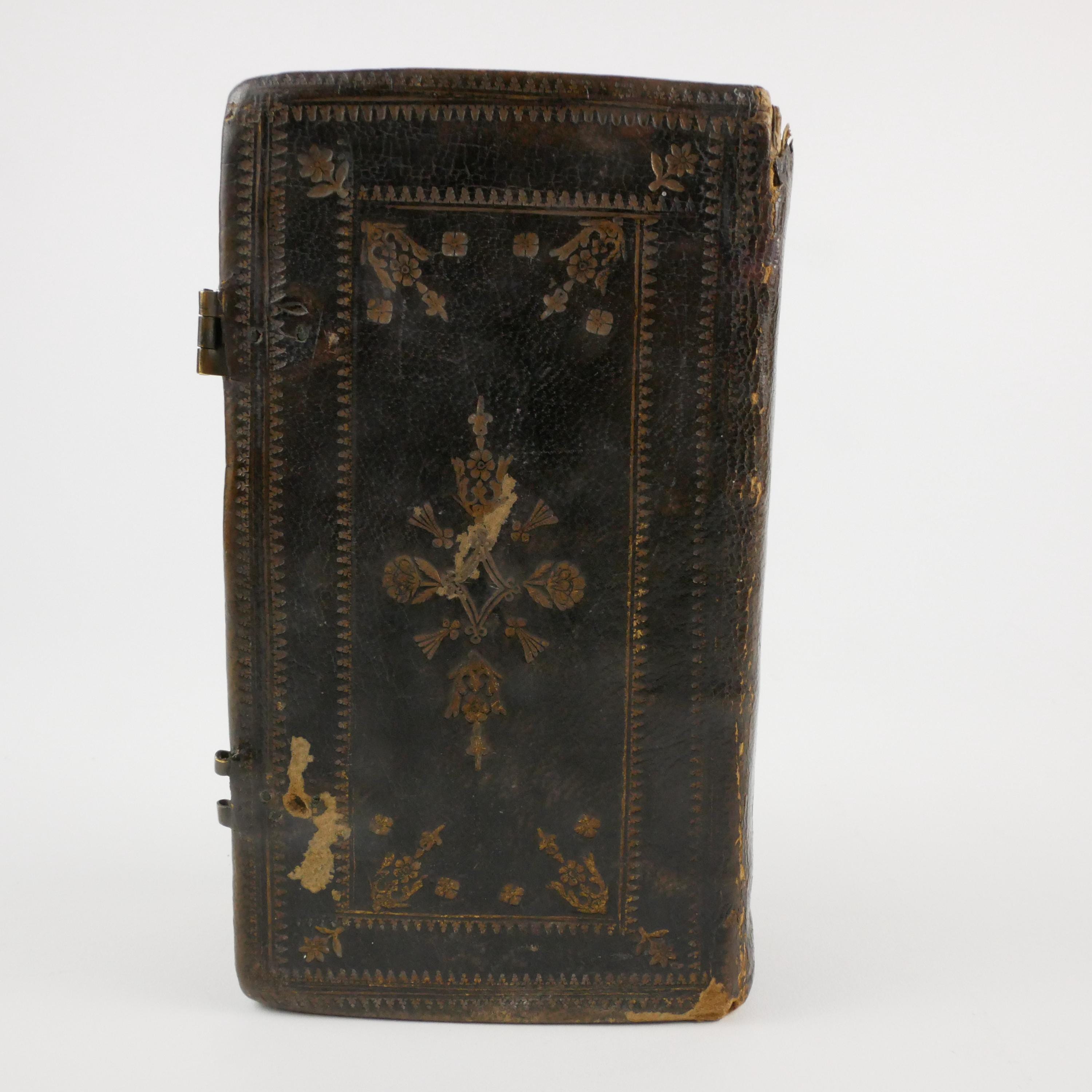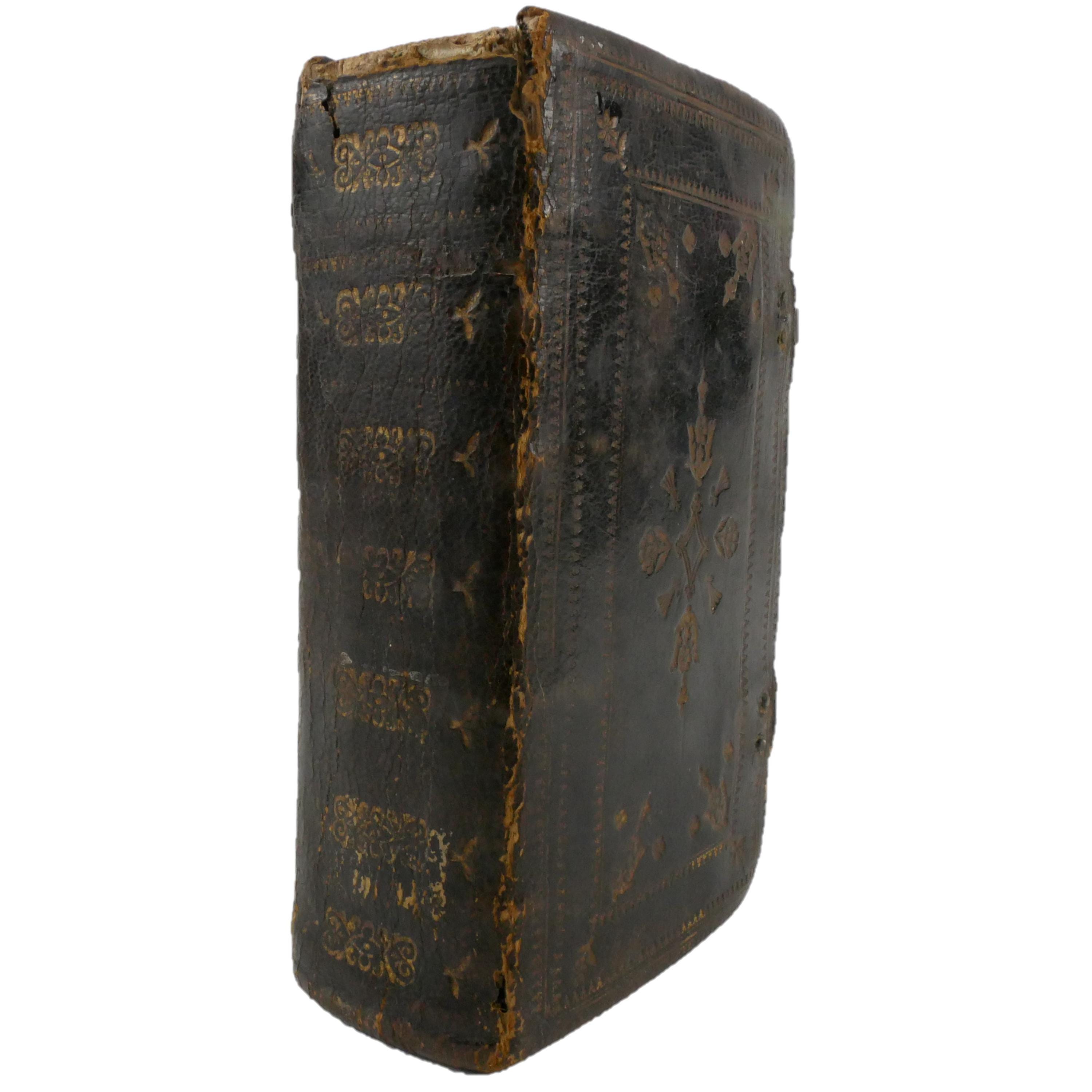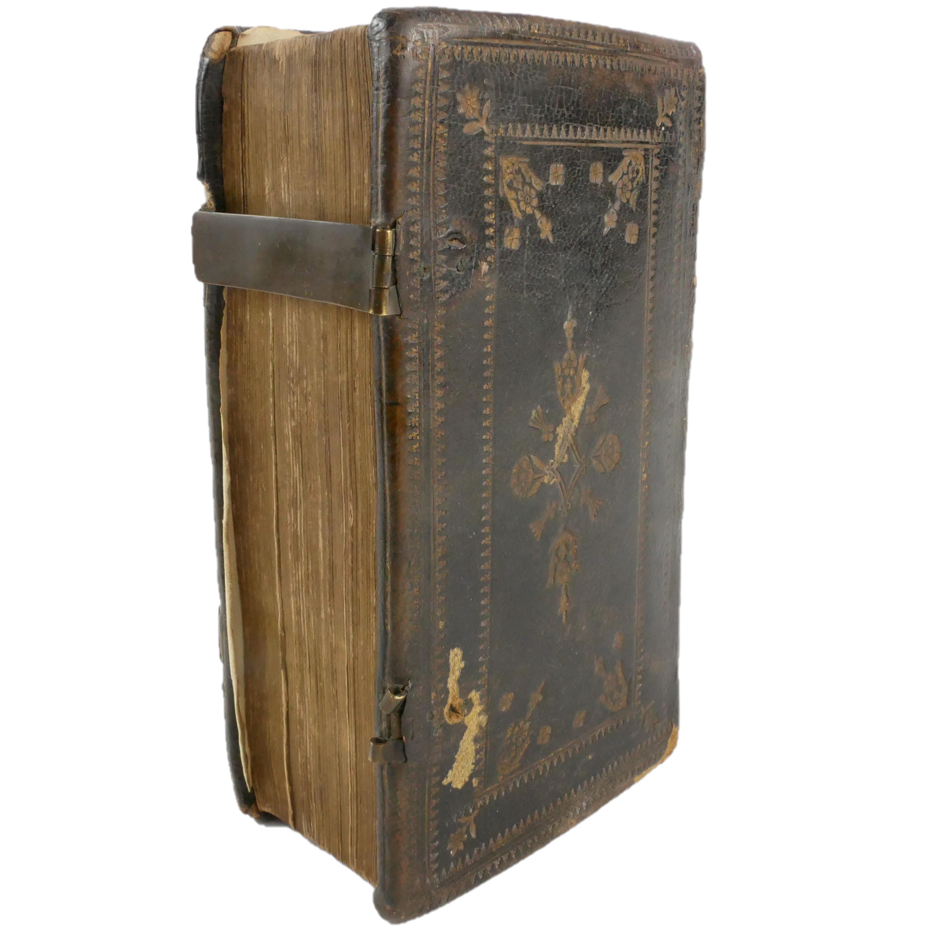 See pictures. Binding worn, with one clasp missing, cracks along joint, edge and corner wear, top of spine chipped, and a few a small worm holes; gilt a little faded. Separation at gutter between text block and binder endpapers. Text block toned throughout, with occasional fox spots, thumbing, dog-eared/chipped corner, page edge tear, candle ember mark, etc. Page 125 with a 3" tear from fore-edge.