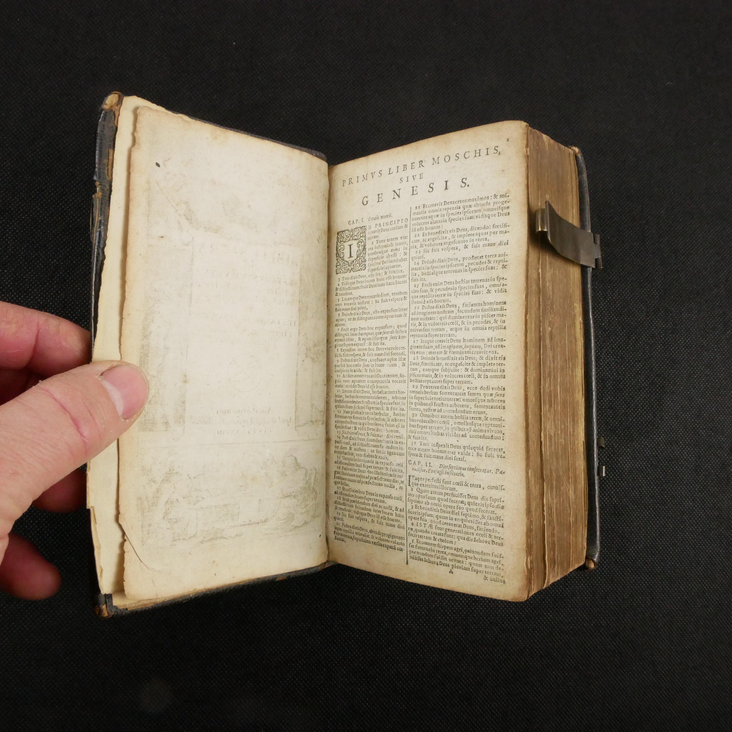 Measures approx. 15.5 x 9 x 5.5 cm. Black leather binding. Boards with an outer gilt frame, and an inner with corner florets; florets surround a central diamond. Spine with a repeating gilt stamp, faded. All edges faded gilt. Title page with an inhabited frame to the Biblia. Decorative frame to the Psalmes title page.