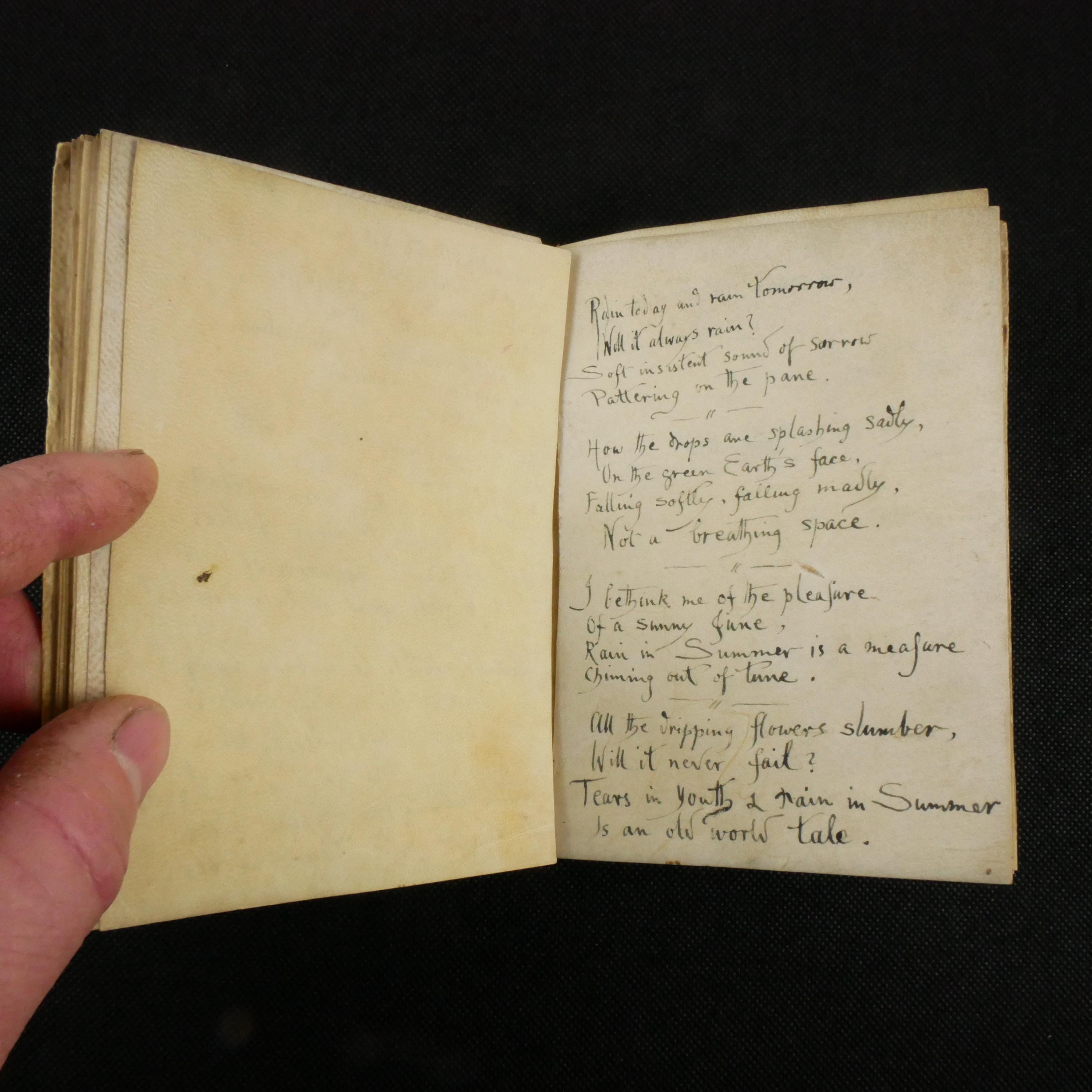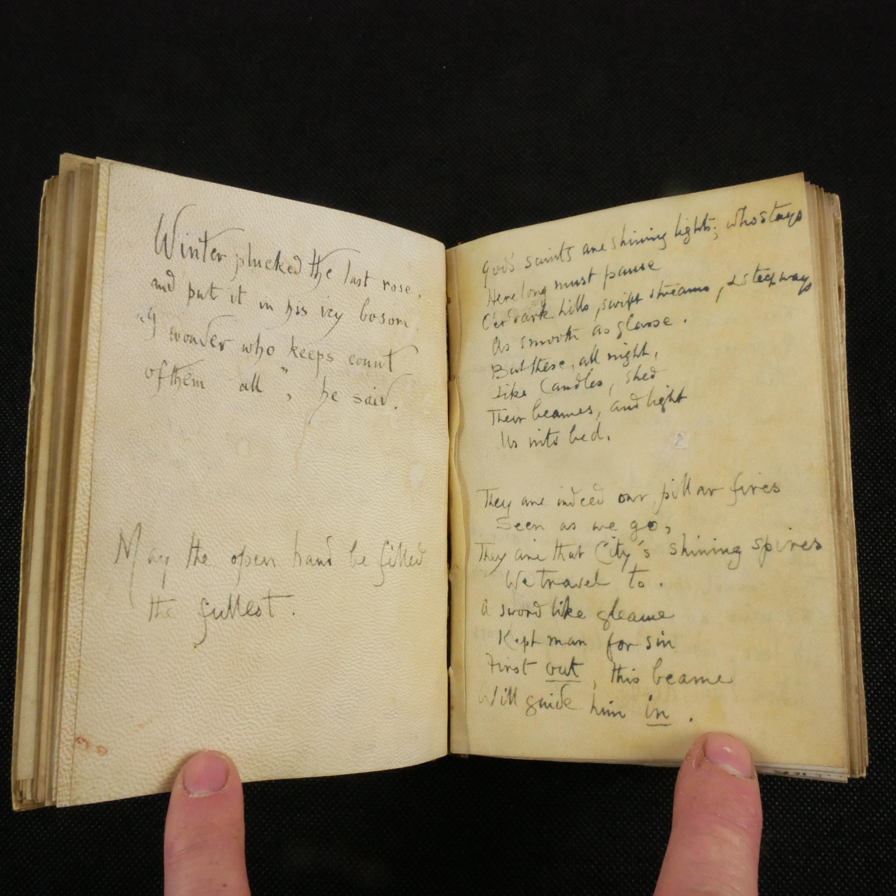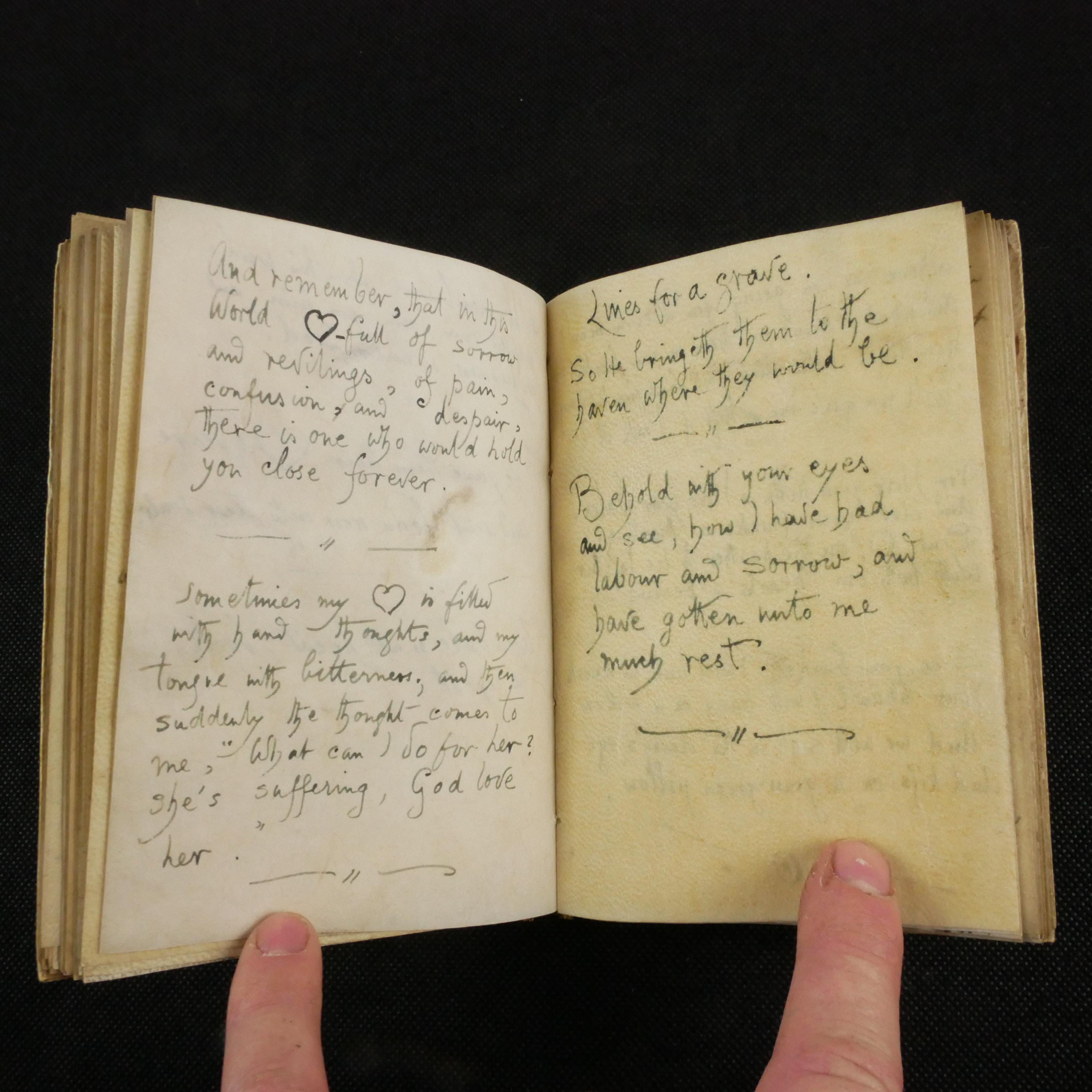 A wide swath of literary quotes reside within the book, as well as many (likely) original poetic works. Predominately, there is a theme of loss. This notebook may have been kept as a coping tool.