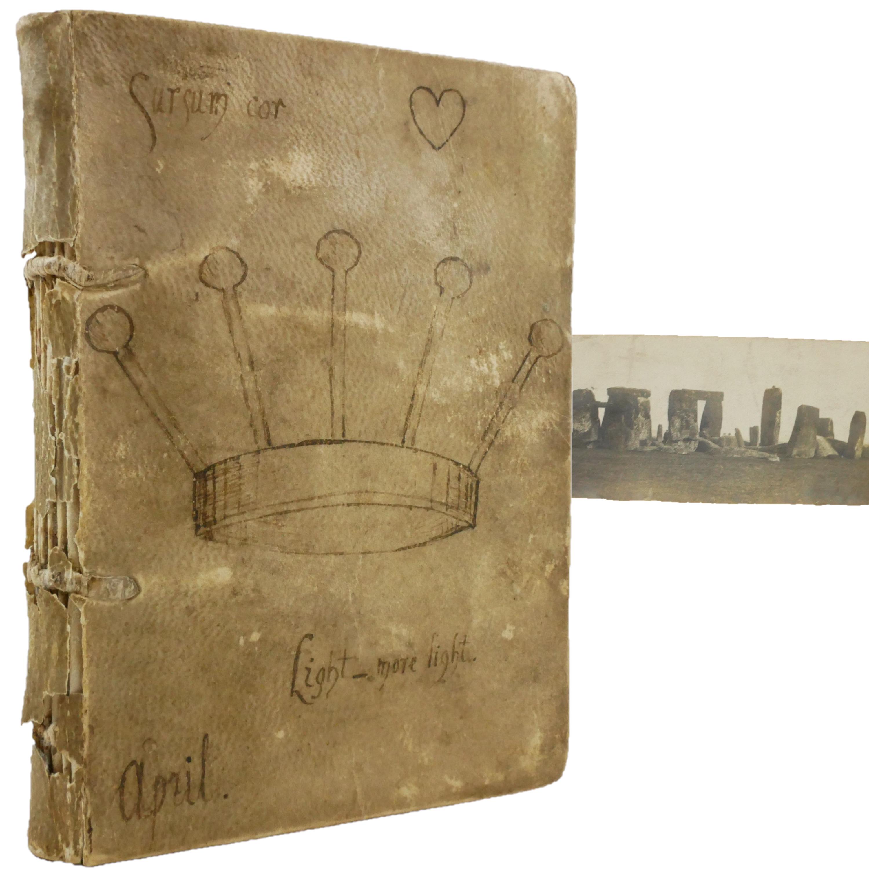 A 19th century manuscript on vellum (the entire text block is vellum, not just the binding) commonplace book, written by a highly educated and mournful author. The crown on the front cover might indicate the author's heraldry (an entirely vellum notebook was a very expensive and rare choice).