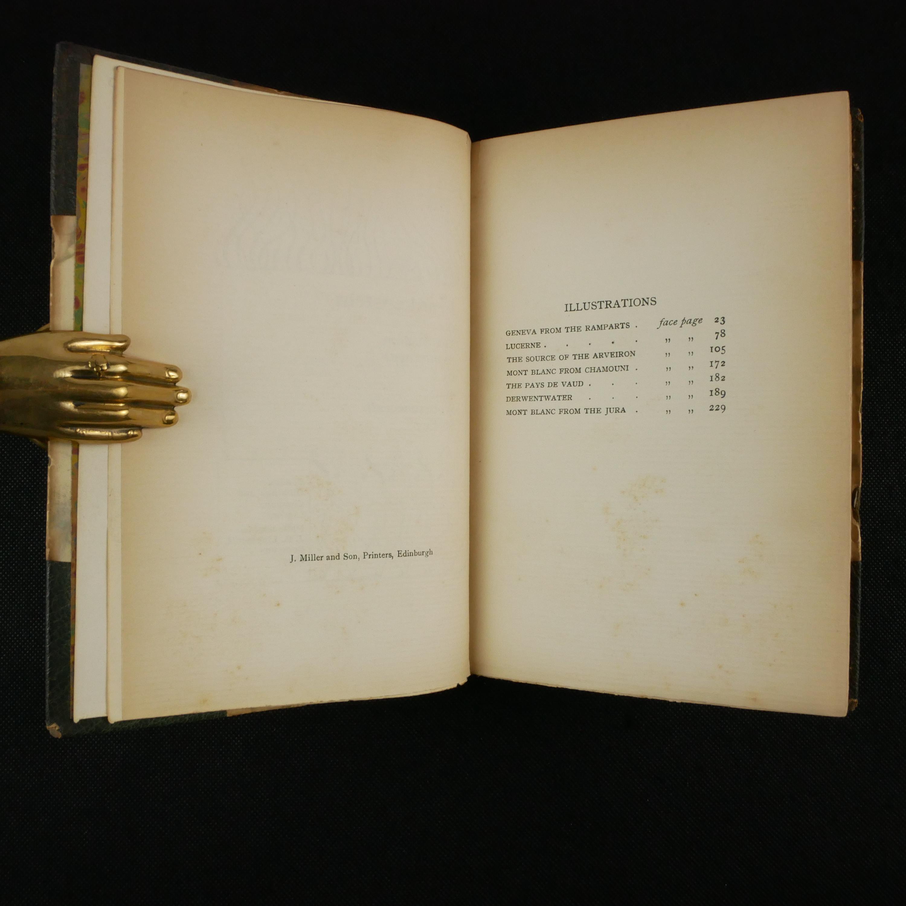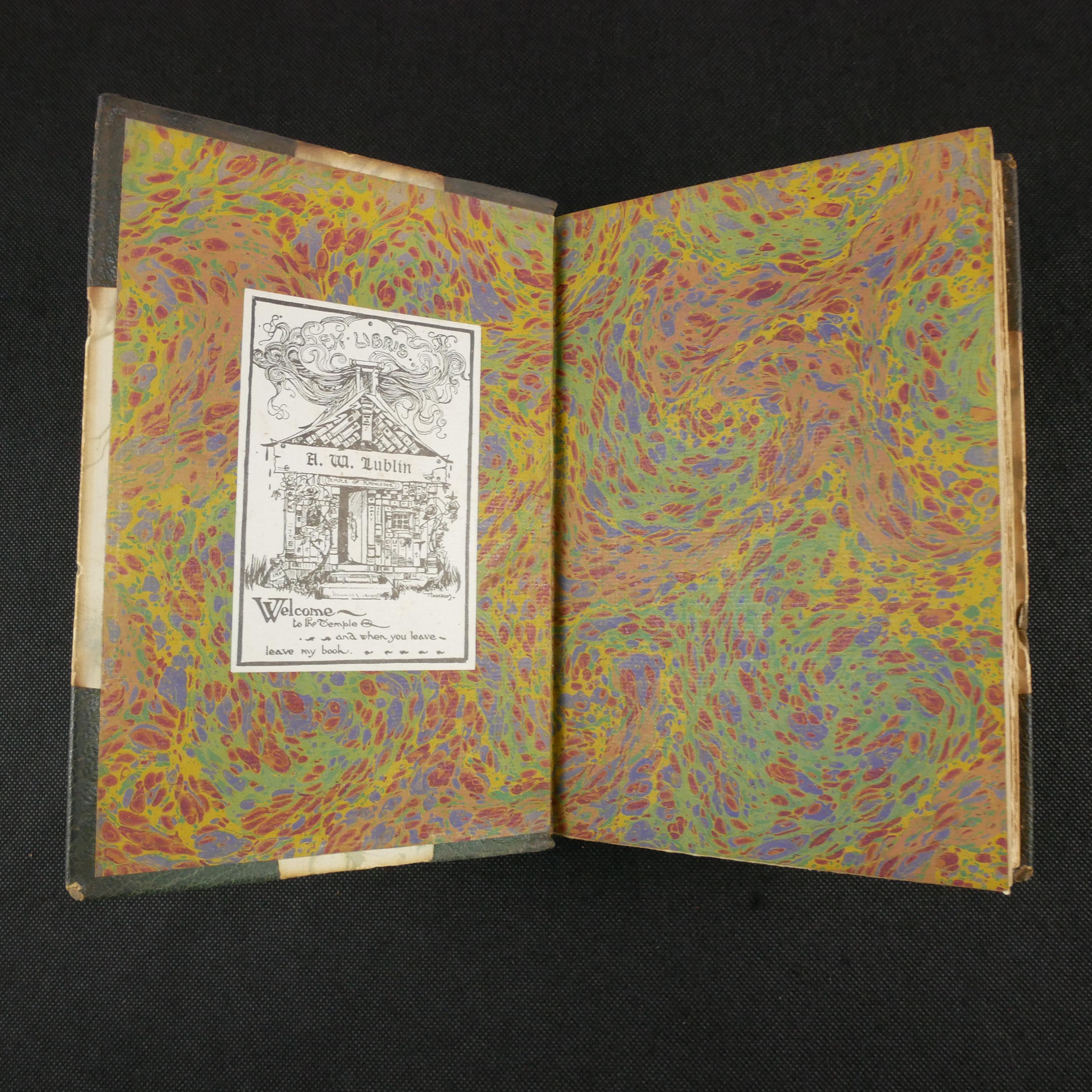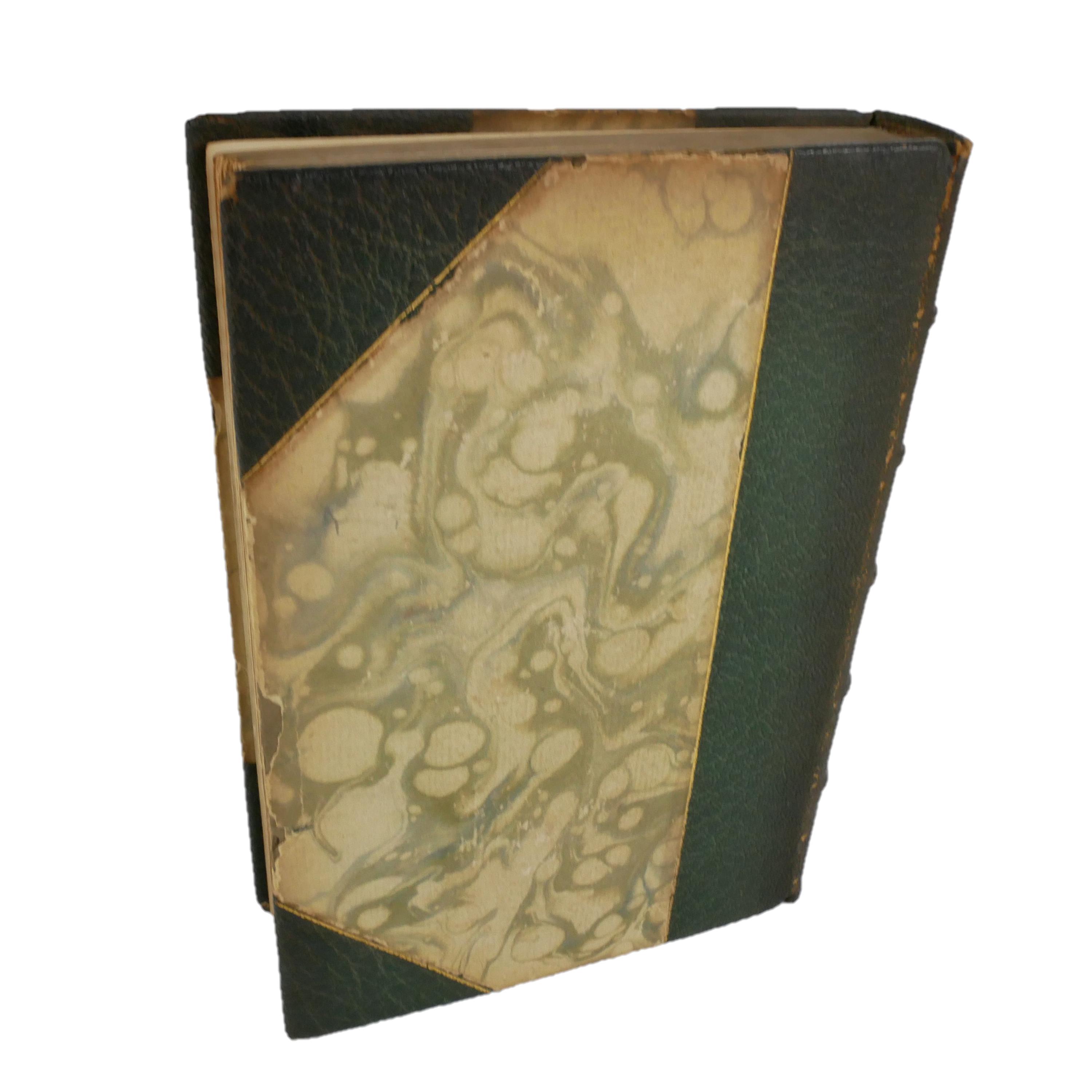 Measures approx. 19 x 13 x 2.5 cm. Gatherings eight. Leather spine and corners with marbled paper covering the boards. Spine with five raised bands; four compartments with a central flower, two compartments with the title and author in gilt. Bottom of spine calls out London printing and date in gilt. Top edge gilt (but dusty). Marbled endpapers. Title page with an illustration in the Art Nouveau style. Seven plates of illustration inserted into the text block.