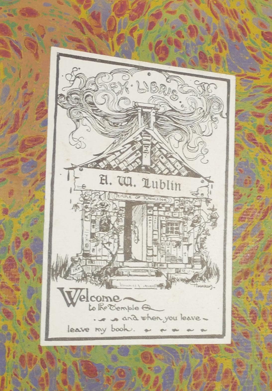Ex libris plate of Alfred W. Lublin. An interesting bibliophile, somewhat easy to trace due to his unique name. He attended the Massachusetts Agricultural College Club of New York, and in 1903 made statements that at their 18th re-union (The College Signal) stating that college was important even if you didn't become a farmer. He went to work as a treasurer at Kora Co., a female clothes manufacturer in NY (The Trow, 1906) and he held a patent on a women's "dress-stay" dated August 3, 1897. His bookplate has been found in other books including a Rupert of Hentzau, with an inscription from the author; sold by Lycanthia Rare Books. PBA also sold a Swinerton Nocturne (lot 313, April 16 2009) with his ex libris. He is found in several correspondences with authors, including one with James Branch Cabell (held at the University of Virginia) and one where Booth Tarkington addressed an envelope to him, and one from Susanah Tarkington (Listing of Contents, Booth Tarkington, Princeton collection). Later in his career we find him an advertiser (Advertising and Selling for 1922) and given a cease and desist in 1937 for selling "misrepresentation as to a treatment for superfluous hair" (Trade Regulation Reporter, V3, 1932).