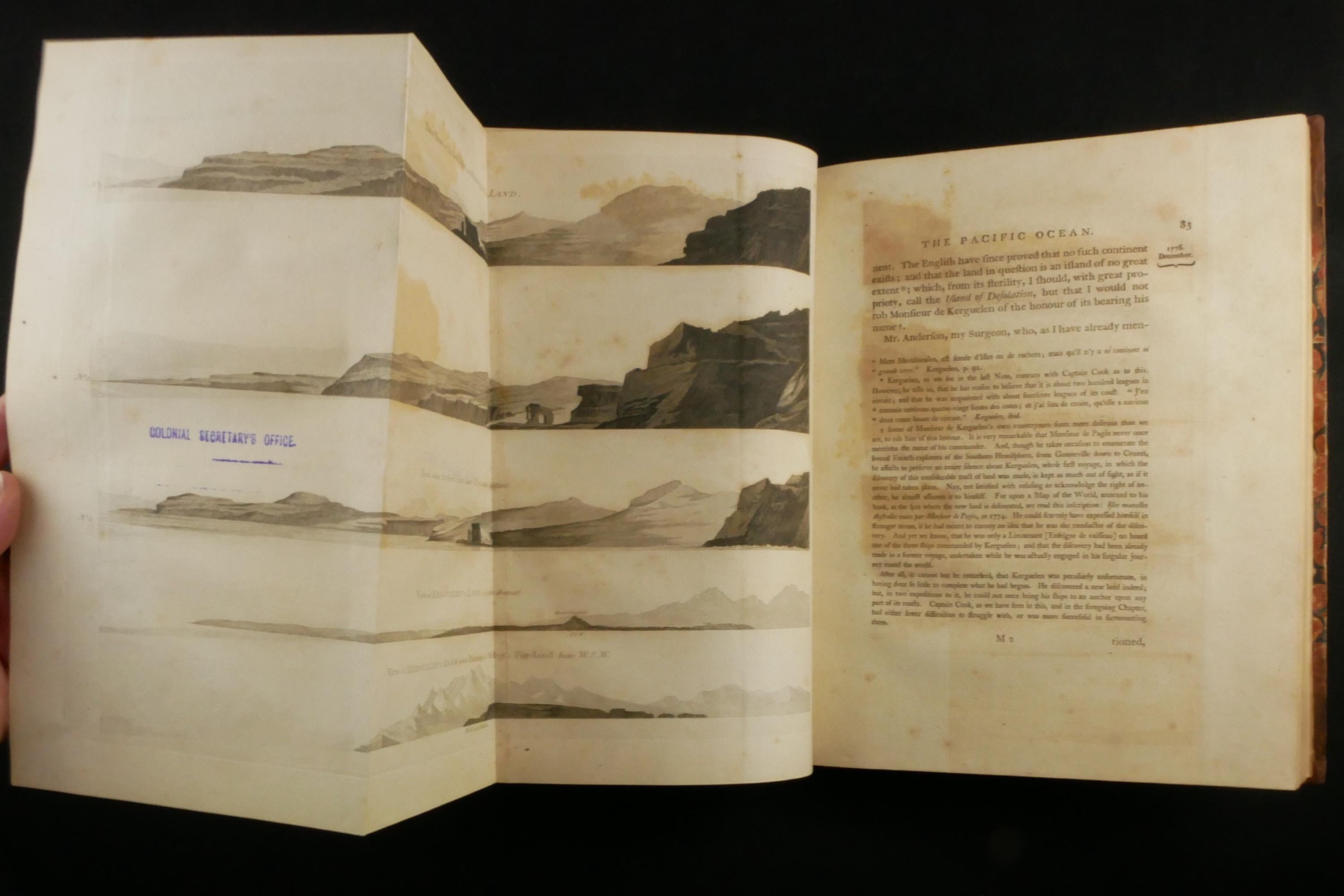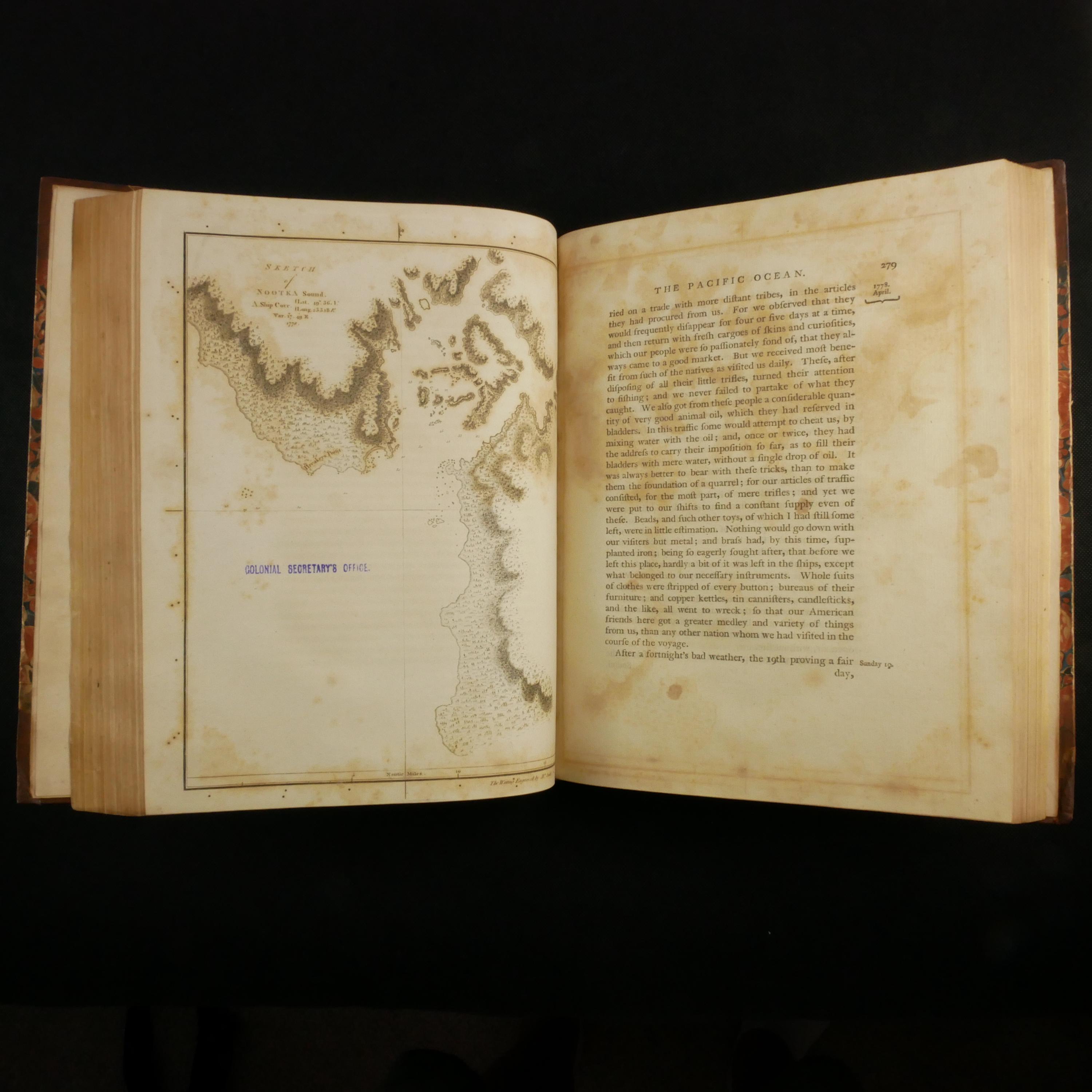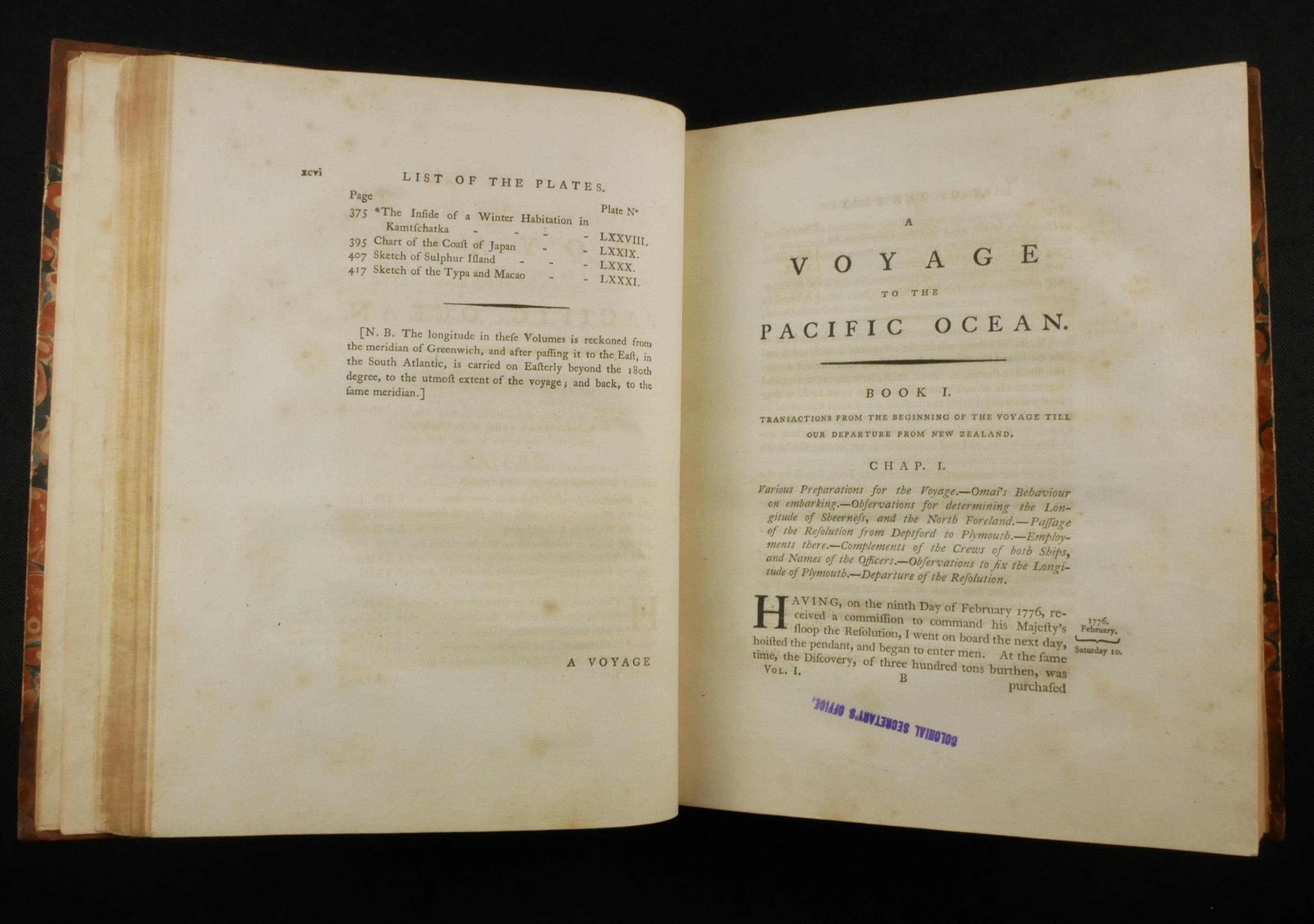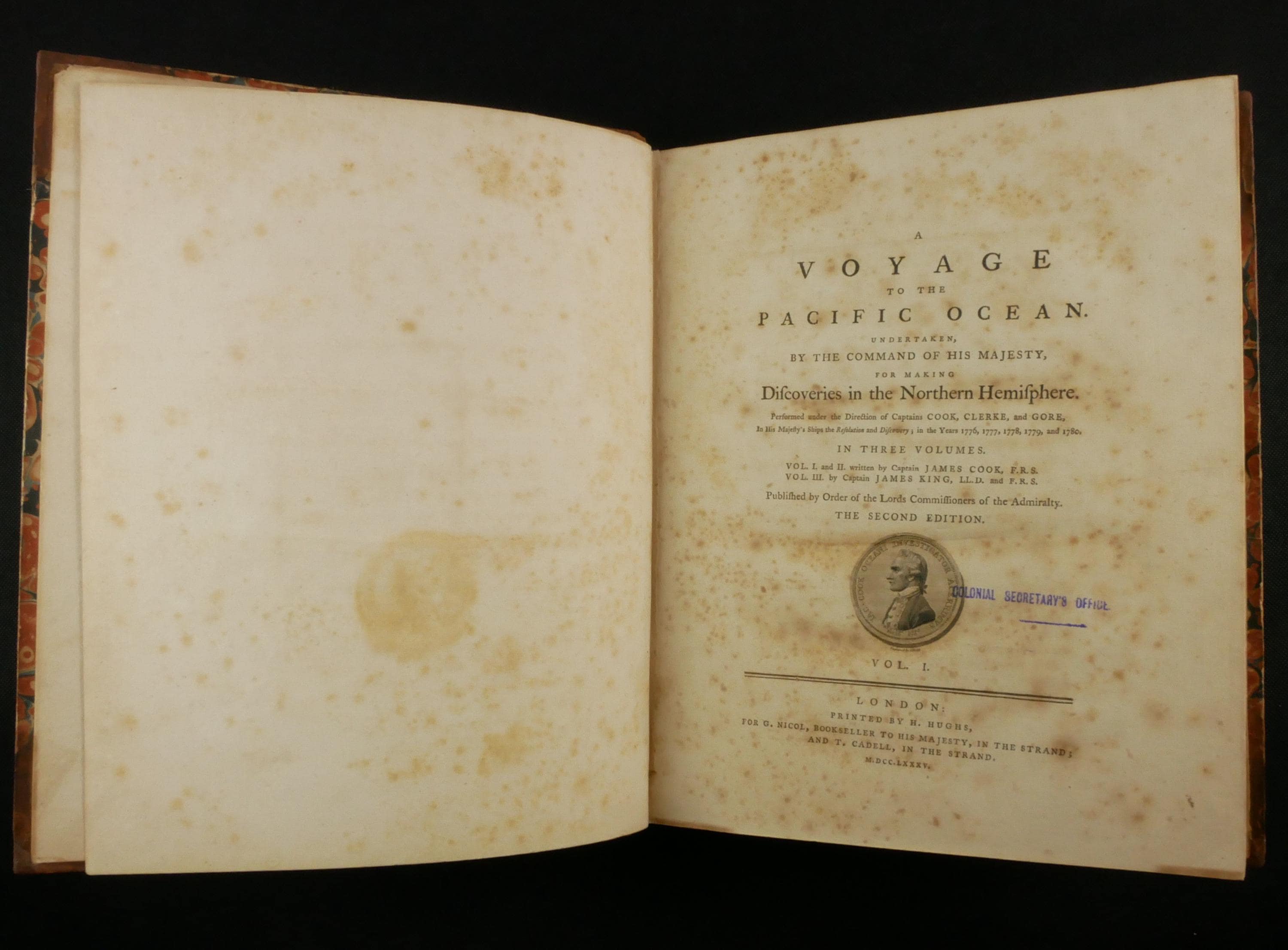This second edition (1785) set of Captain Cook and King's A Voyage to the Pacific Ocean... bears fascinating provenance. The ex libris plate is that of William Seymour Blackstone, the grandson of the Blackstone of the law commentaries. At the bottom of the pastedowns are the bookseller tickets of Angus and Robertson at 112 Market Street Sydney, a location they inhabited until 1895 (Wikipedia). Then, throughout the volumes are the stamps of "Colonial Secretary's Office" and the FEPs all have a note, "This book was one of a Collection associated with the name of Sir Henry Parkes, and housed in the Chief Secretary's Department of New South Wales until 1956".
