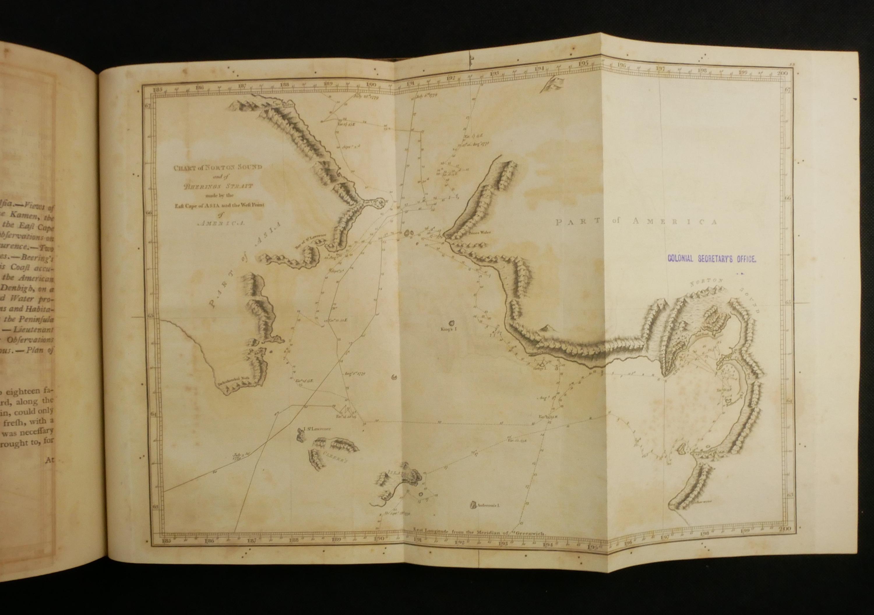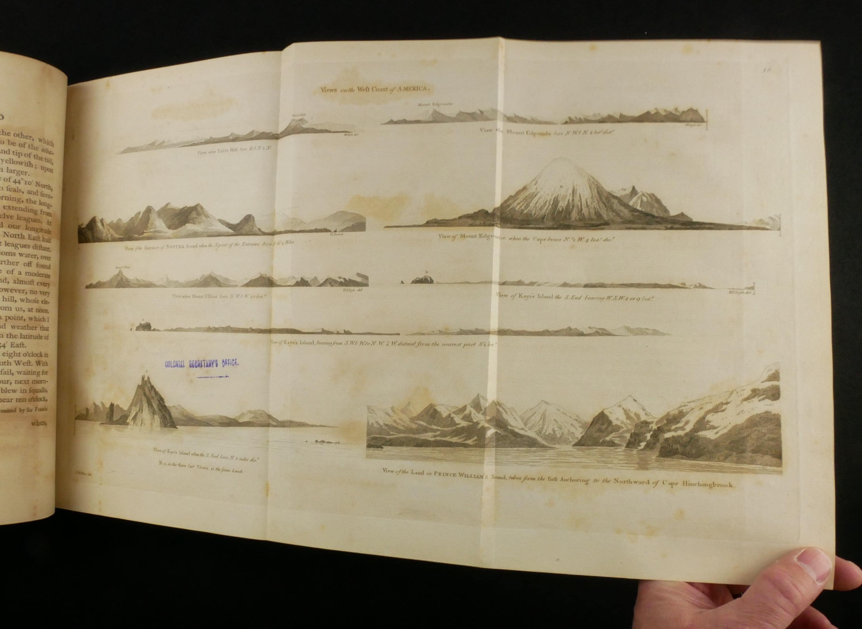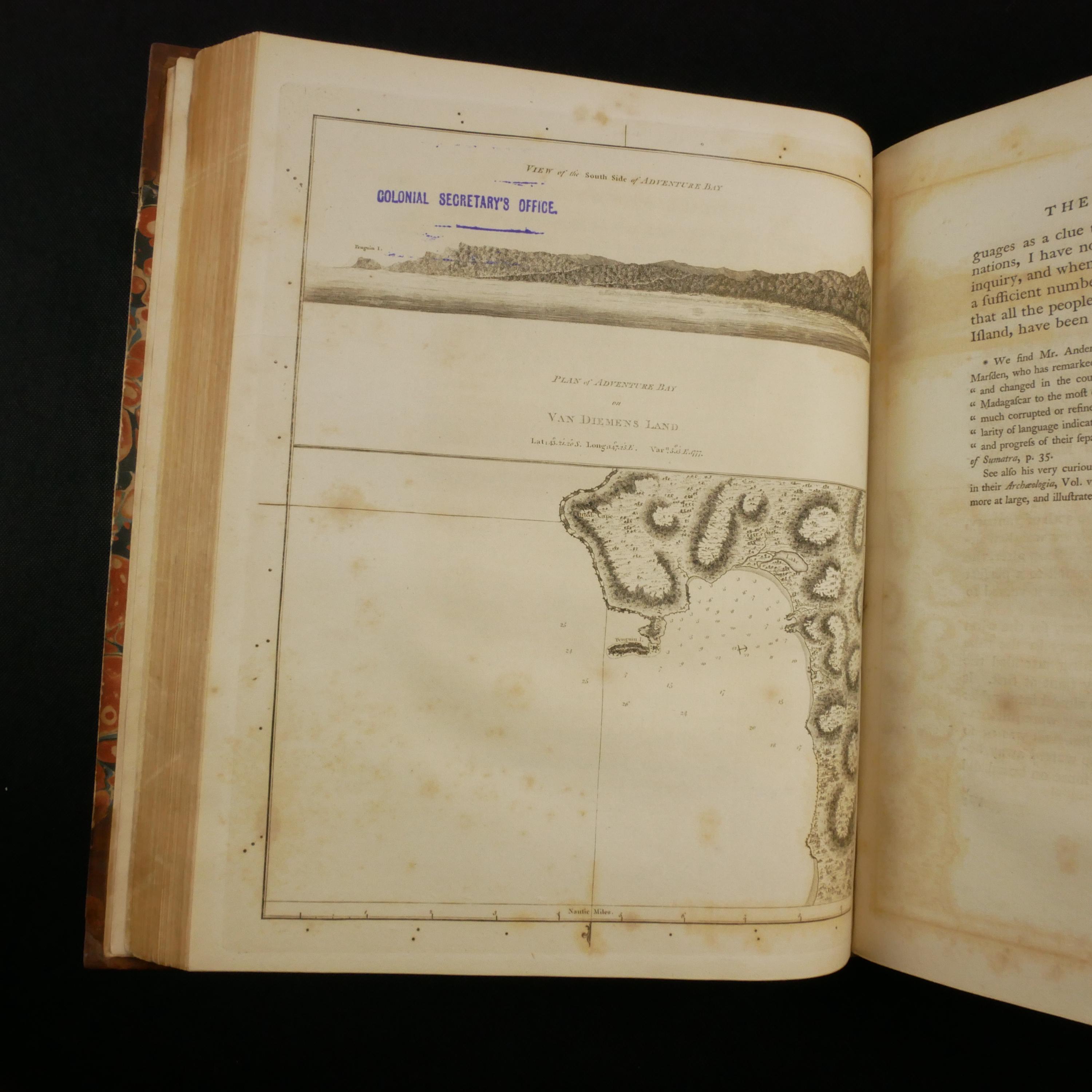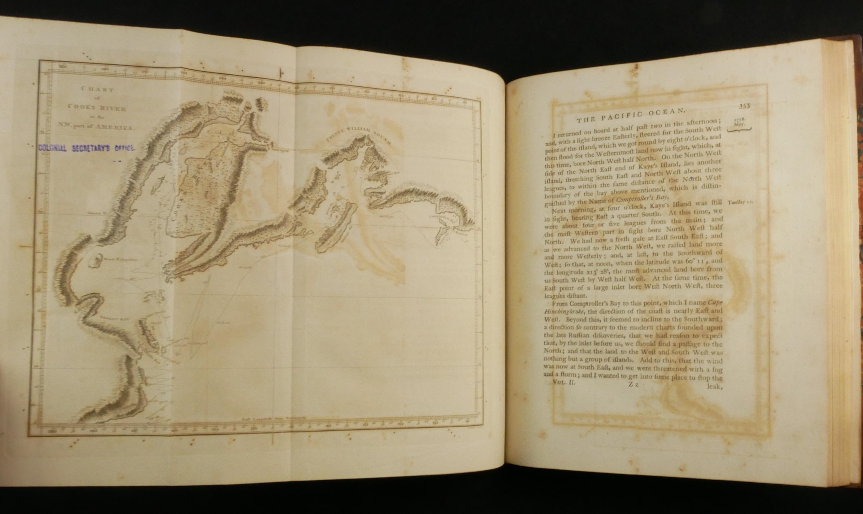 This second edition (1785) set of Captain Cook and King's A Voyage to the Pacific Ocean... bears fascinating provenance. The ex libris plate is that of William Seymour Blackstone, the grandson of the Blackstone of the law commentaries. At the bottom of the pastedowns are the bookseller tickets of Angus and Robertson at 112 Market Street Sydney, a location they inhabited until 1895 (Wikipedia). Then, throughout the volumes are the stamps of "Colonial Secretary's Office" and the FEPs all have a note, "This book was one of a Collection associated with the name of Sir Henry Parkes, and housed in the Chief Secretary's Department of New South Wales until 1956".