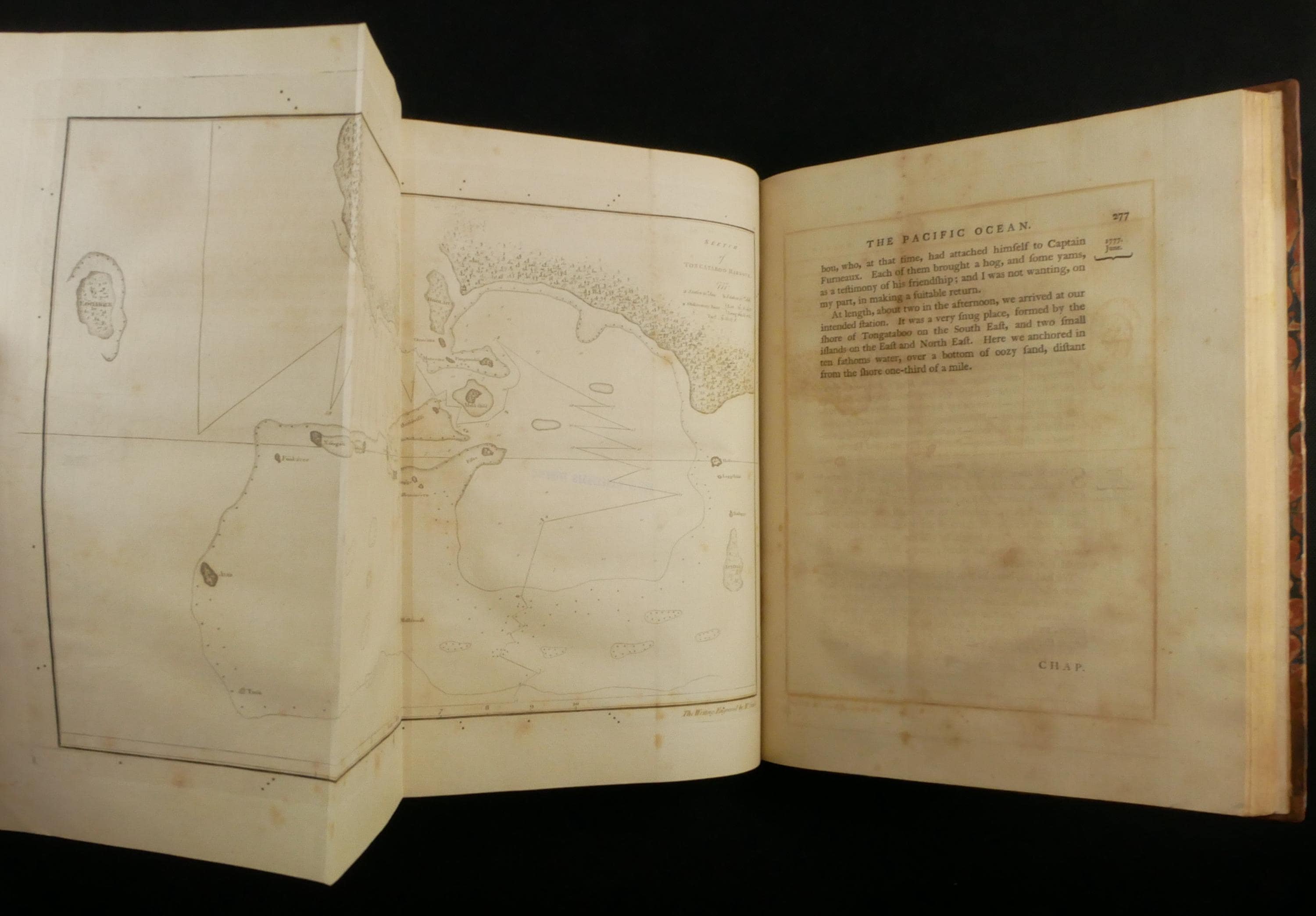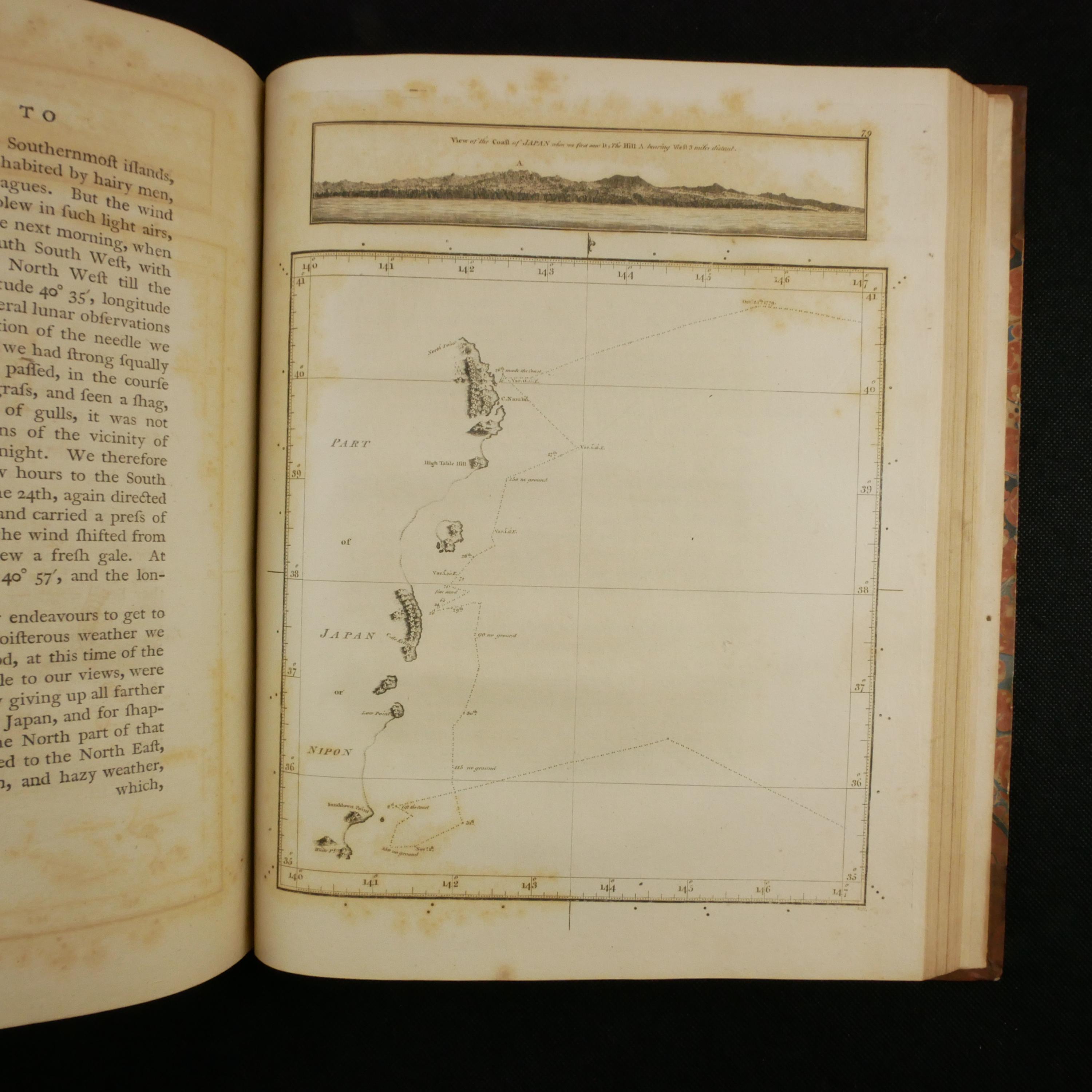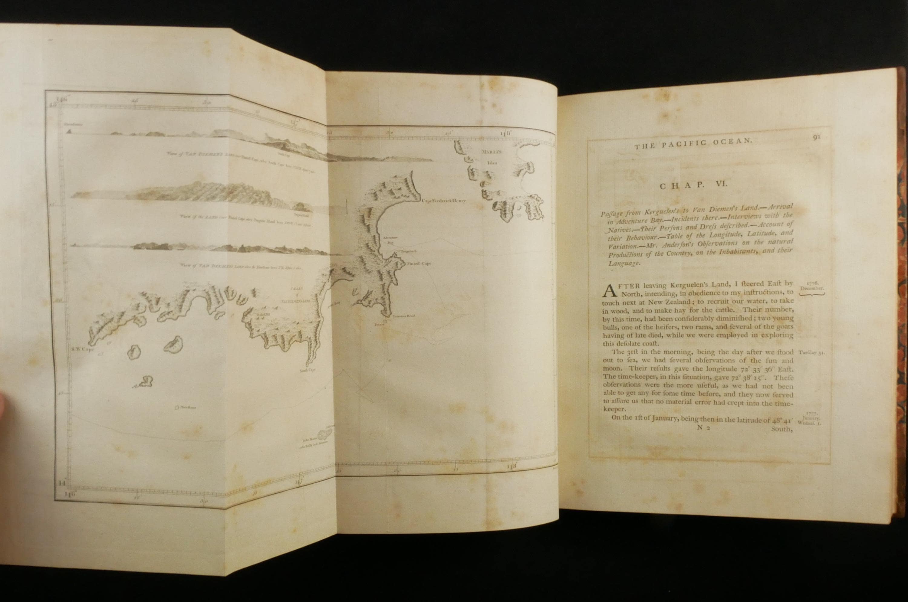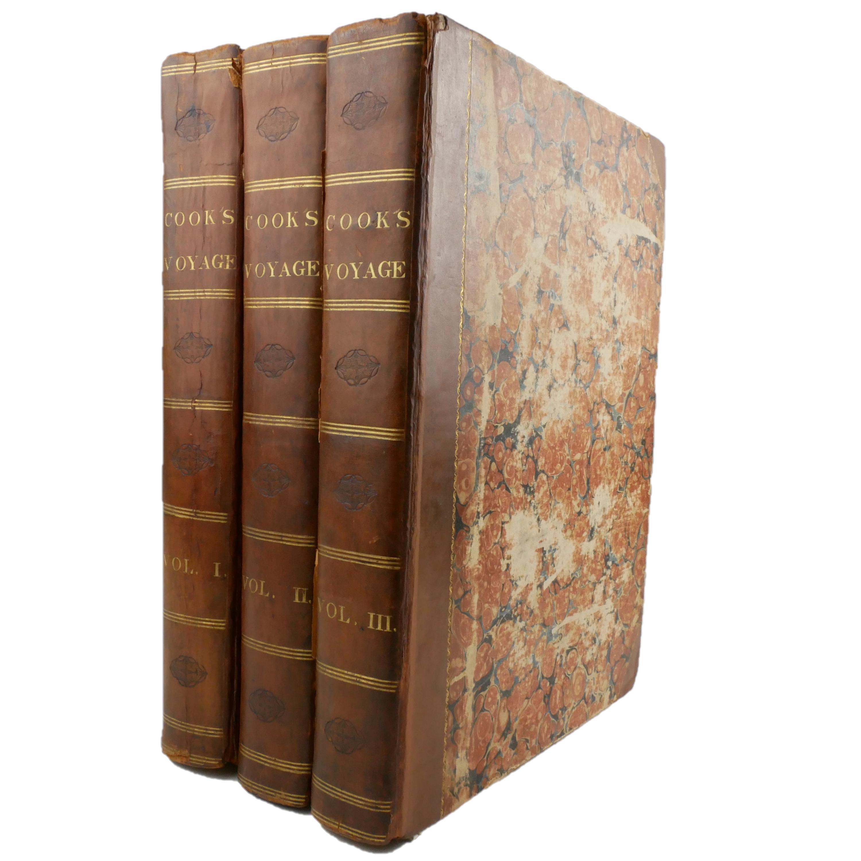 Each vol. measures approx. 30 x 24 x 4 cm. Leather spines and corners, with marbled paper covered boards. Spines with six compartments separated by gilt fillets; four compartments with central florets in blind, two compartments with "Cook's Voyages and the Vol in gilt. Illustrated (but only with the non-folio illustrations).
