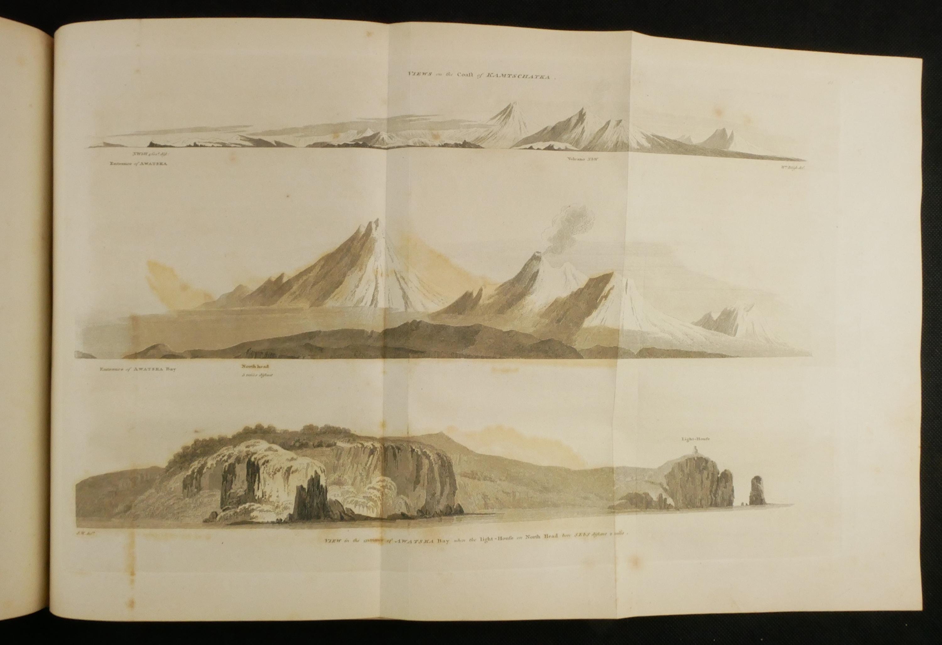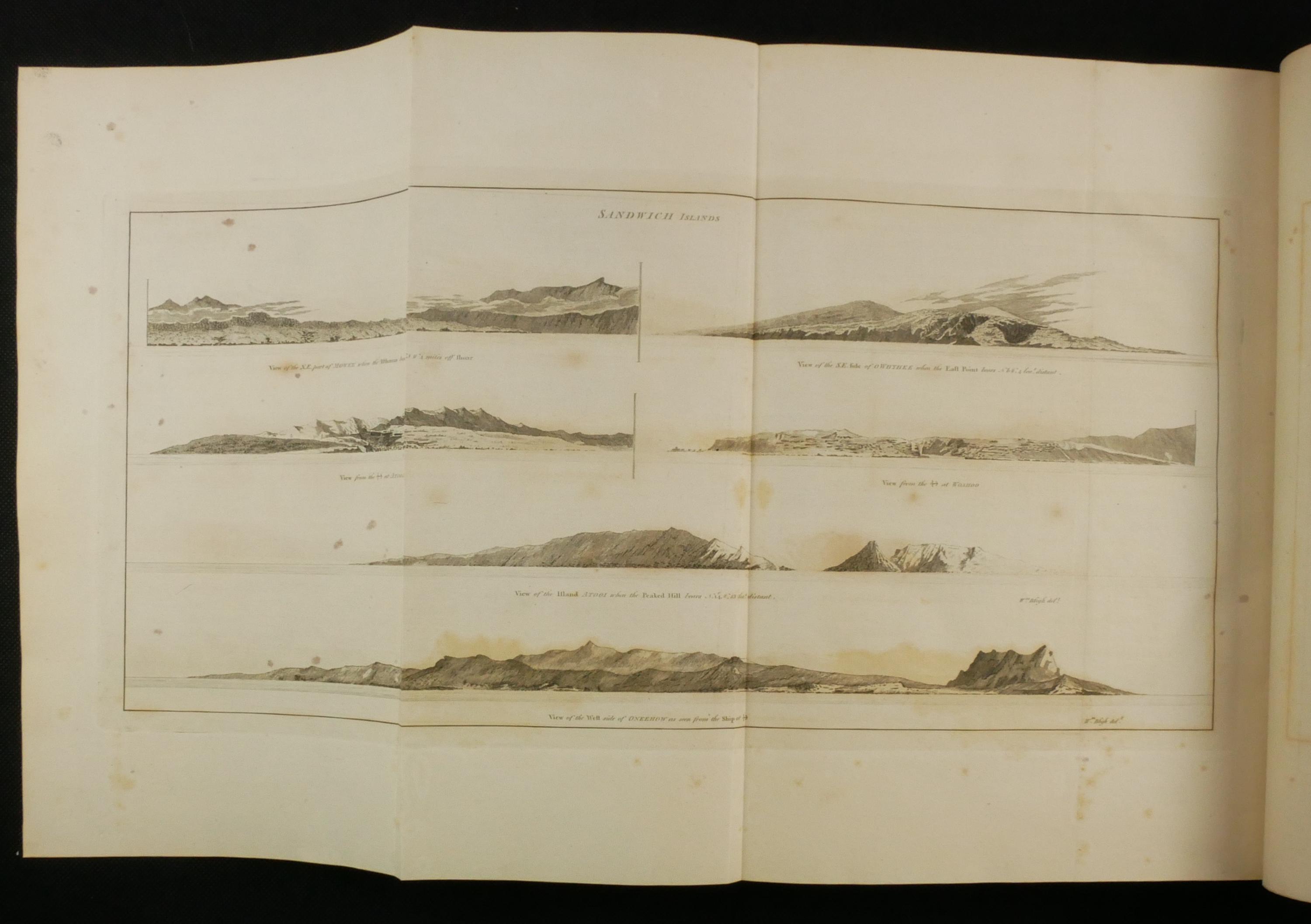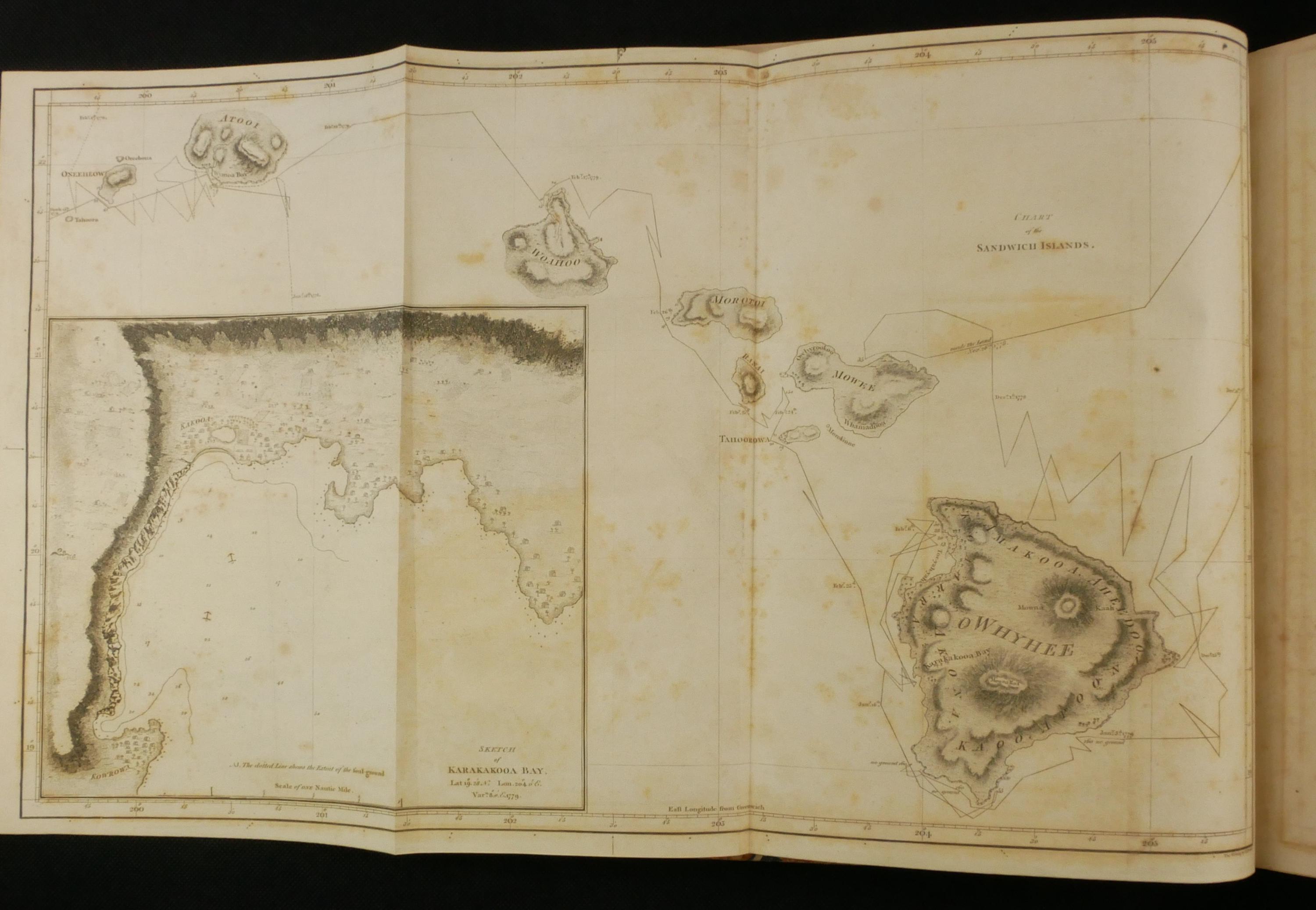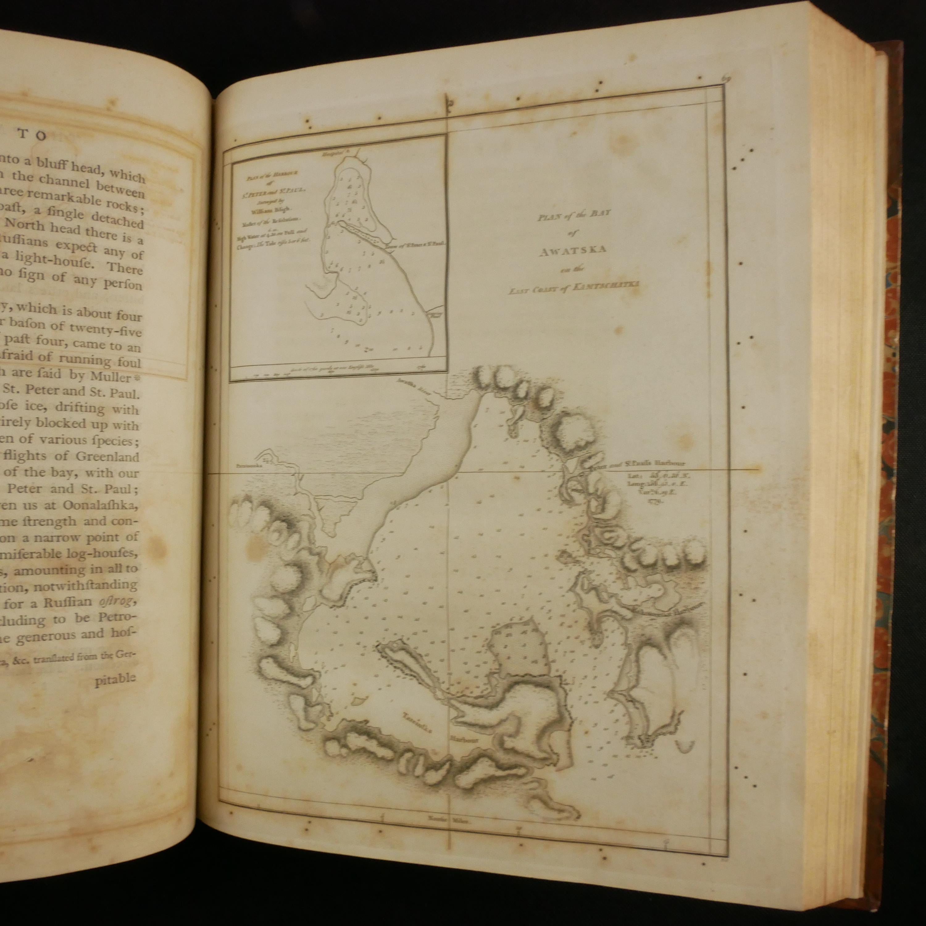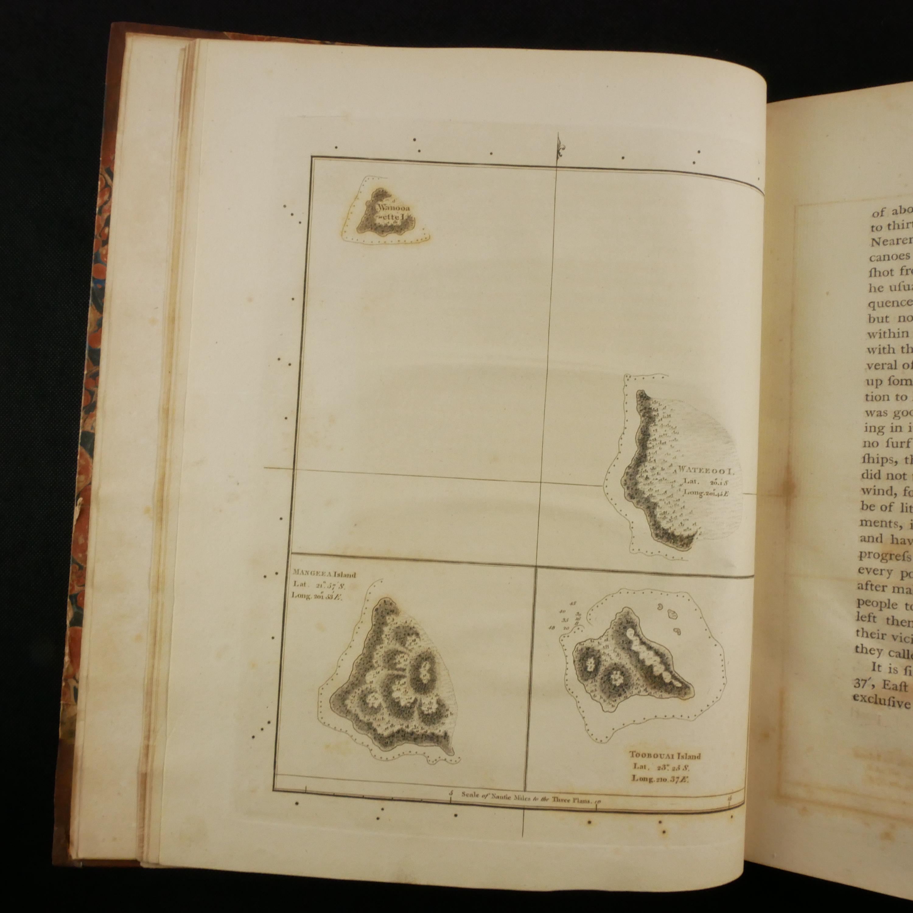 Each vol. measures approx. 30 x 24 x 4 cm. Leather spines and corners, with marbled paper covered boards. Spines with six compartments separated by gilt fillets; four compartments with central florets in blind, two compartments with "Cook's Voyages and the Vol in gilt. Illustrated (but only with the non-folio illustrations).