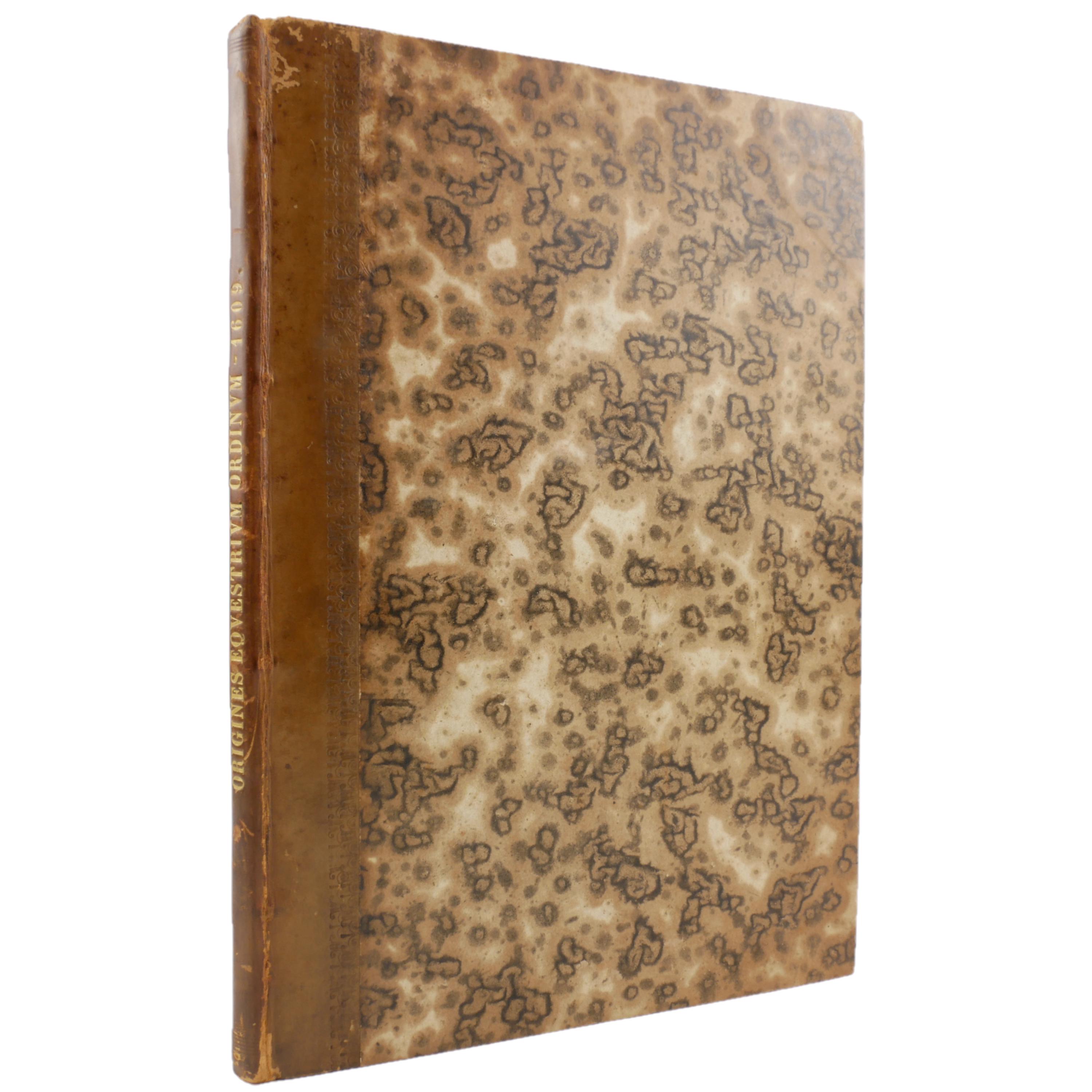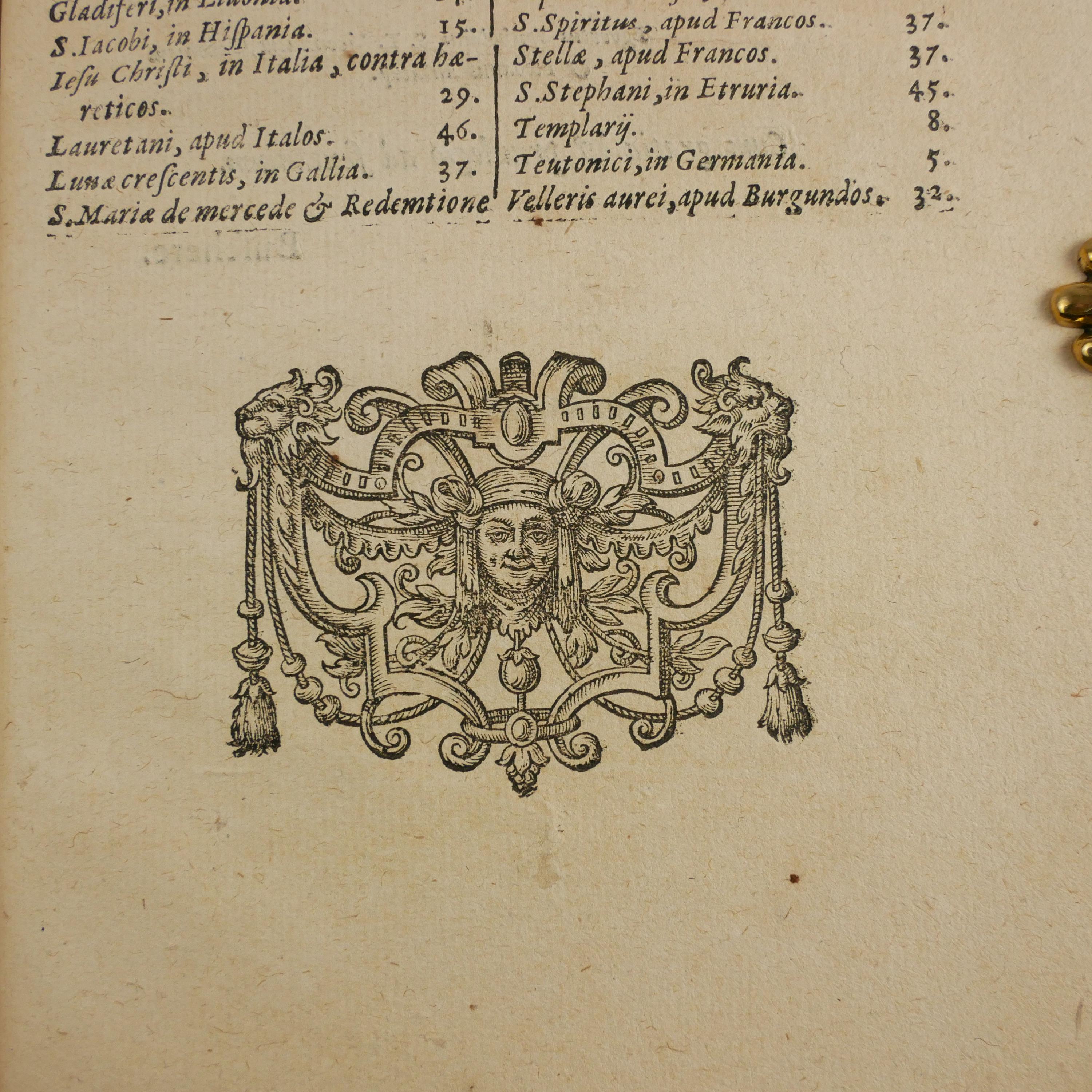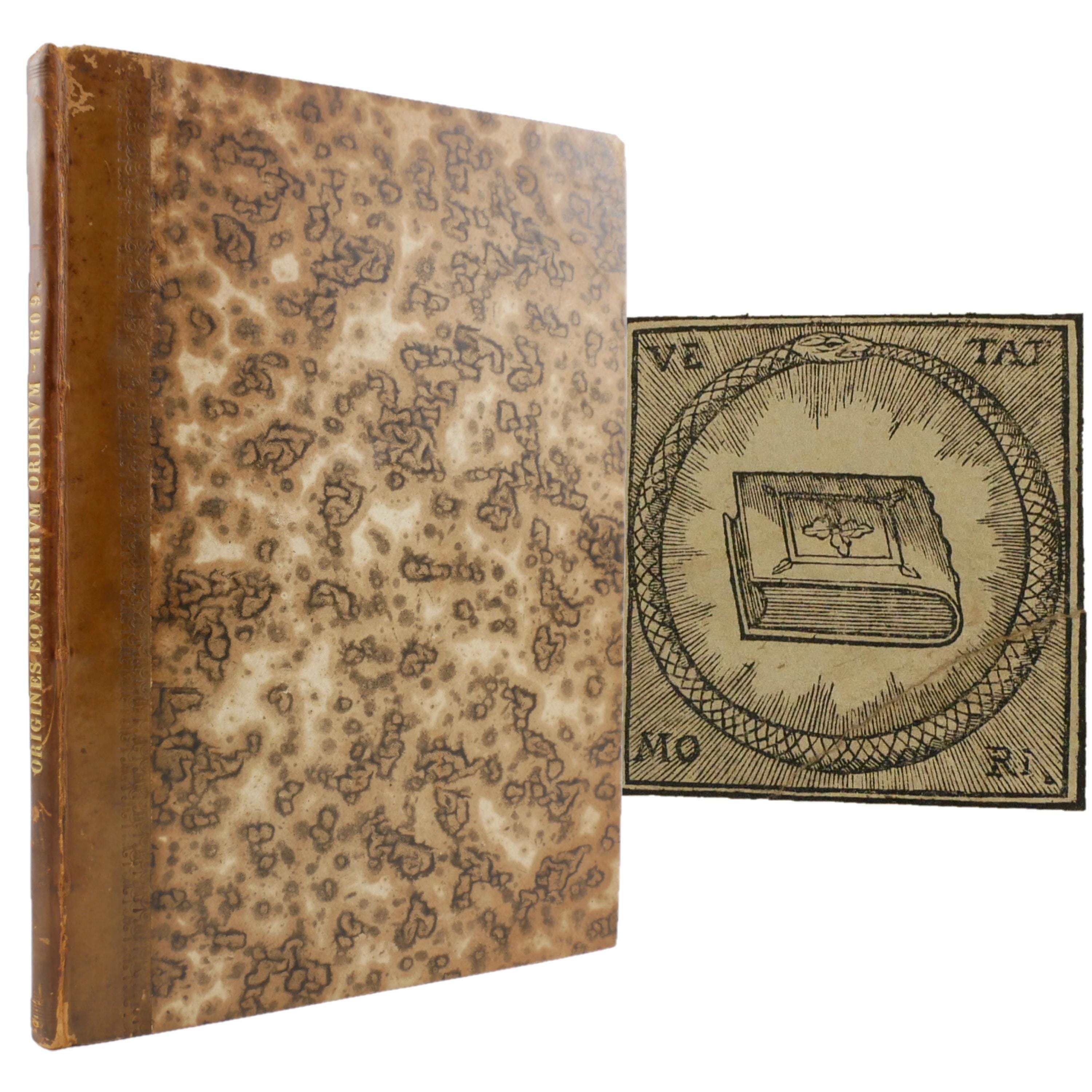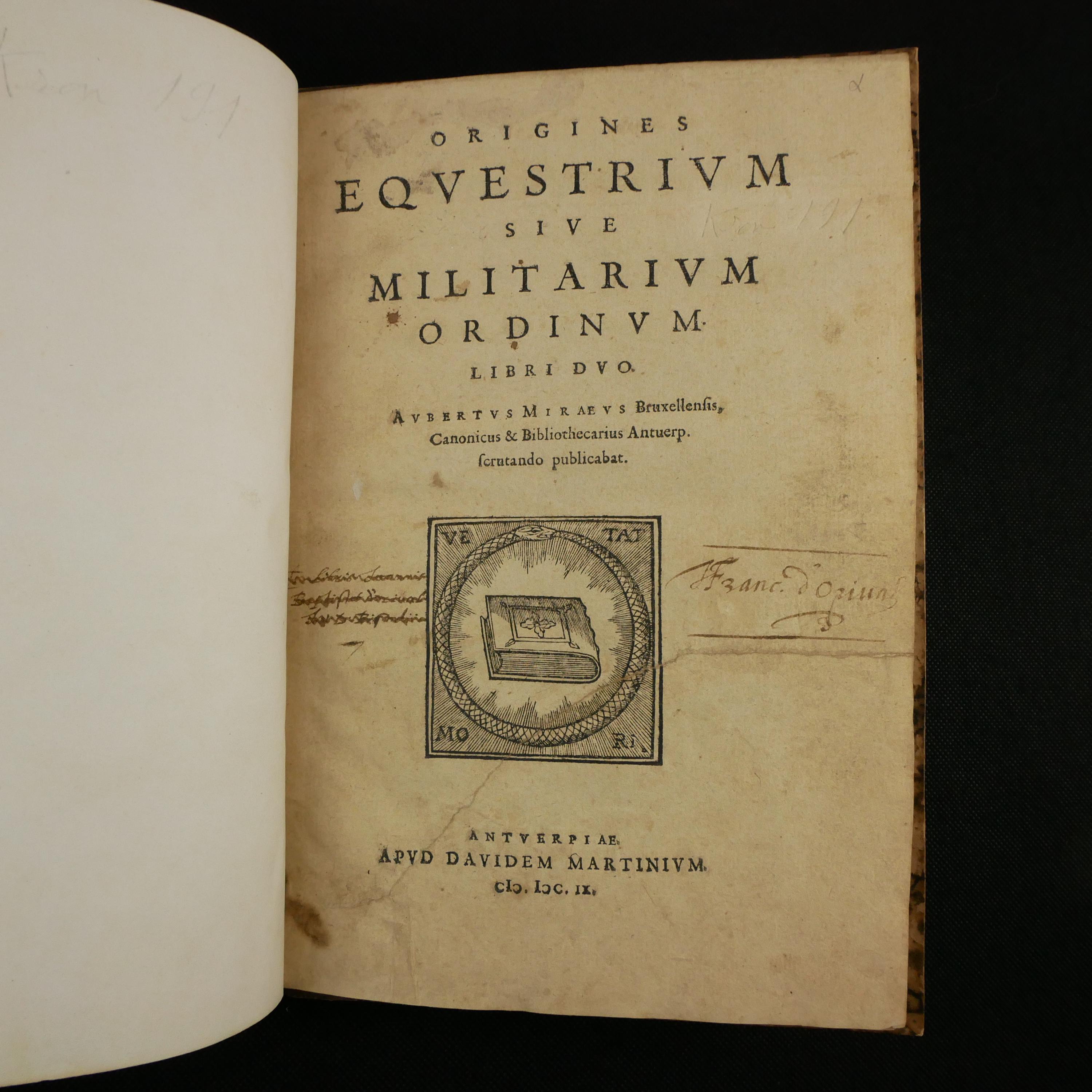 The 1609 first edition of Aubertus Miraeus' history of the Catholic orders of knighthood, including the Knights Templar, Hopsitaller, Teutonic, Order of the Golden Fleece, etc. The work details the origins, rules and histories. To some degree, this was a work of counter-reformation, aiming to show historical virtues of the Catholic church. As such, the institutions are presented in their relationship to church organization.