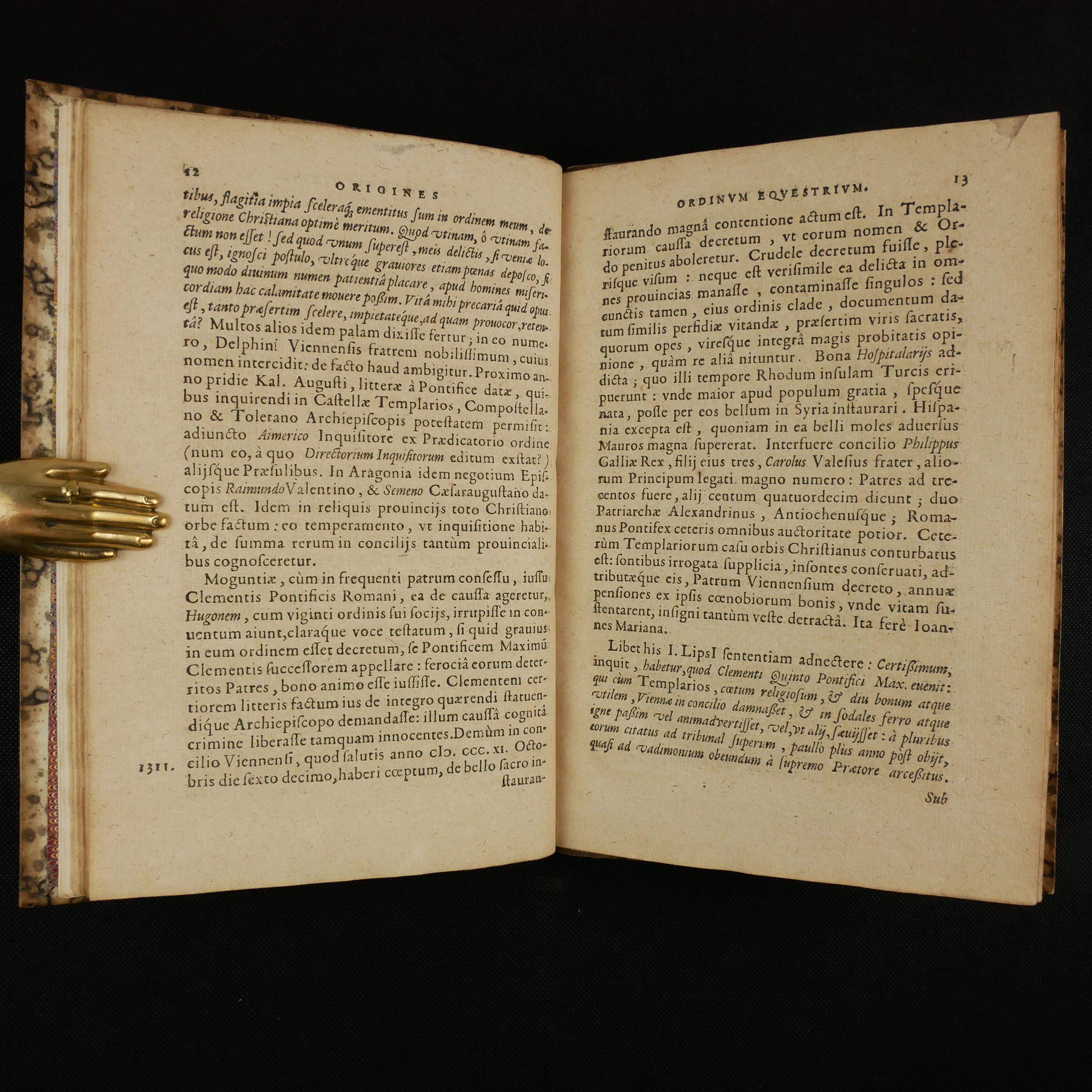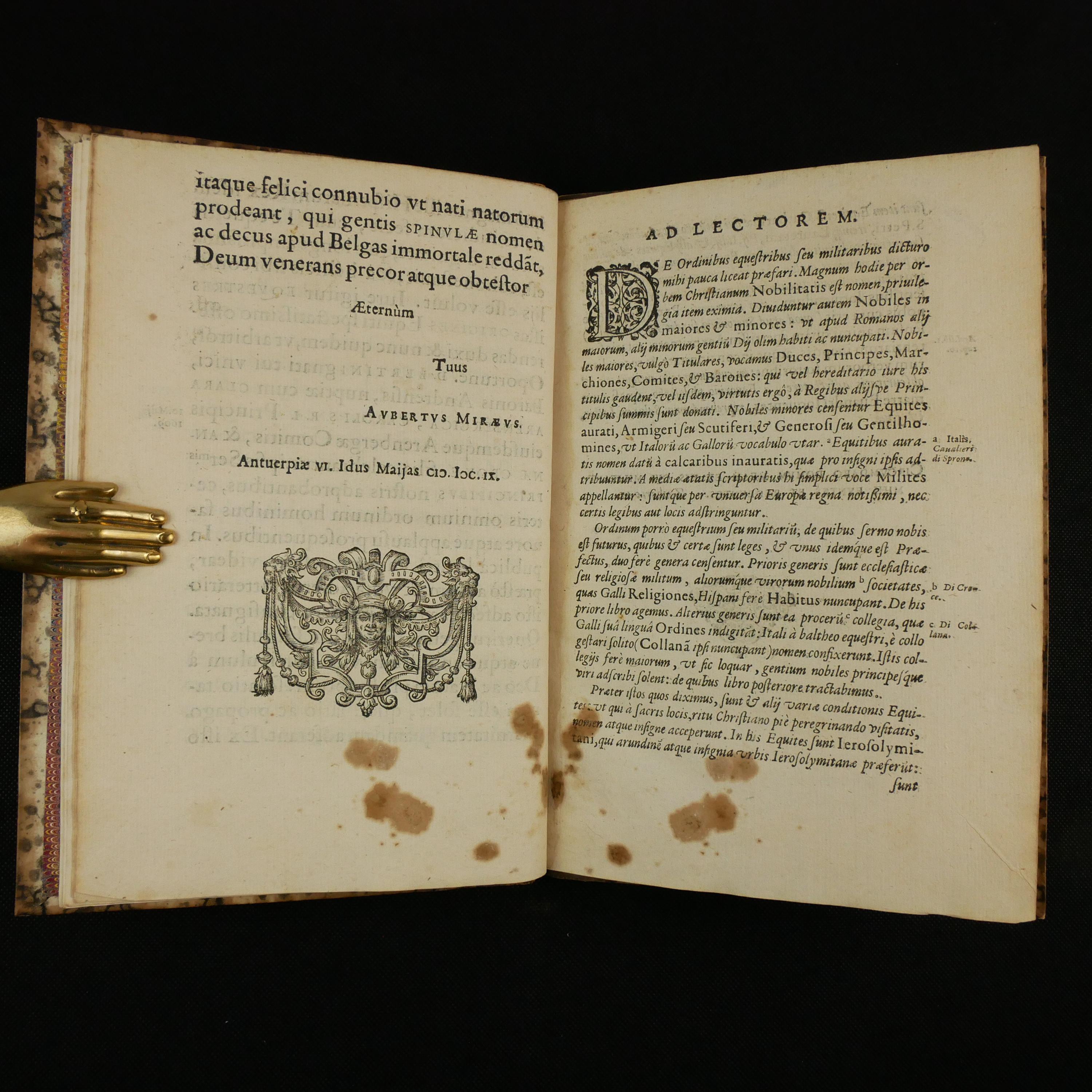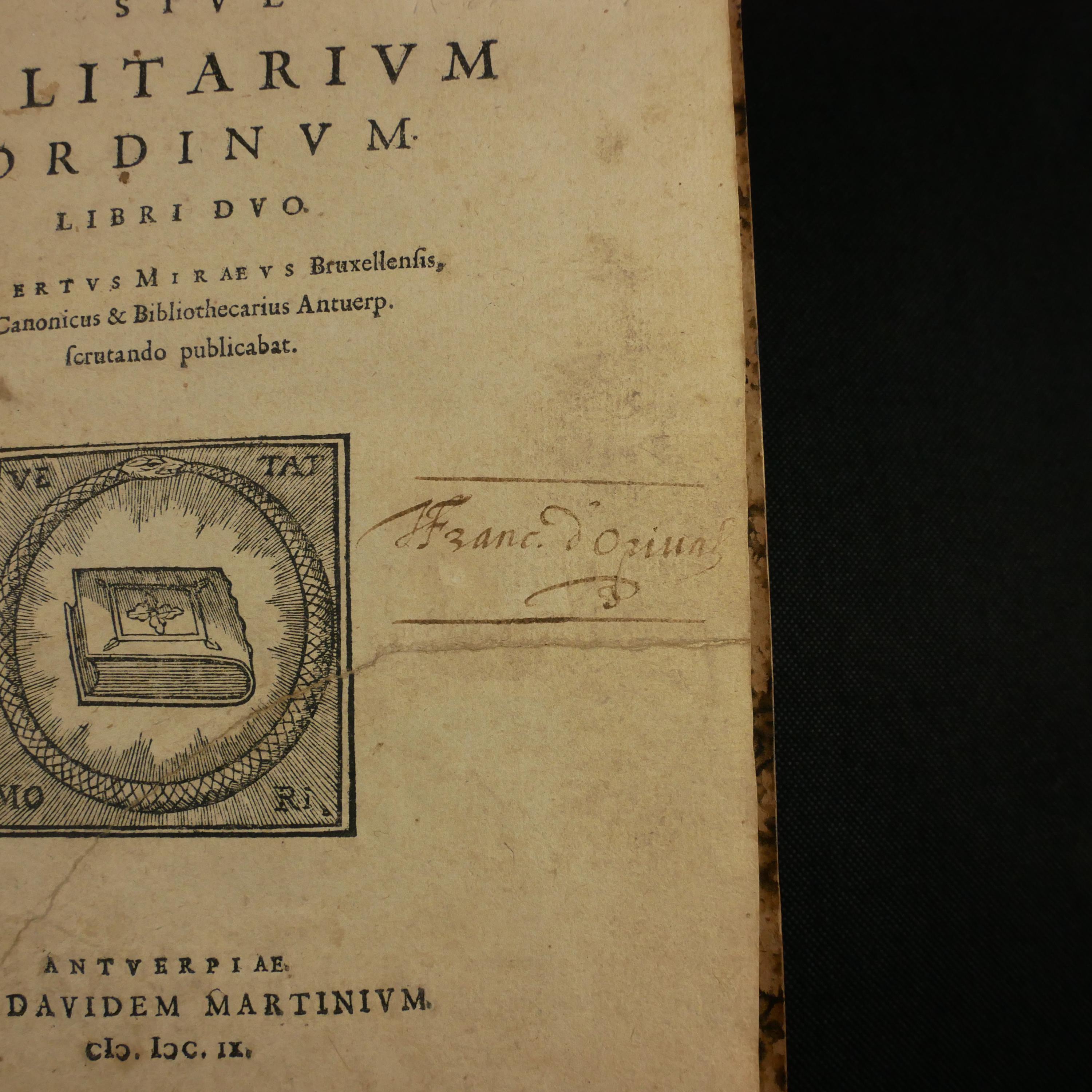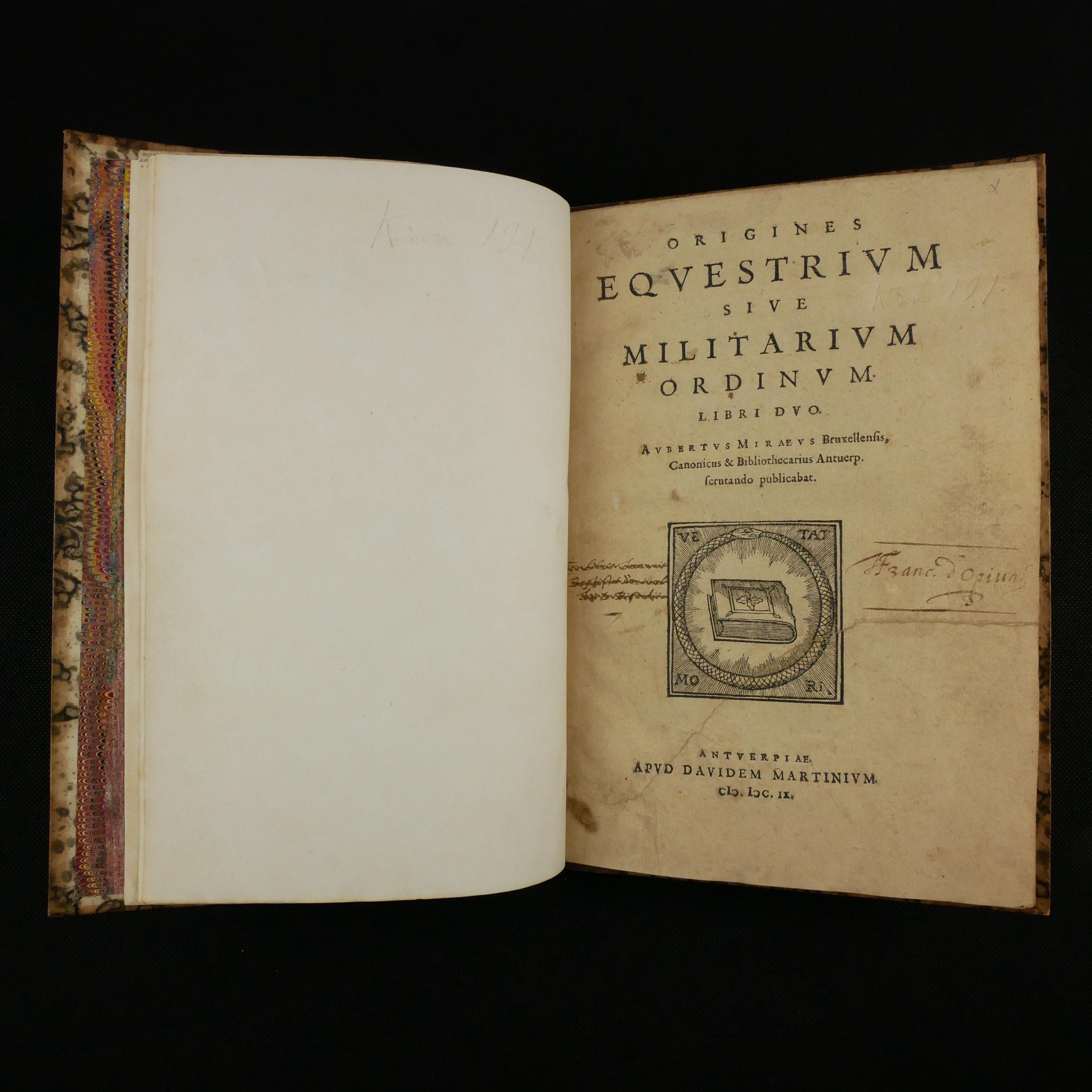 The 1609 first edition of Aubertus Miraeus' history of the Catholic orders of knighthood, including the Knights Templar, Hopsitaller, Teutonic, Order of the Golden Fleece, etc. The work details the origins, rules and histories. To some degree, this was a work of counter-reformation, aiming to show historical virtues of the Catholic church. As such, the institutions are presented in their relationship to church organization.