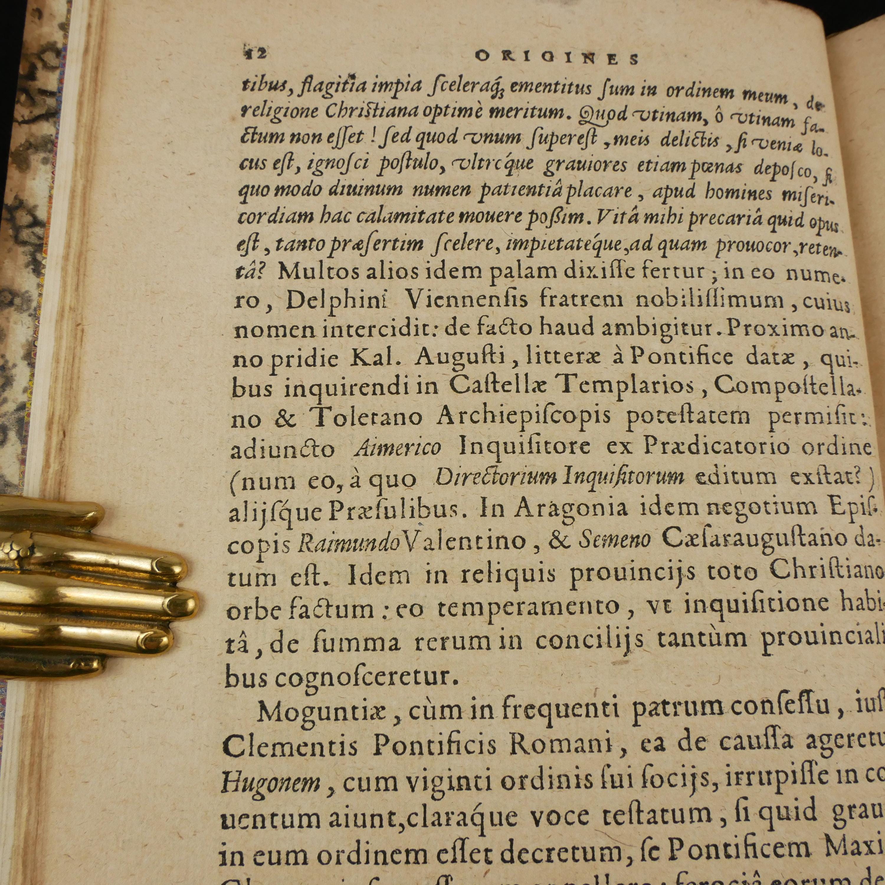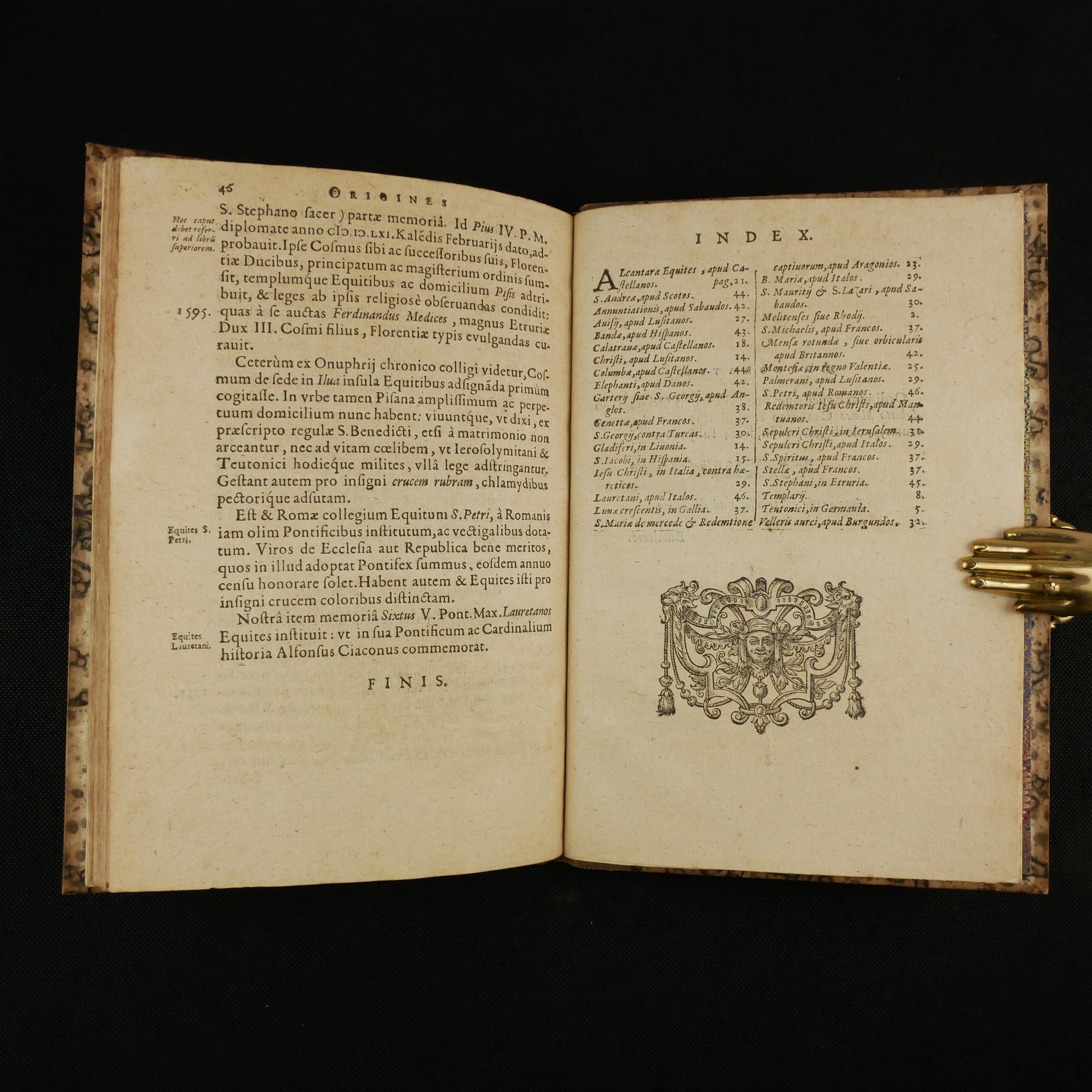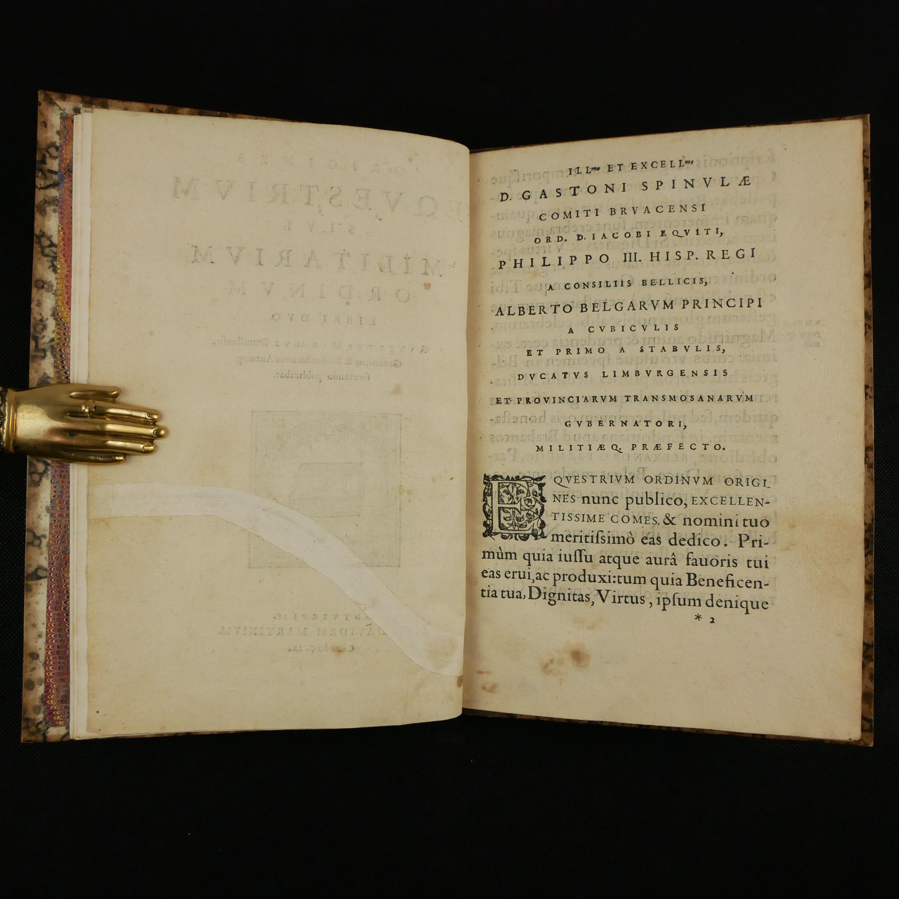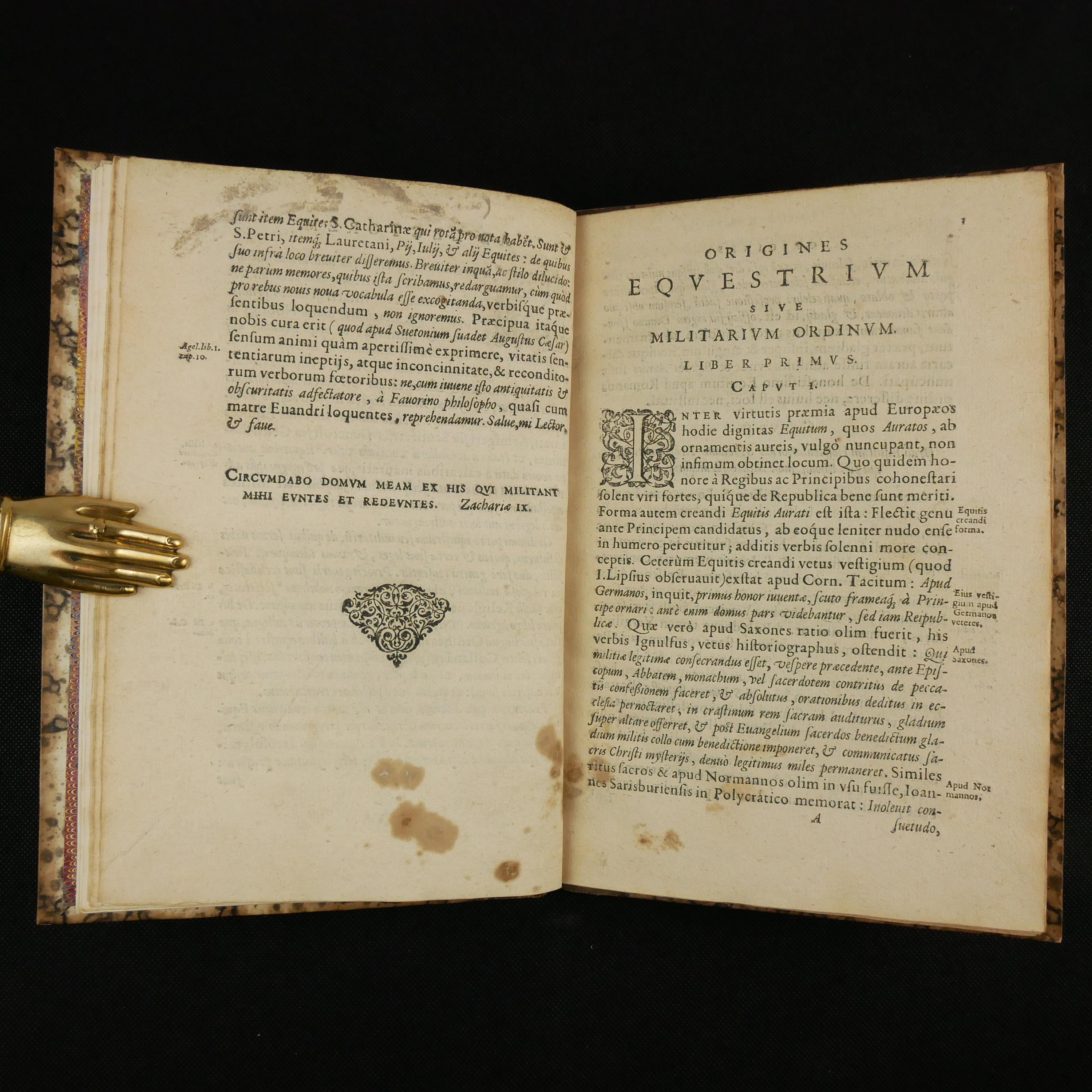 The 1609 first edition of Aubertus Miraeus' history of the Catholic orders of knighthood, including the Knights Templar, Hopsitaller, Teutonic, Order of the Golden Fleece, etc. The work details the origins, rules and histories. To some degree, this was a work of counter-reformation, aiming to show historical virtues of the Catholic church. As such, the institutions are presented in their relationship to church organization.