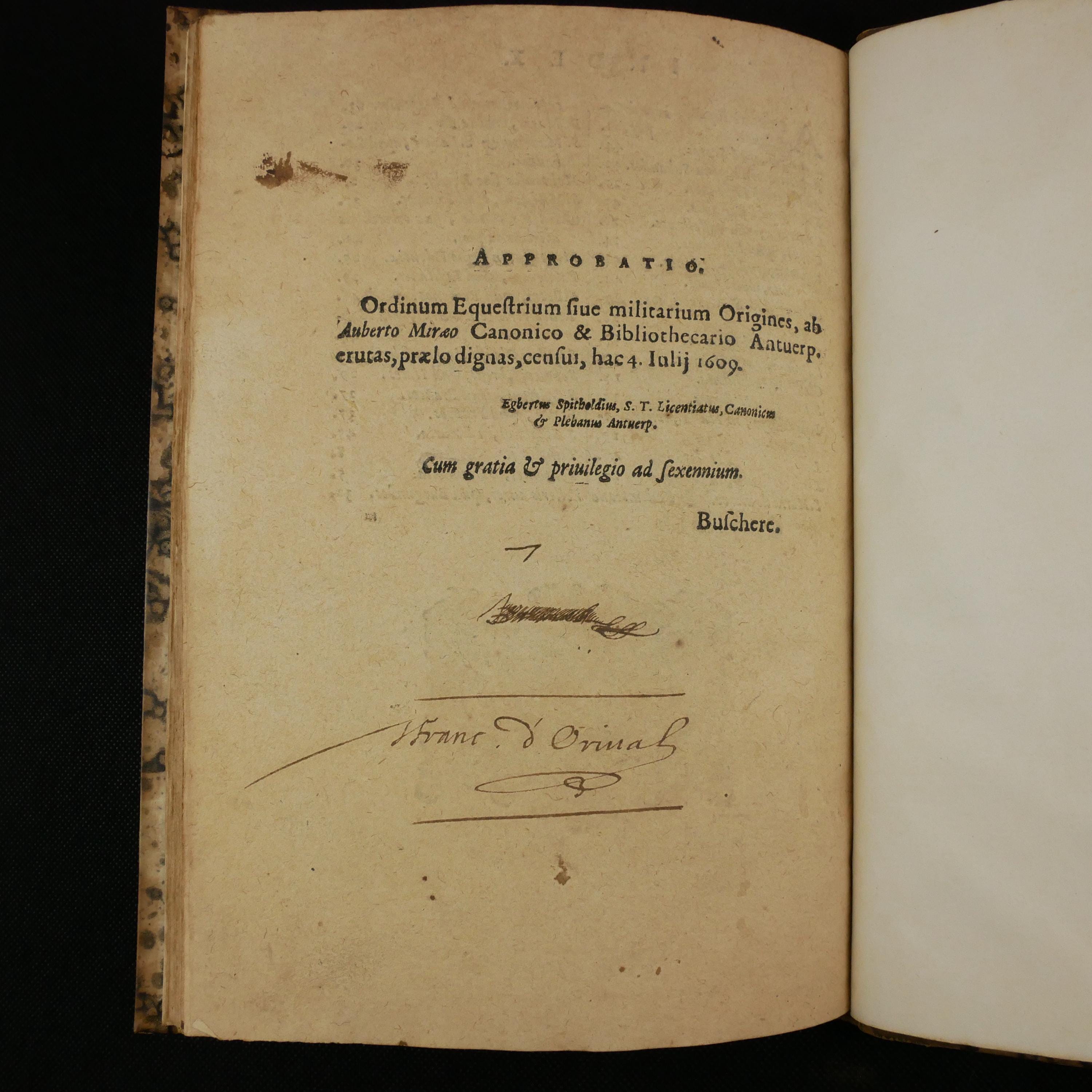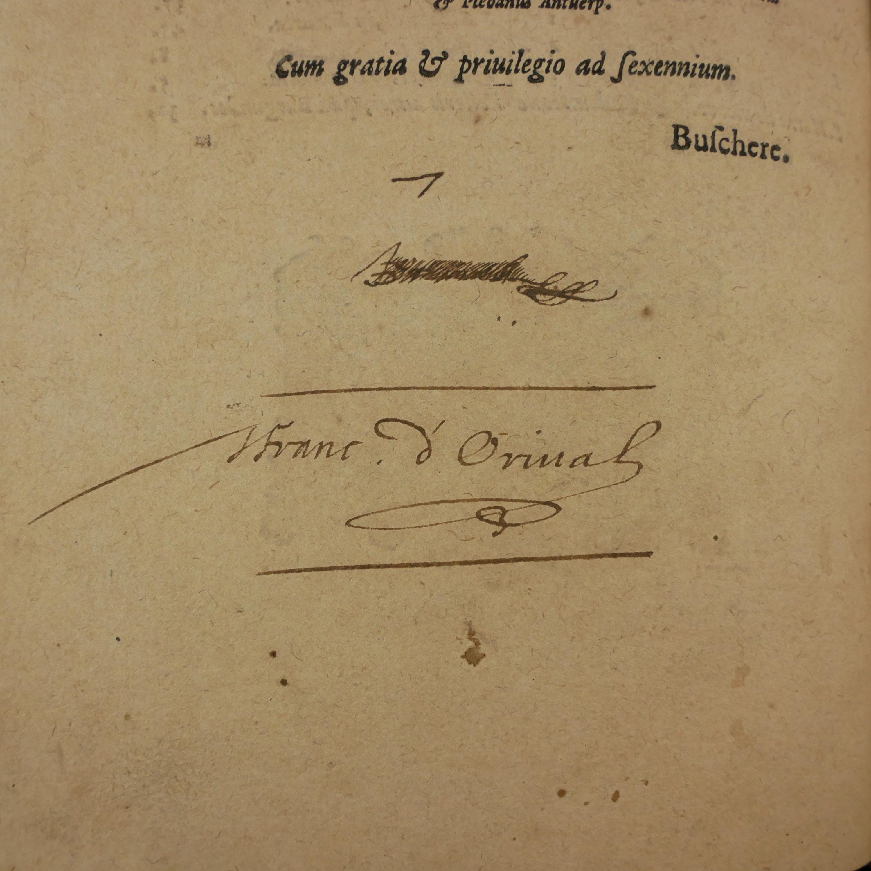 The title page and last page both bear the signature of J Franc. d'Orival. D'Orival was a very common French Catholic name in the 17th century, but in 1610 a Francois d'Orival did write a manuscript documenting the Holy Shroud of Besancon and its reputed miracles (see the Doubs Archives, "Le Sainct Suaire de Besancon. Antiquite, miracles et venerations d'icelu Le Sainct Suaire de Besancon..."). There is no possible way to know if this is the same Francois d'Orival, but since the shroud of Besancon was thought to have been brought to France by a knight, there is some small possible relationship.