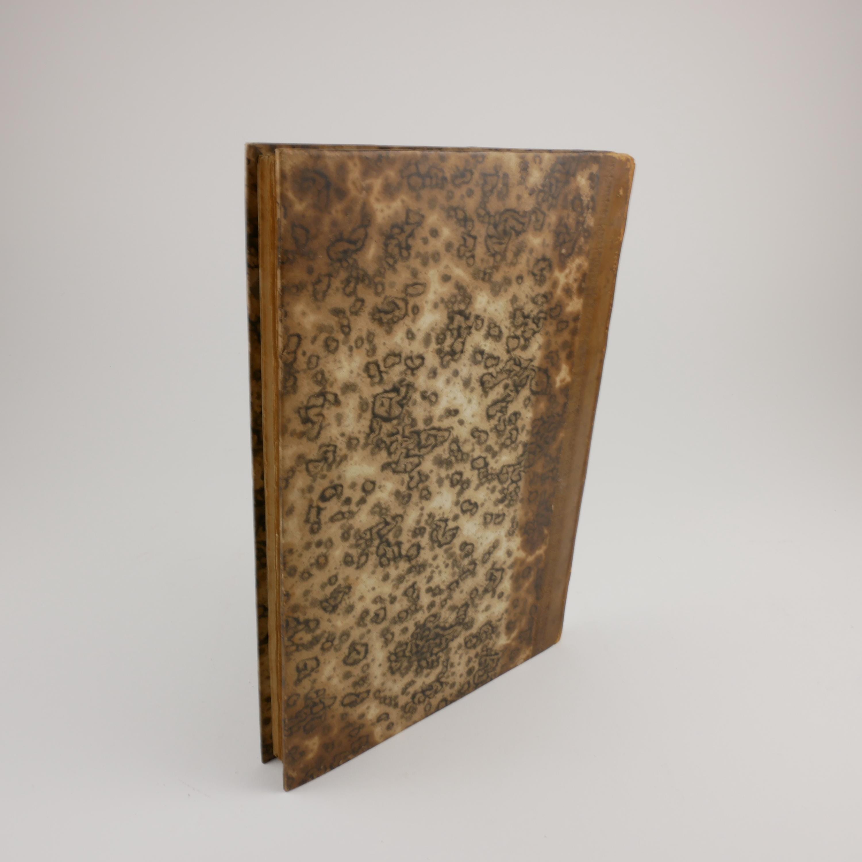 Measures approx. 25 x 17 x 1 cm. Quarto. Hardcover with leather spine. Boards with decorative paper covering them. Spine with a fleur roll along the edges, title and year in gilt along the spine. Marbled endpapers.