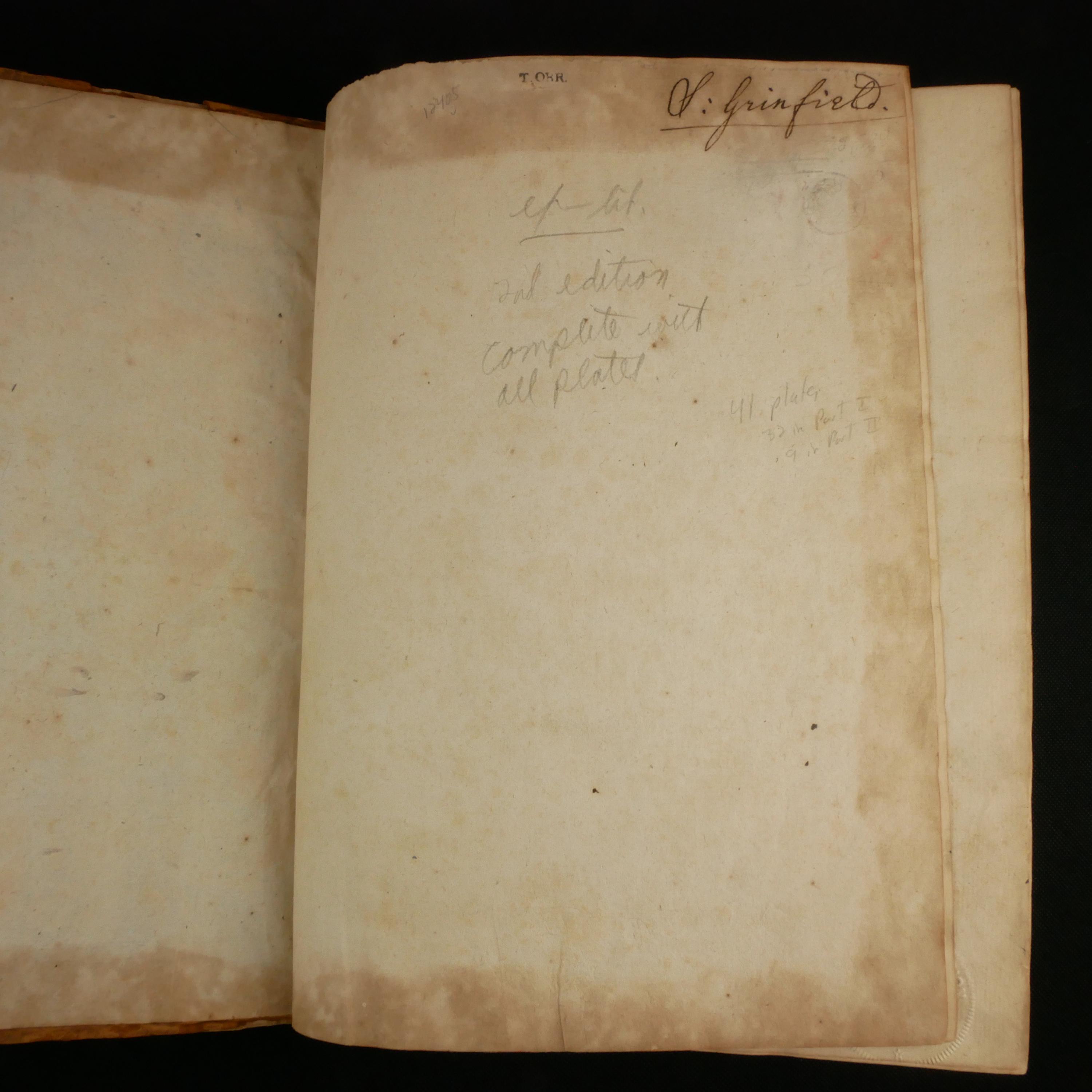 Numerous provenance marks. The front pastedown has the ticket of, "W. Junk... Berlin W. 15". The blank front endpapers has the signature of "(S?): Grinfield." and the stamp of "T. Orr". Their are numerous perforated marks of the Cossitt Library Memphis Tennessee, and title page has the impression of yet another library (unreadable).