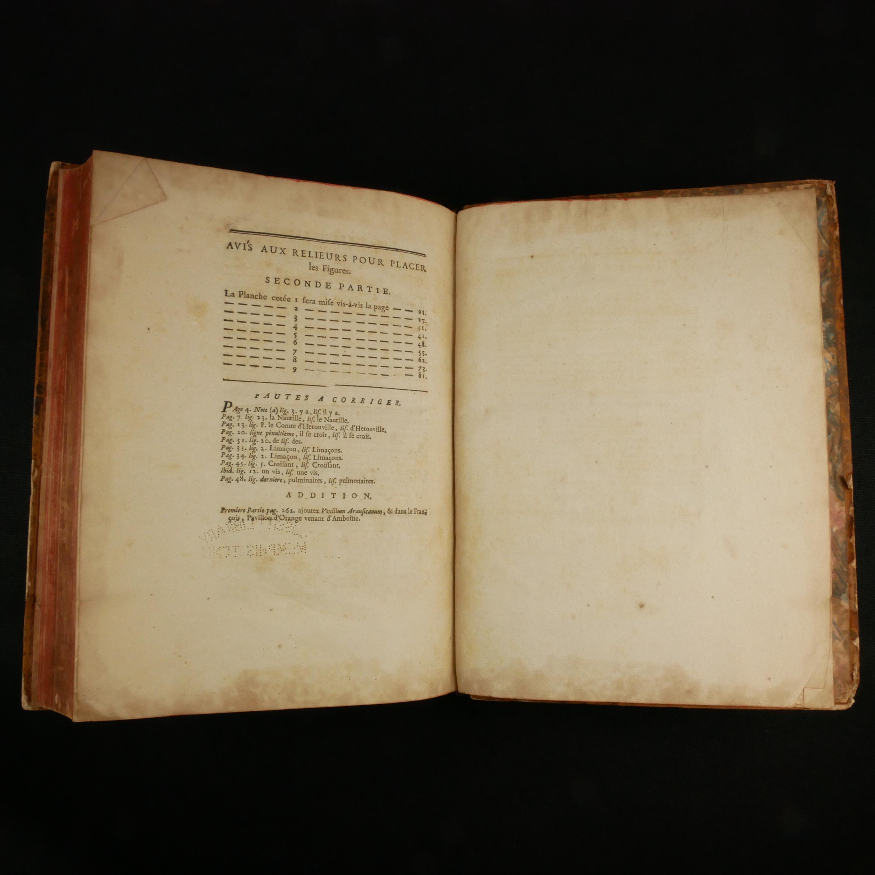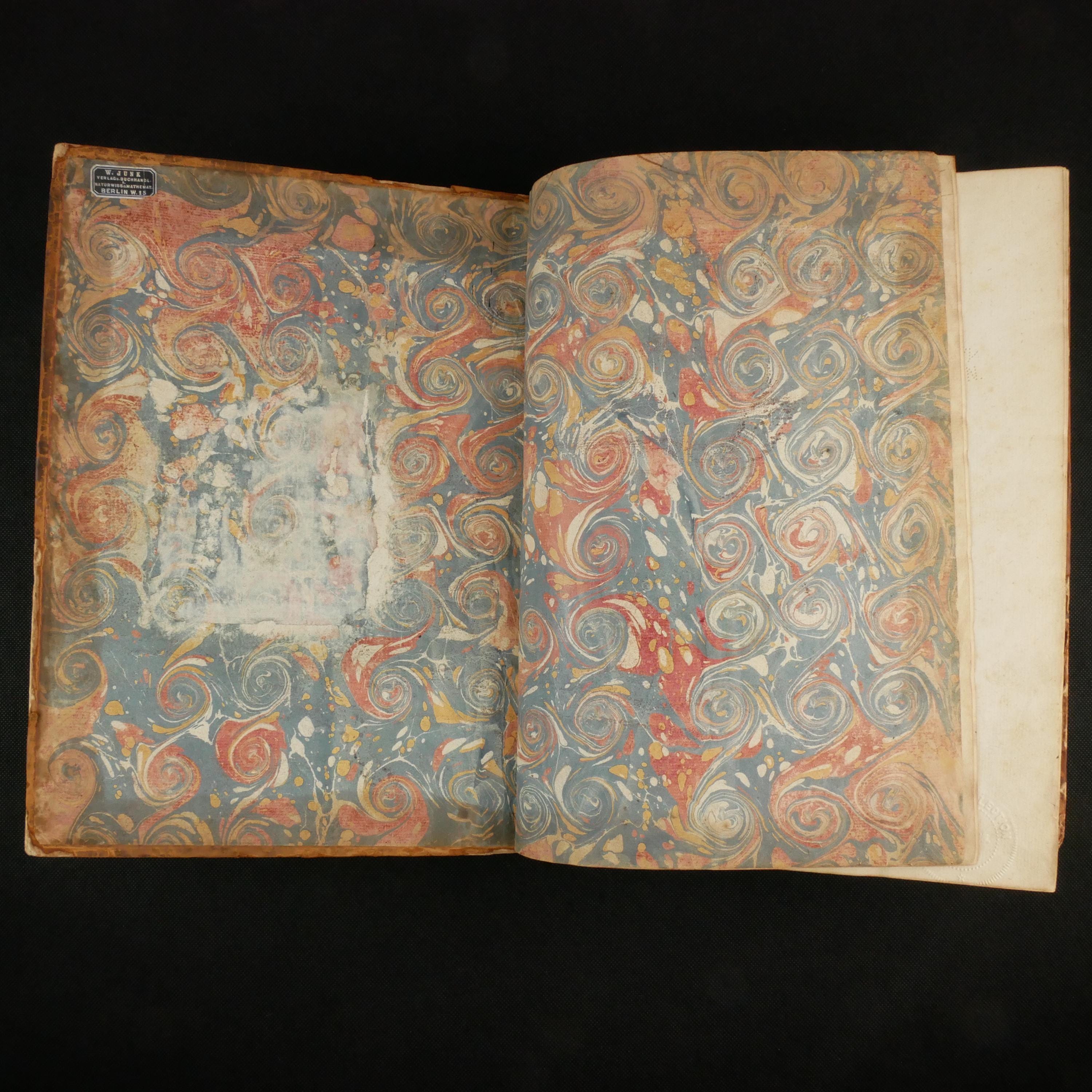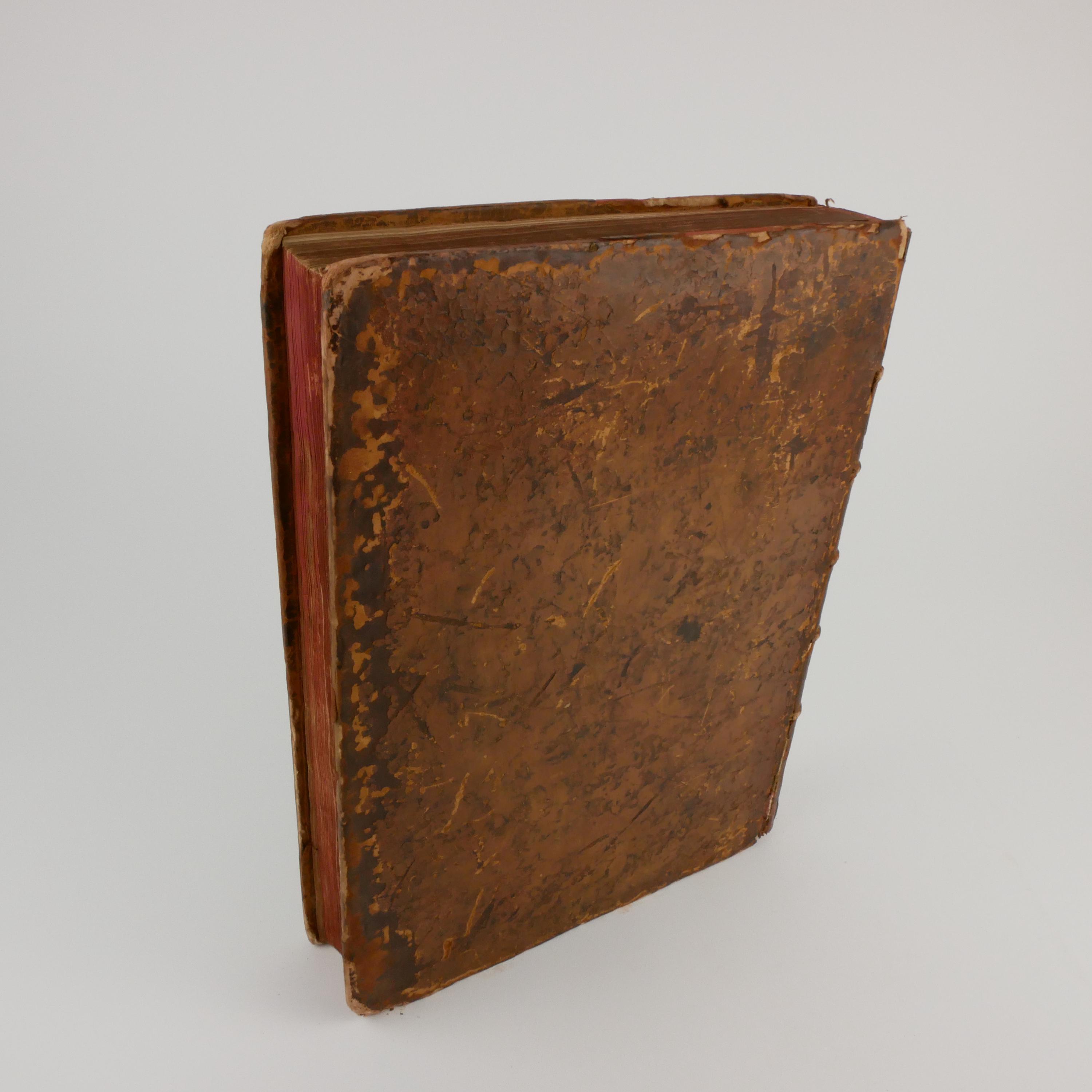 Measures approx. 30 x 22.5 x 4.5 cm. Leather binding. Spine with five raised bands; five compartments with a central floret and one compartment with title in gilt. All edges red. Marbled endpapers. Illustrated with plates.