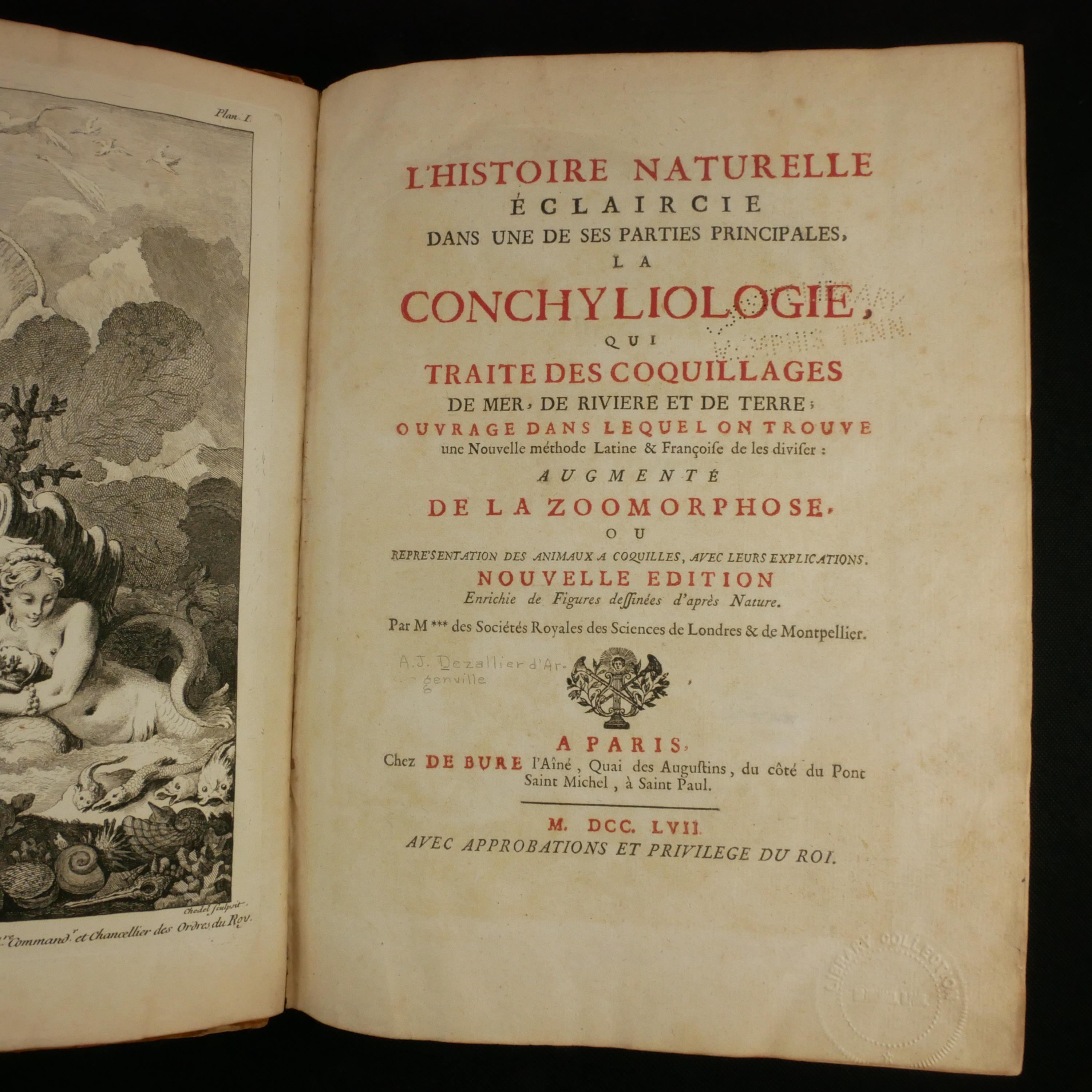 In 1742 D'Arengville produced his first work on the topic, a shared work with minerals and shells. Then, here, in 1757 he dropped the mineral portion and added significantly to the text on shells to include the animals that inhabit them. This work is considered an important step towards the modern categorization of animals, being one of the last, but best, that used visual classification (mainly).