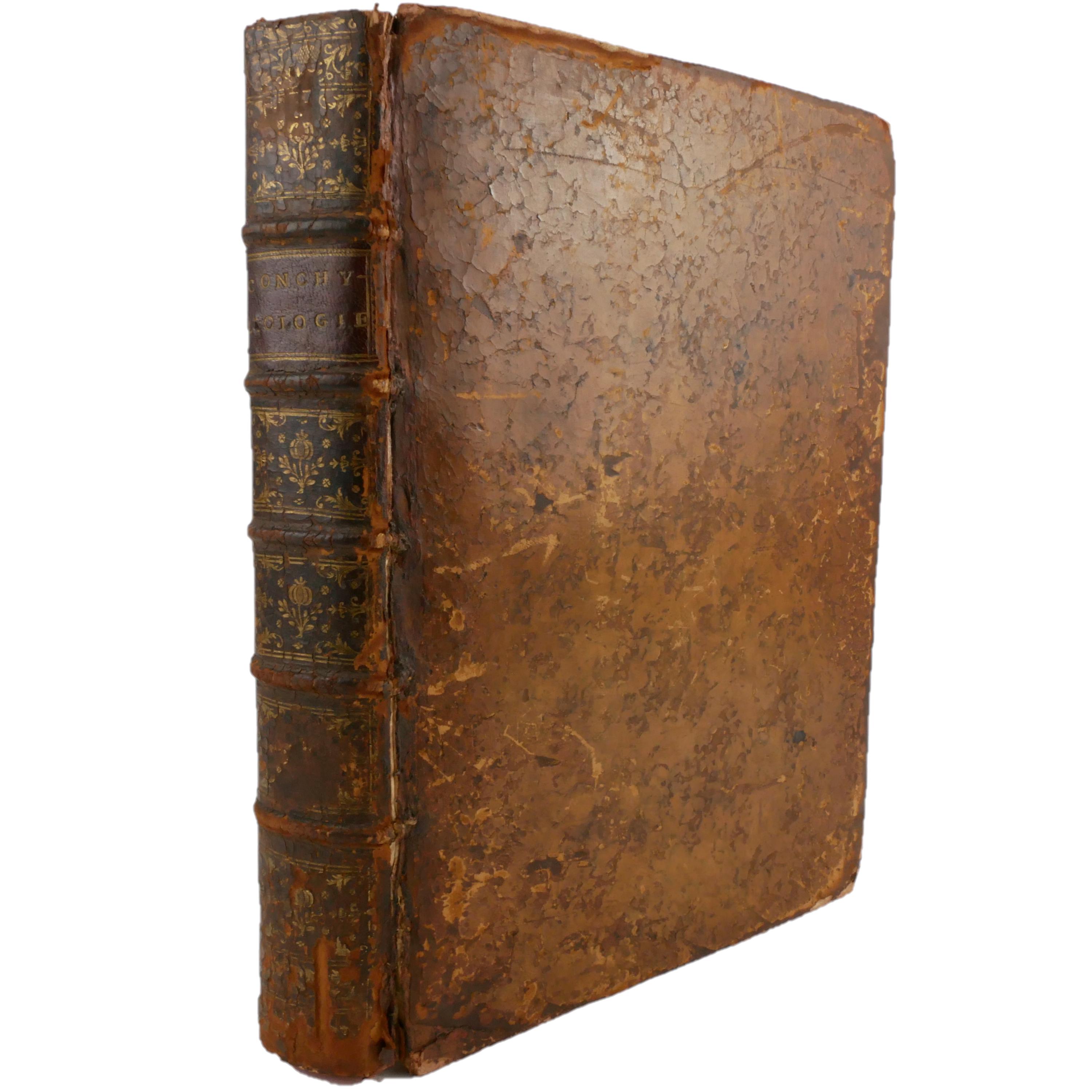 See pictures. Leather very worn, evidence of an old repair too; joints cracked, corners worn through, crazed leather, etc. Boards holding on by cords. Spine chipped top and bottom, with some losses along spine.