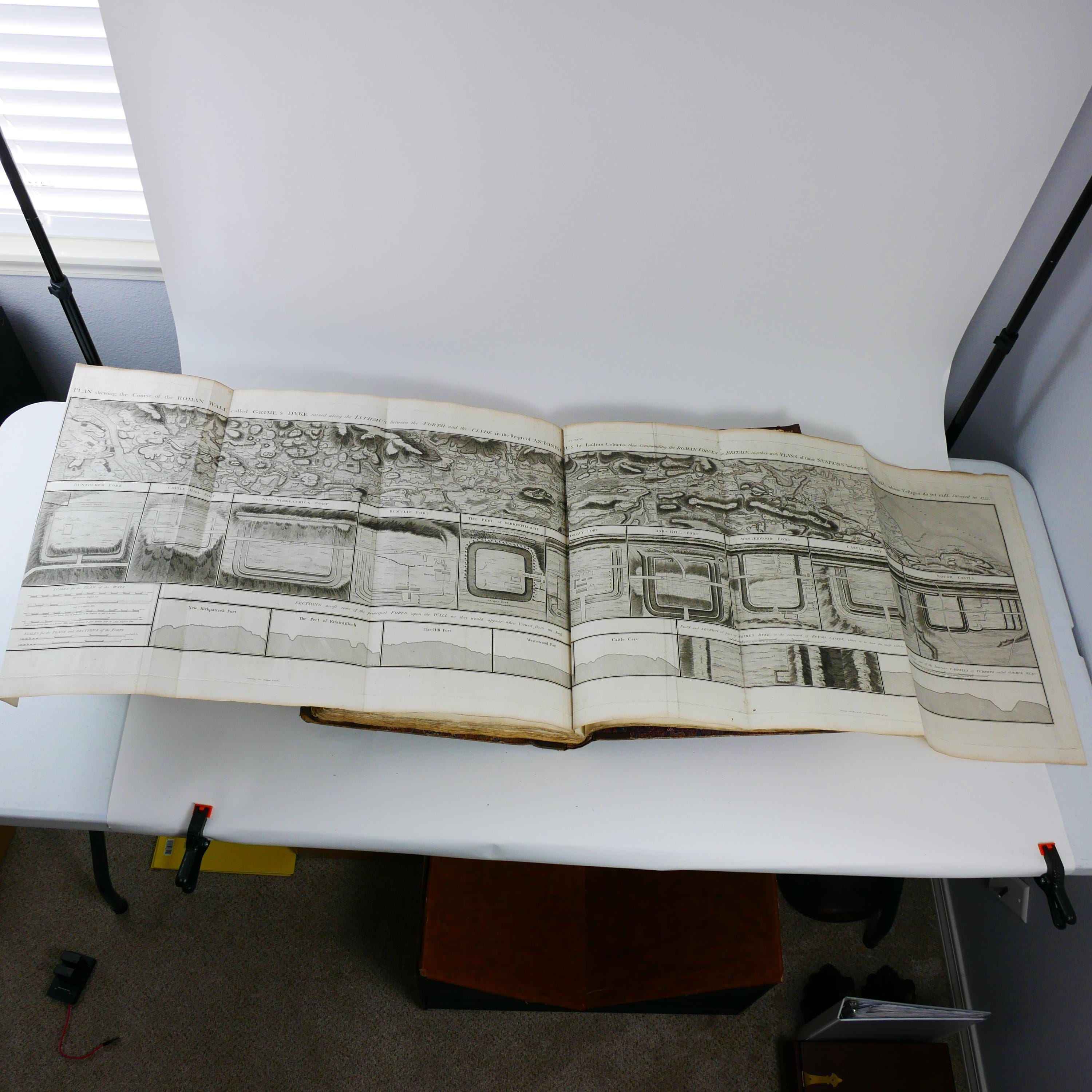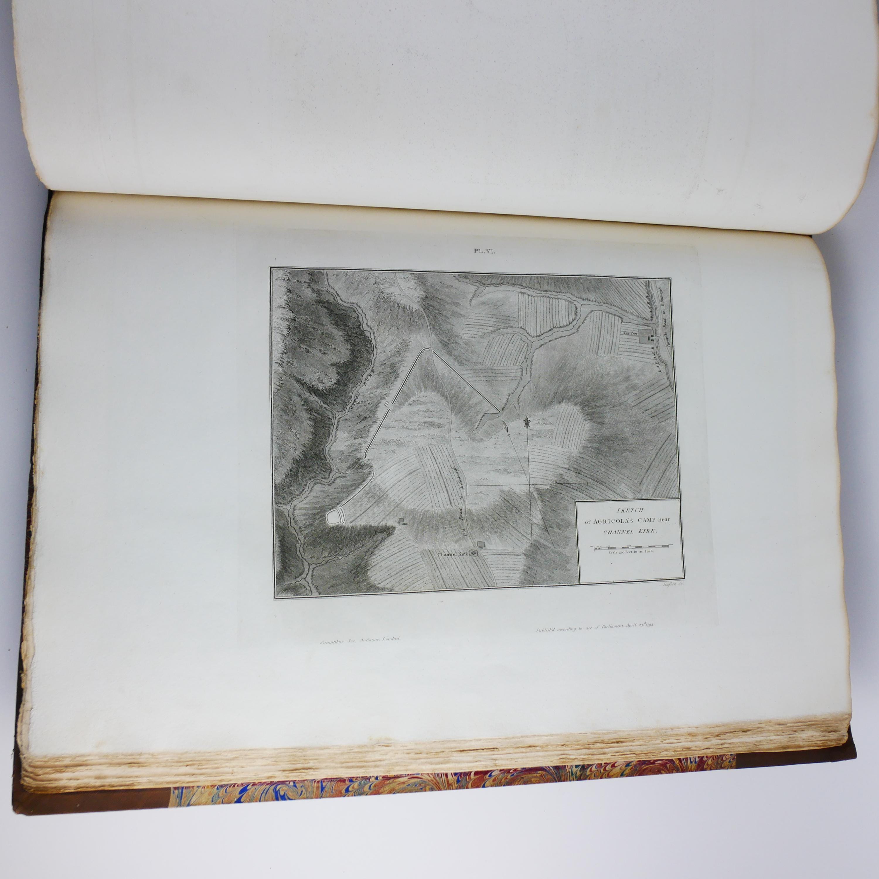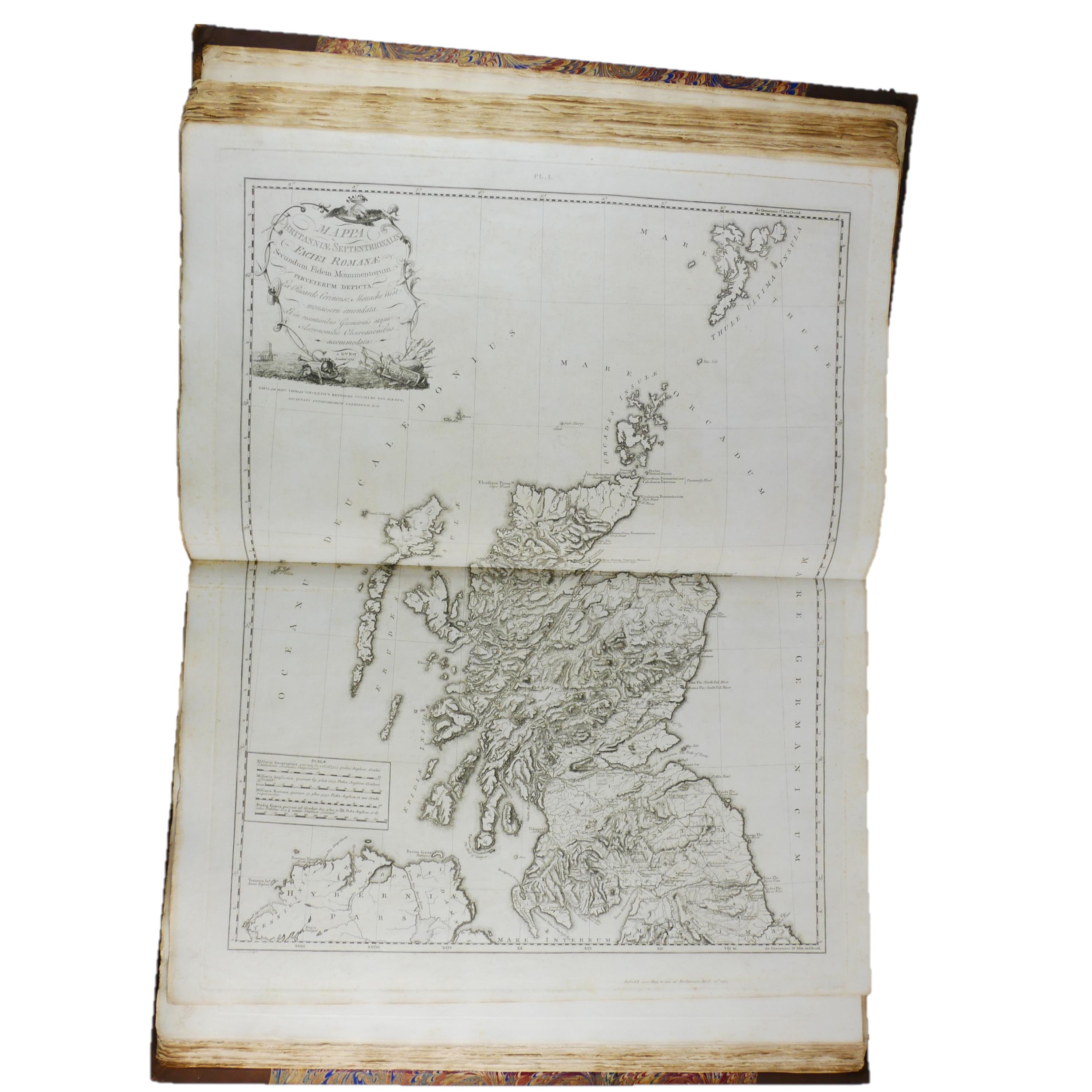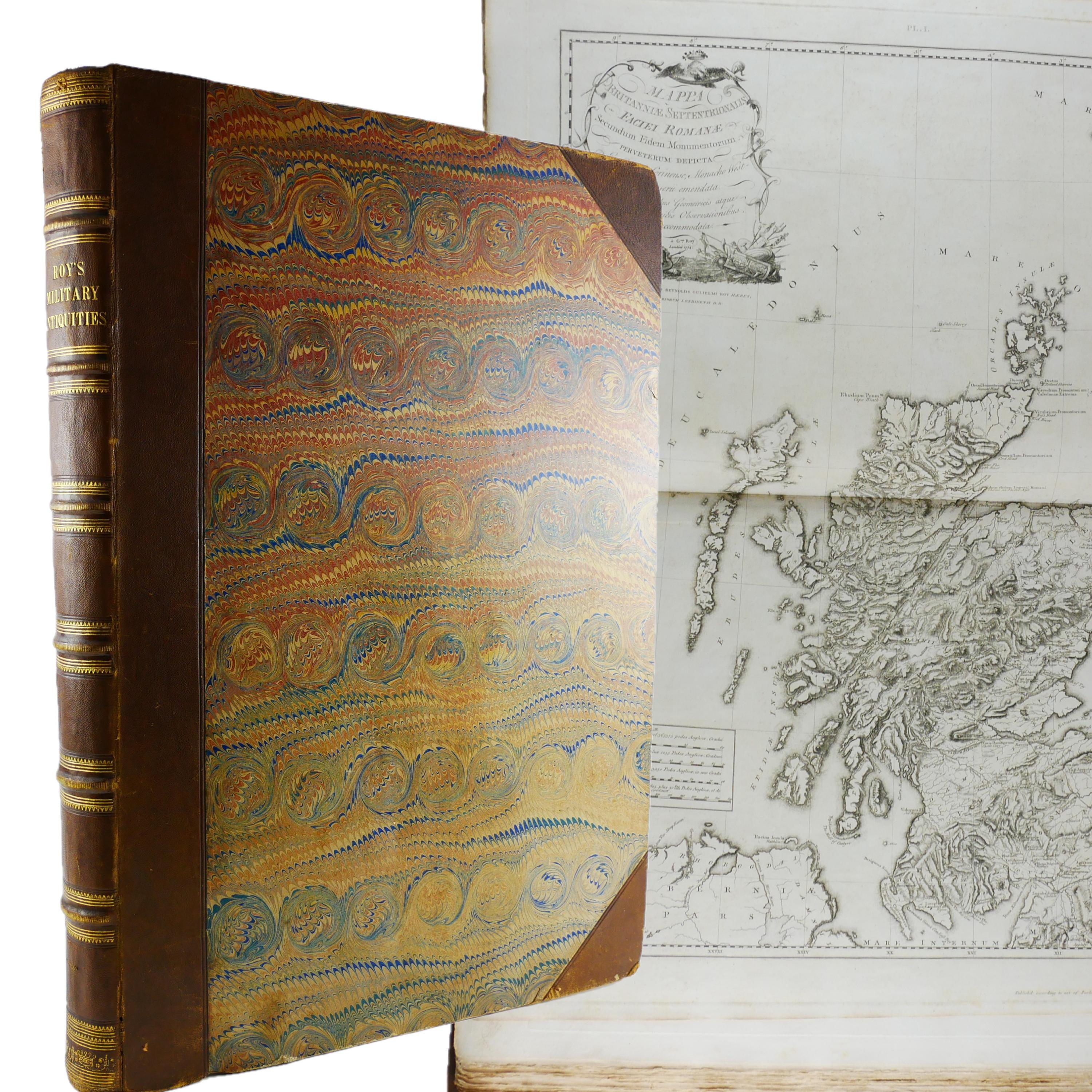 William Roy's monumental work, The Military Antiquities of the Romans in Britain. Produced in imperial folio size (roughly 56.5 cm tall), with 51 plates (some folding, including a double tri-fold of the Roman Wall).