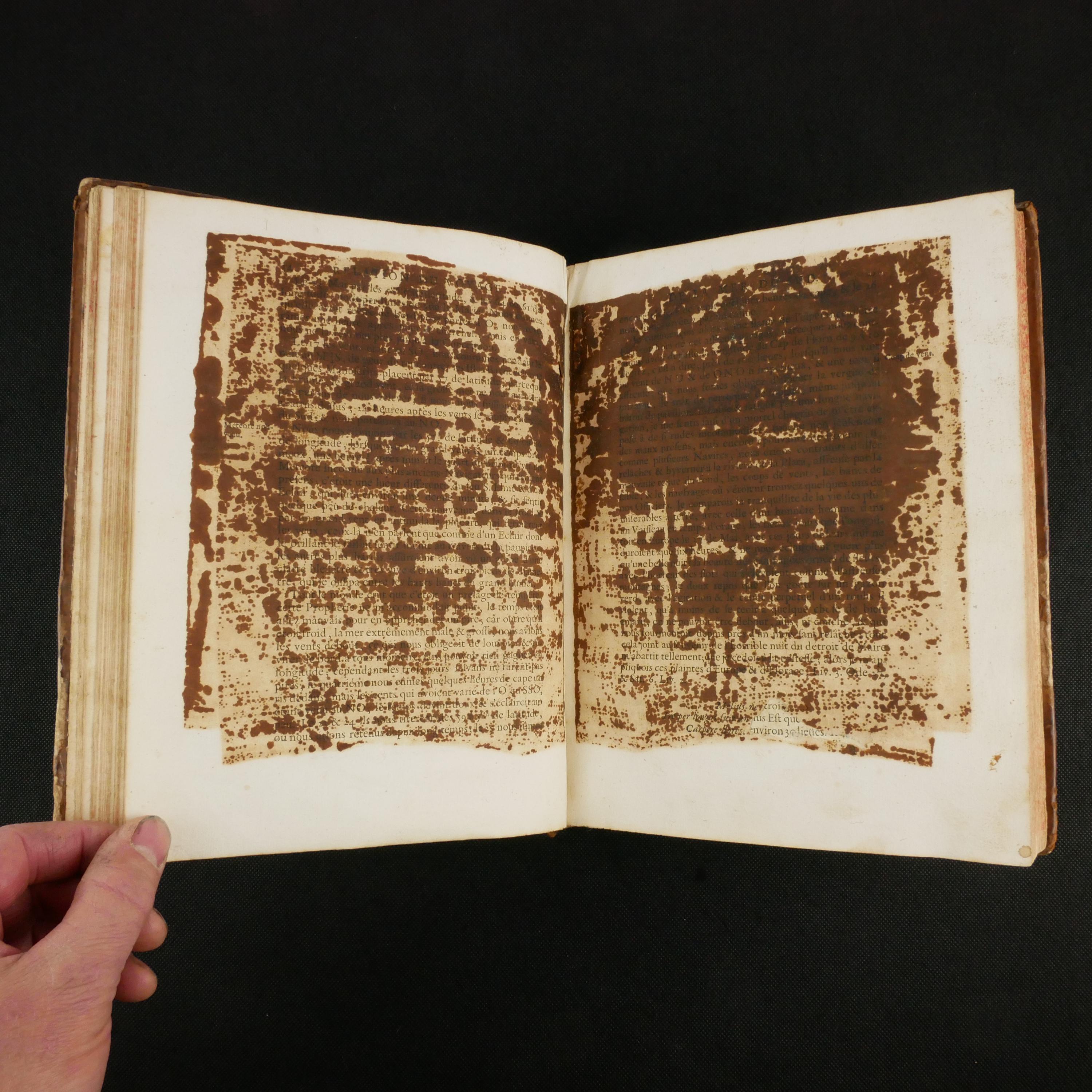 Text block toned throughout with some thumbing. An occasional fox spot, dog-eared page, candle ember mark, etc. 1st two leaves with small chip at top edge. Some chipping to fore-edge of a3, looks like it was tipped back in (glue marks at gutter). Pages 31-38 have heavy rusting, something very acidic was kept between 34 and 35 (no longer present); 2" hole at bottom of 35/36. Occasional stray ink marks. Graphite strikethrough on plate number of XXXVI. Missing plate 32, Carte du Cap de Horn. Plates page with checkmarks.