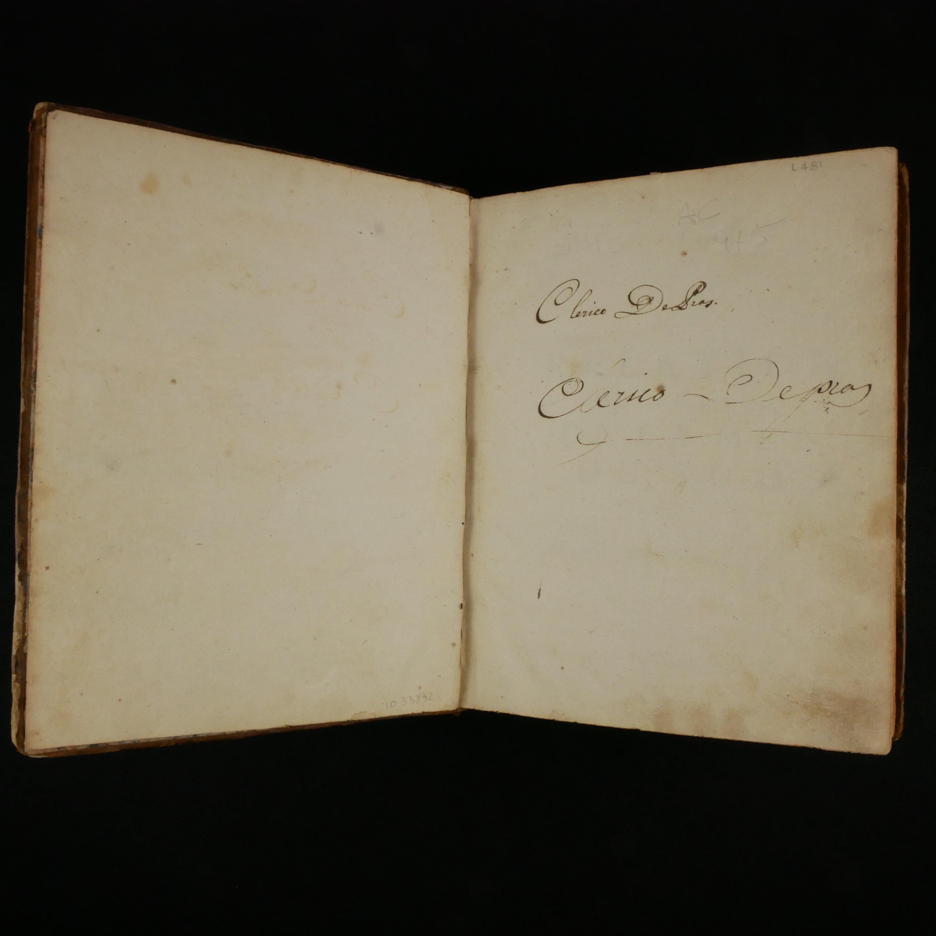 See pictures. Very worn leather binding, worn through at edges and corners. Some starting of joints. Chipping at head and tail of spine. Bookseller ticket and ex libris plate on pastedown. "Clerico de Pras written twice on blank front endpaper and on title page once.
