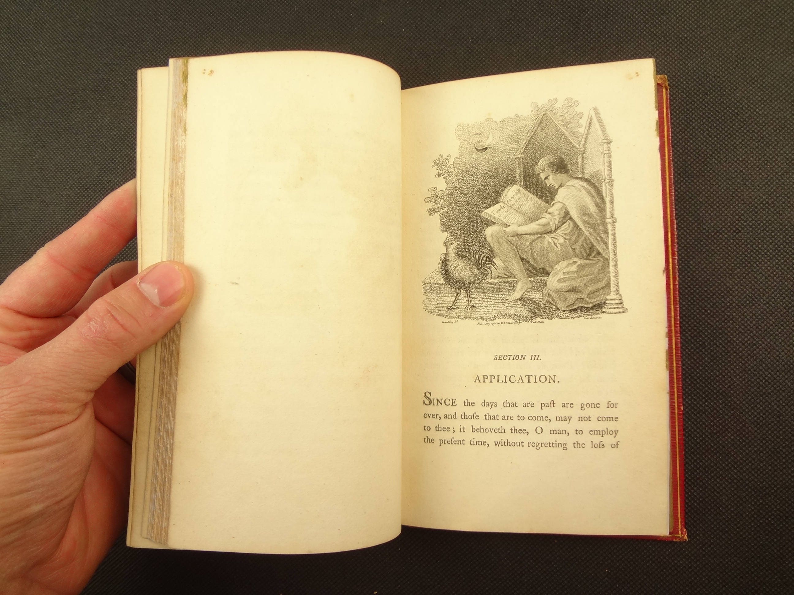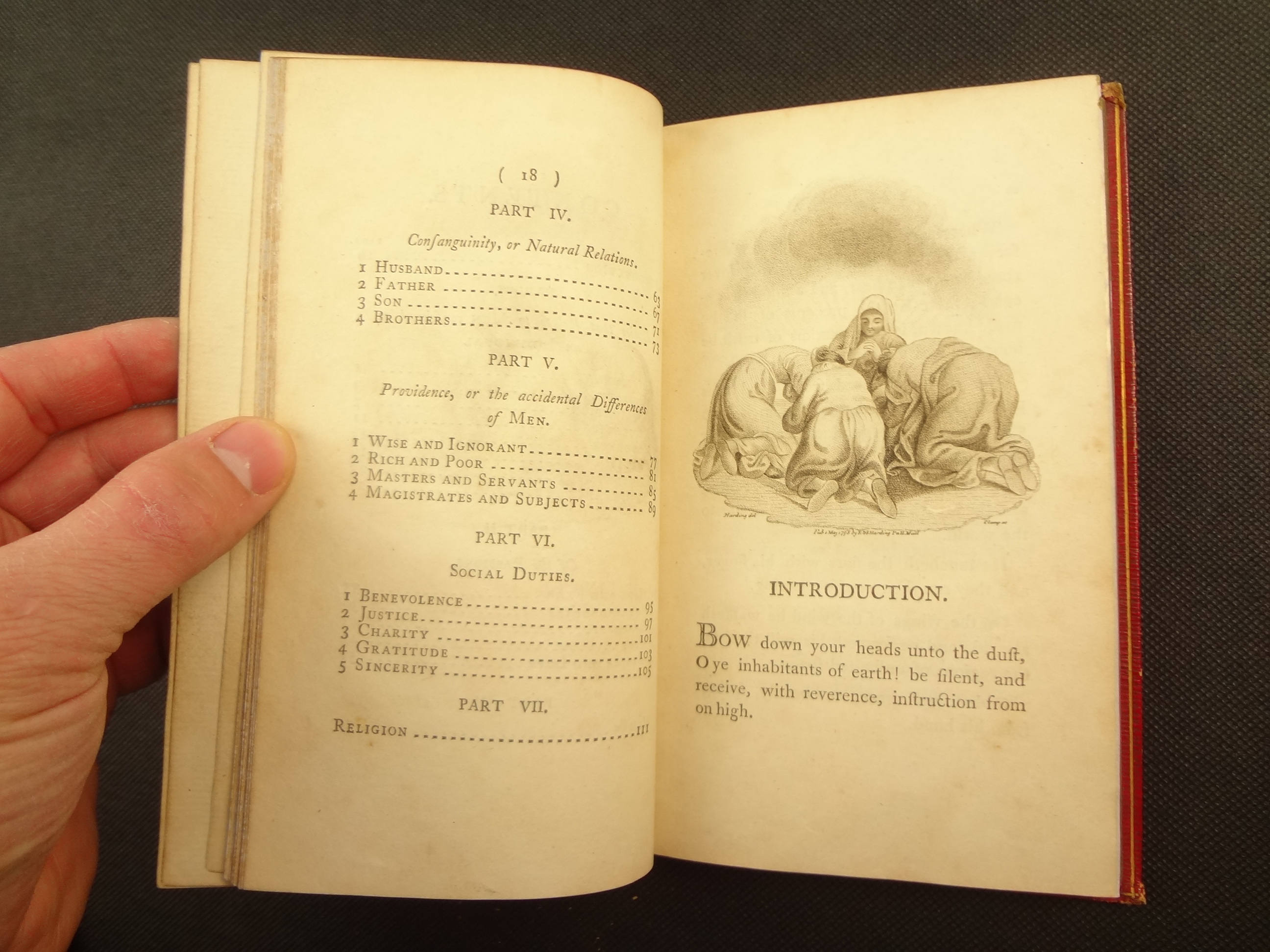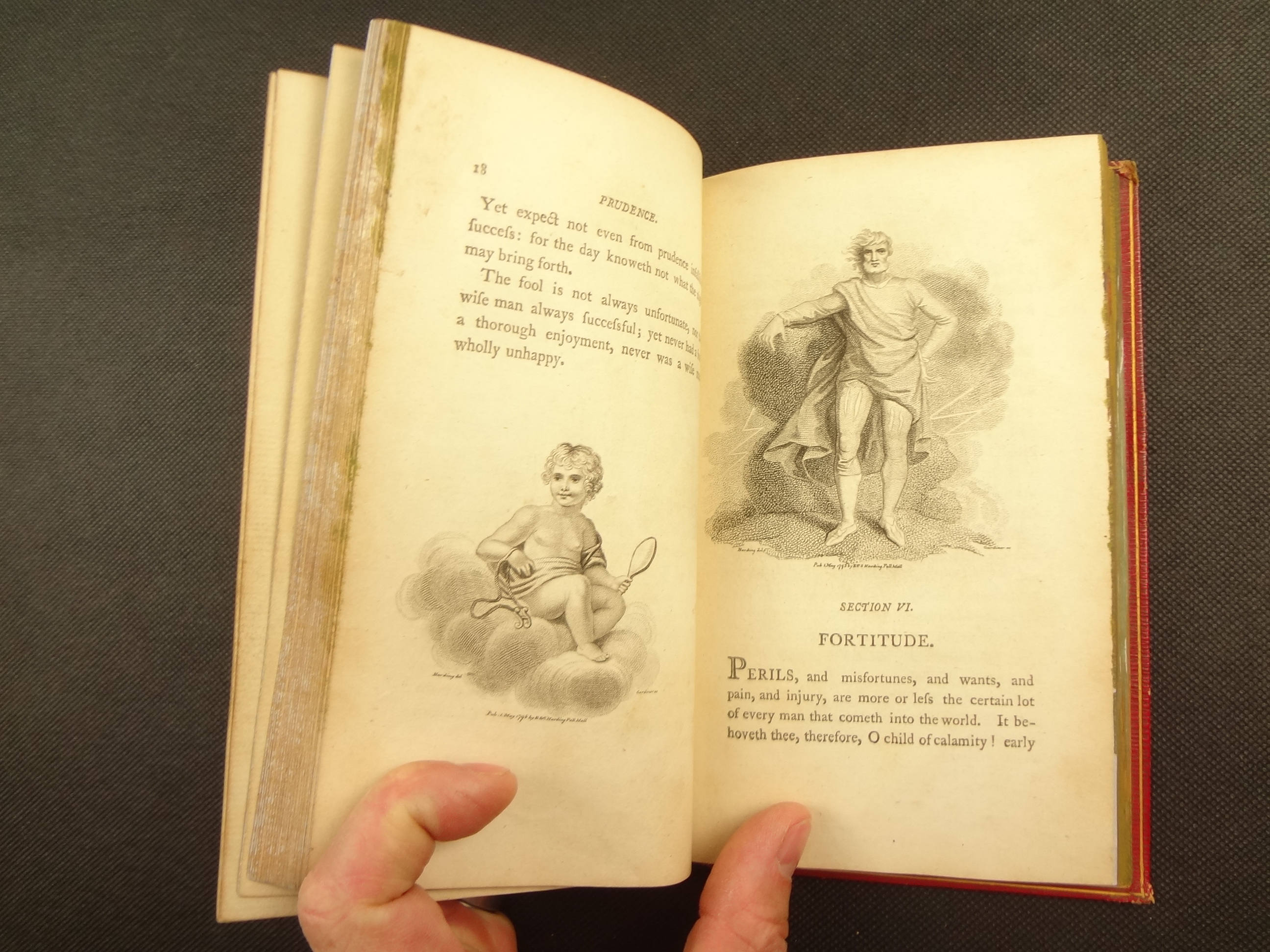 Two fore-edge paintings, by different artists, decorate these matching attractive bindings. The ex libris in Merrick's Psalms reveals these volumes were bound for the Earl of Harcourt, George Harcourt. Both might be categorized as religious; Merrick's 1805 edition of his rhyming Psalms (quite beautiful) easily applies as religious, but the second book is a translation "from an Indian Manuscript", titled The Economy of Human Life ("To which is prefixed an account of the manner in which the said manuscript was discovered").