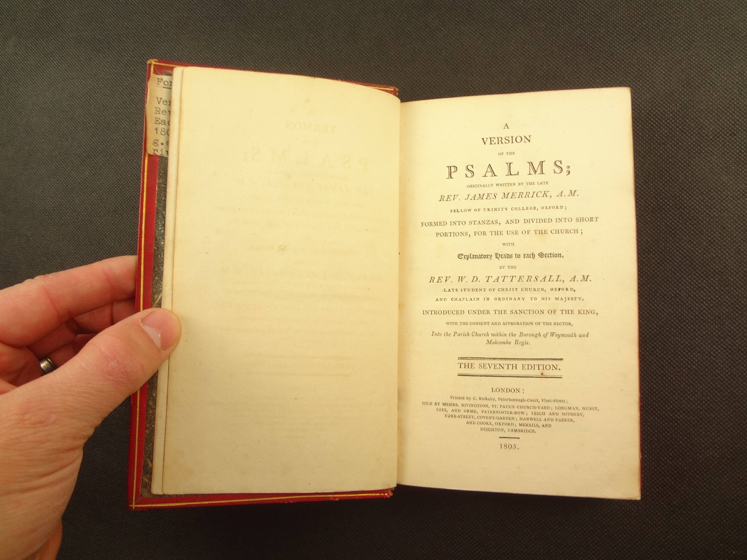The Psalms measures 18 x 11 x 3 cm; there are some gilt fillet borders, the title is in gilt, and the board edges are rolled in a gilt cord. The Psalms has all edges gilt (AEG) and marbled flyleafs. 389 numbered pages.