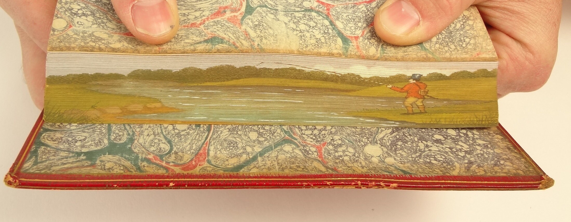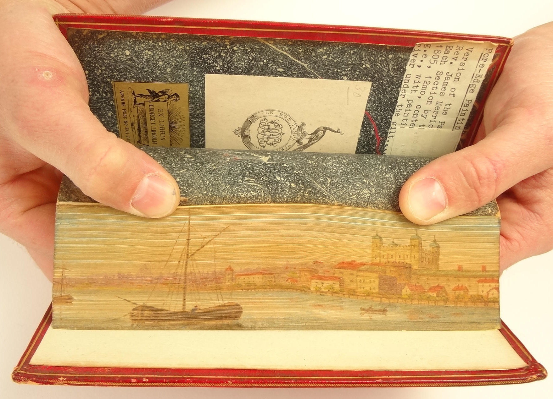The simpler fishing fore-edge painting decorates The Economy of Life. The second, more detailed fore-edge painting, revealing The Pond and the Tower of London, decorates the Psalms of Merrick. The Psalms were sold by Longman, Hurst, Rees and Orme, from whom it is not uncommon to find fore-edge paintings.