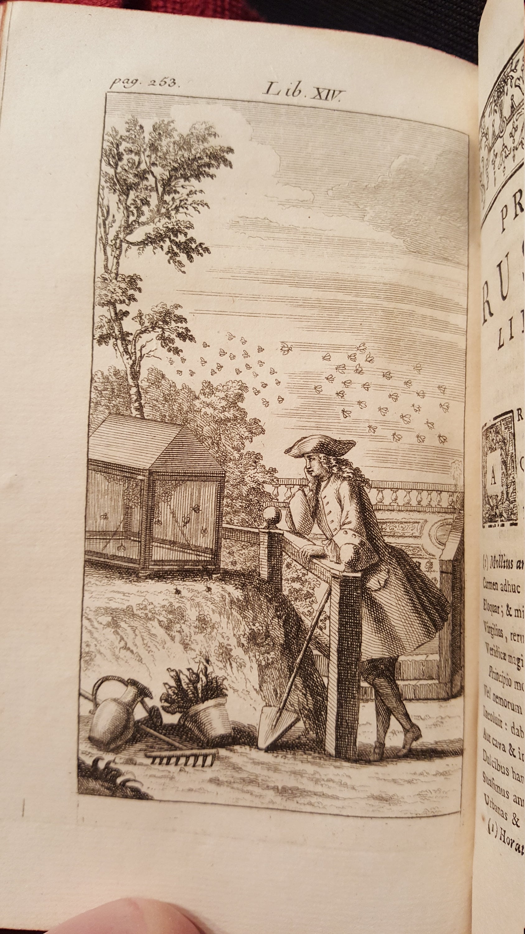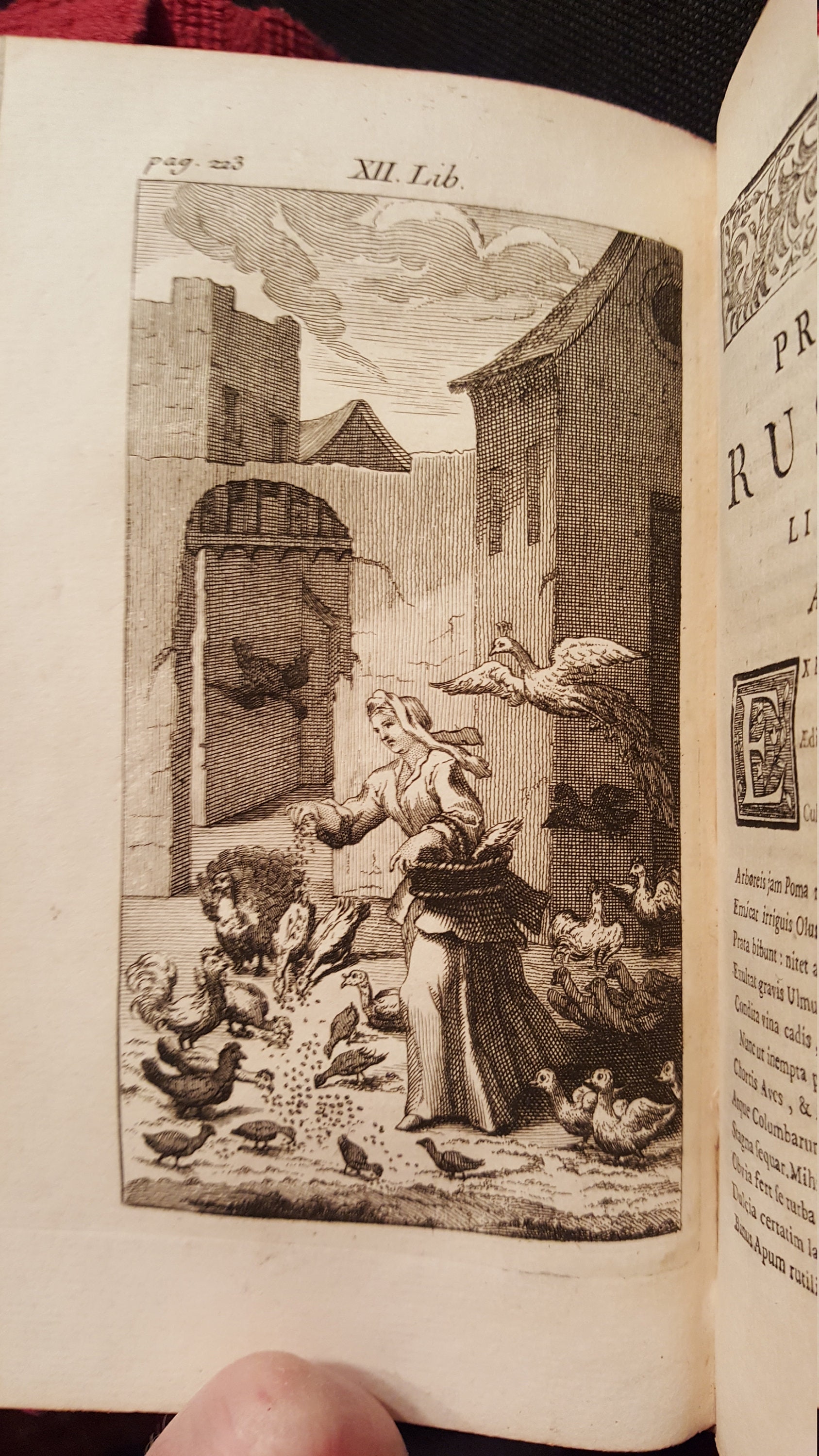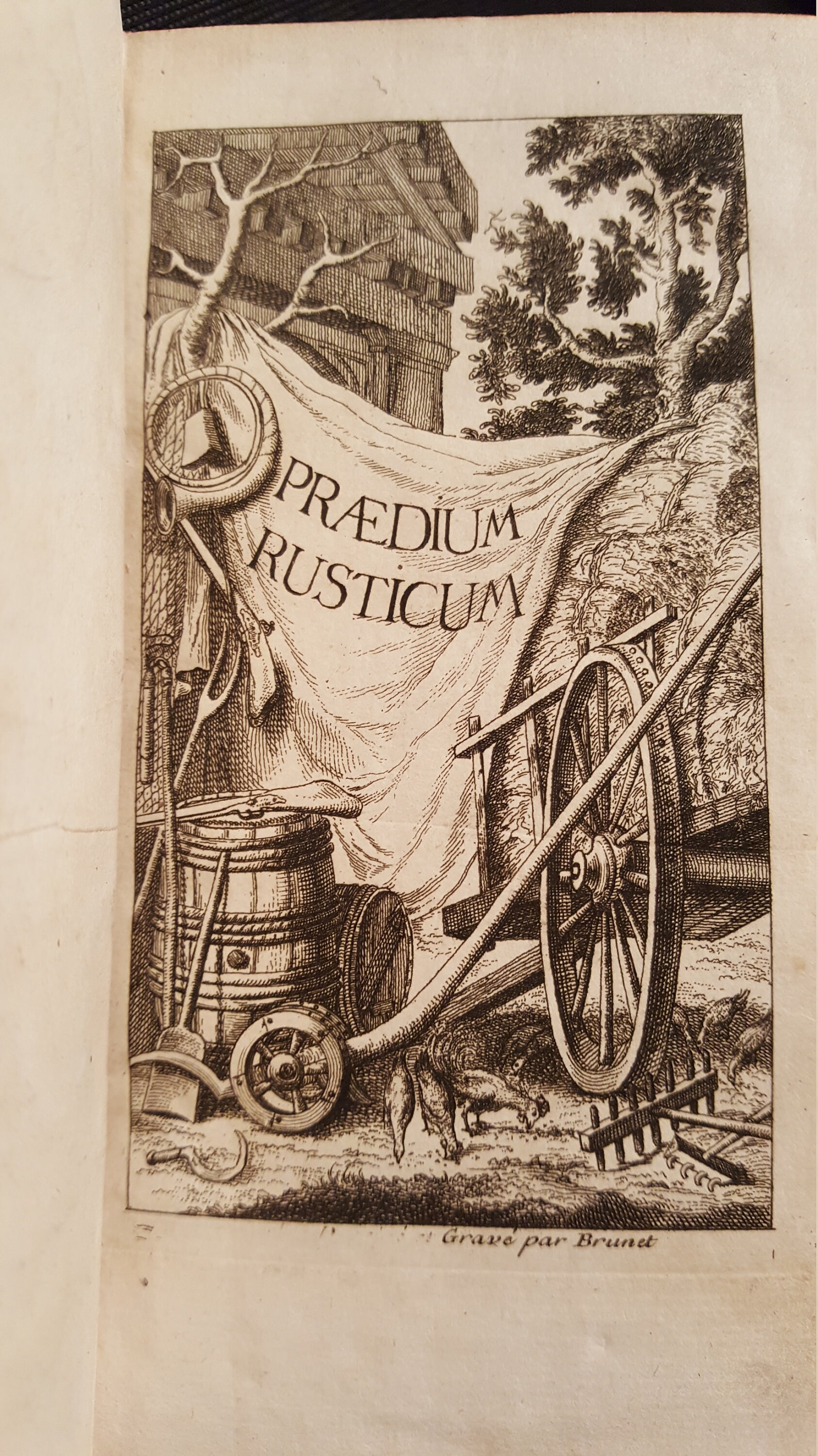A handsome french binding, housing a beautiful antiquarian work praising the countryside, with 17 equally attractive woodcut illustrations. Praedium Rusticum , in 16 books, where Jacques Vaniere sings the work and the pleasures of the countryside. "In this poem, he has approached the skill of the author of the Georgics, as much as could any modern." - Universal Dictionary of History and Geography 1878