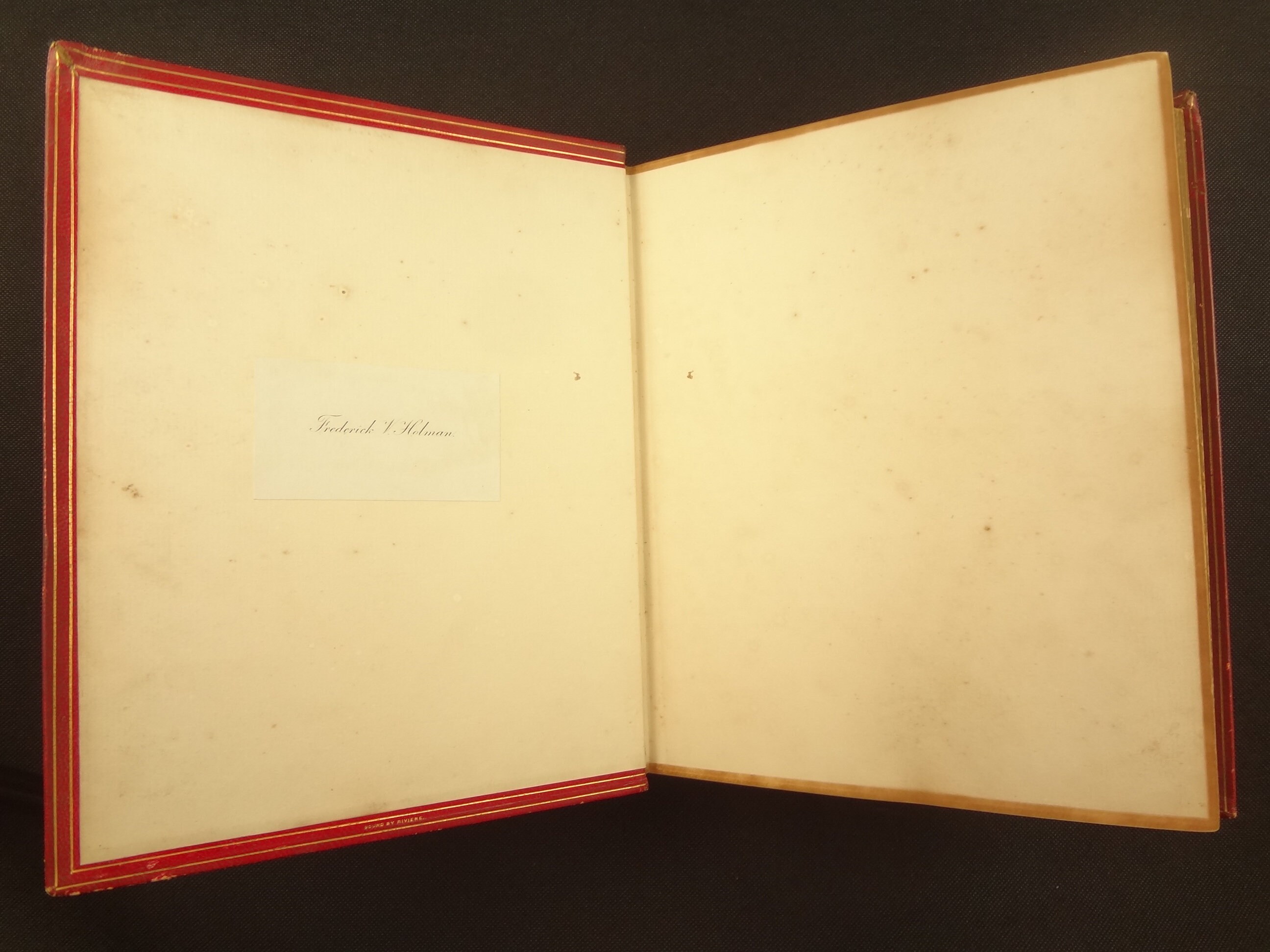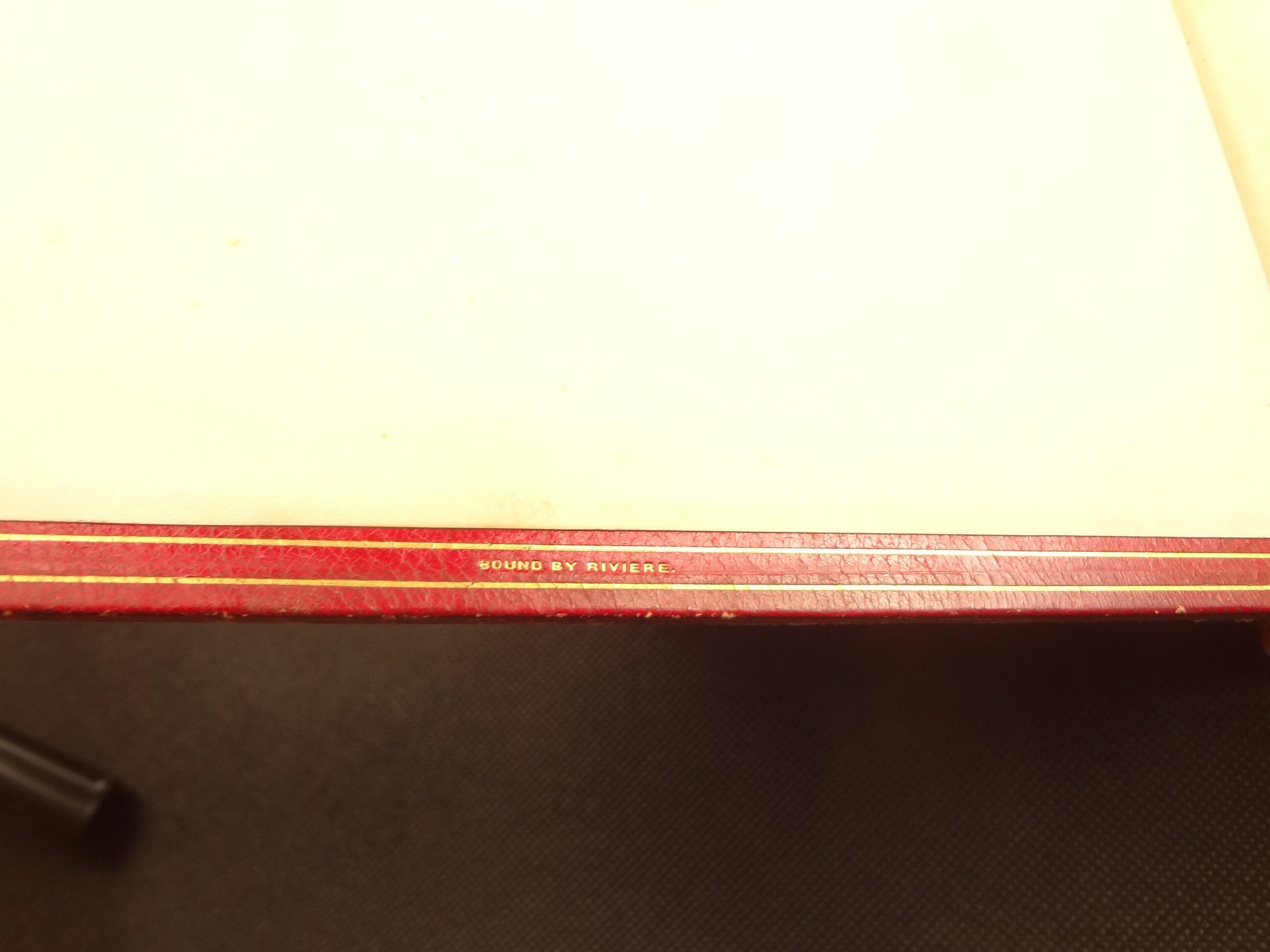 Measures 25 x 21 x 5 cm. Leather fine binding with five raised cords on spine; gilt ruled compartments with one compartment containing the title in gilt. Boards have a mix of blind and gilt stamped tooling. Board edges are ruled in gilt, as are the turnins. According to Biblio, because the binding is stamped "Bound by Riviere" you can date it before his son took over. All edges gilt (AEG). Pages - 540 numbered pages.