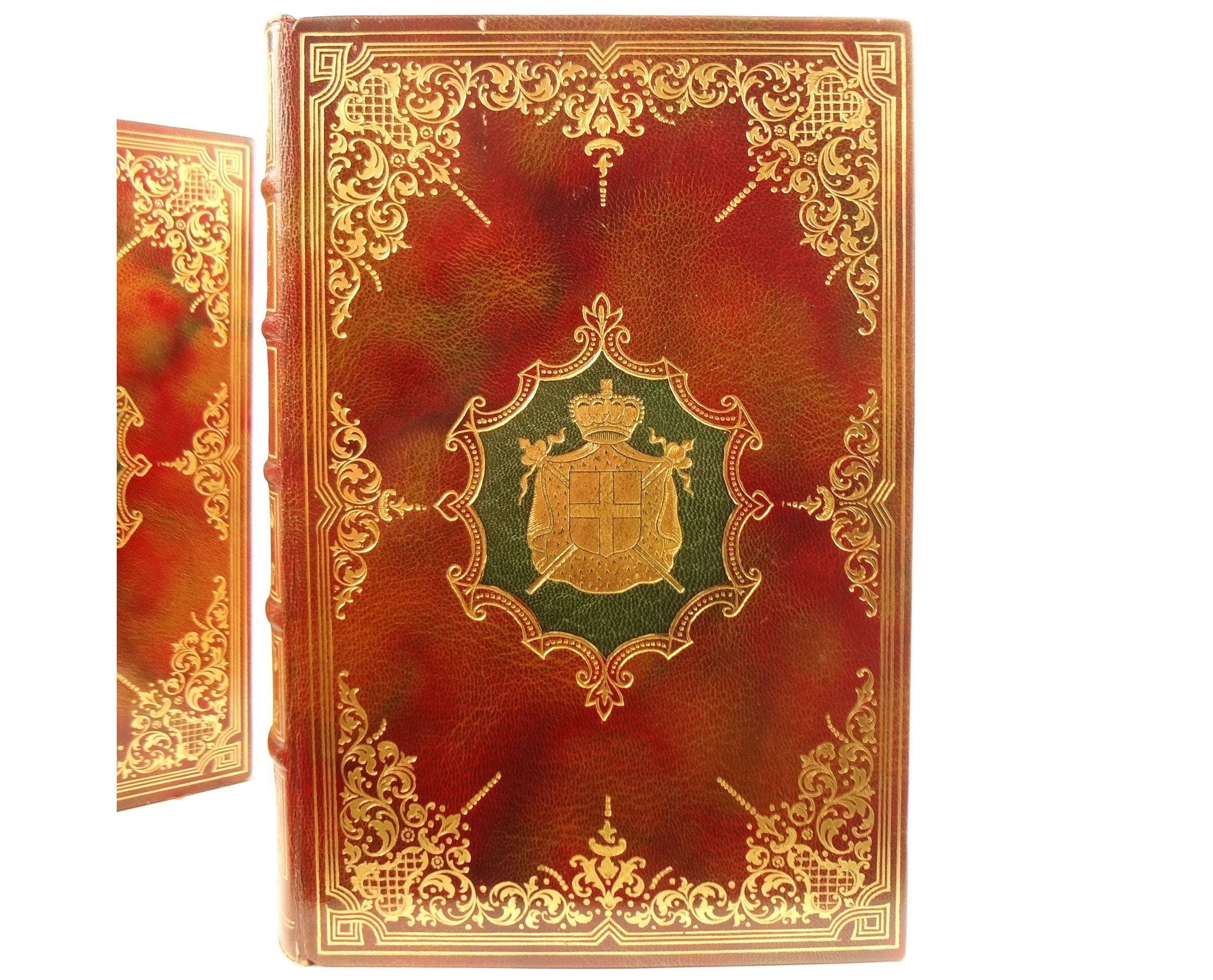 "World's Famous Places and Peoples. Illustrated with beautiful full-page colored plates , on Japan paper. Edition des Aquarelles. Limited to twenty-six registered and lettered sets, of which this is Letter (E). Full variegated colored polished calf, gilt backs, elaborate gilt sides, with emblematic crest, in gold, on green levant onlaid, white levant doublure inlaid, elaborately gilded, with broad gold borders, Morris paper fly-leaves, top edges gilt, uncut." - p.117, The Magnificent Library of the Late Howard T. Goodwin, 1903