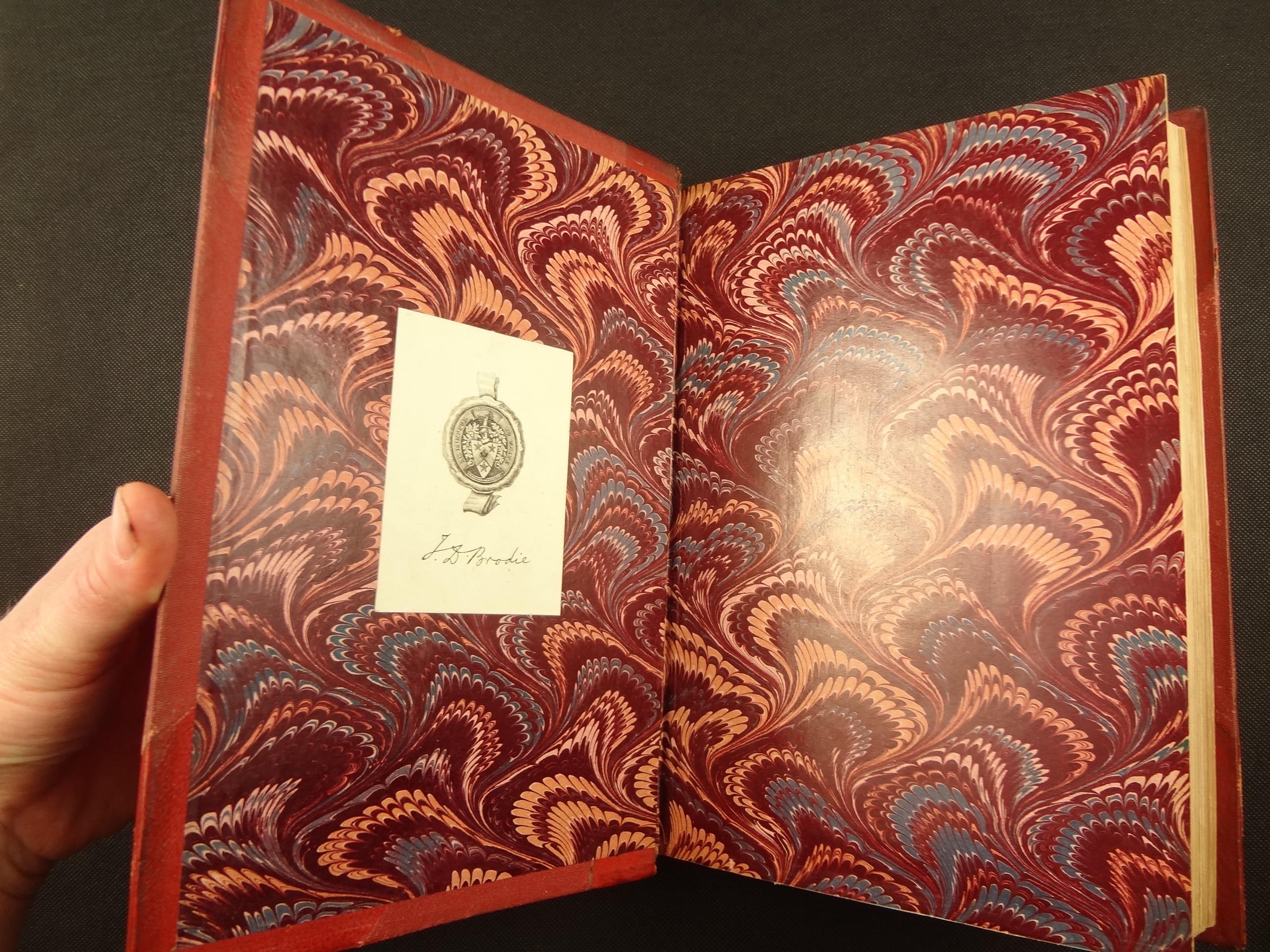 See pictures. For their age, they are in a nice condition with only minor things to note. Spines slightly sunned with lightest hints of cracks in leather. Some edge wear (board edges, ribs, etc.). Some board and spine rubs. General shelf wear. Bookplate on each pastedown "J.D. Brodie, Be Mindful to Unite". Pencil notes on the back of the flyleaf of volume one. Volume one has some light foxing spots on the 1/2 title page and the back of the frontis illustration; through the rest of the novels I found this once more at volume 5. Also, there is an occasional spot here or there (very minor, plates sometimes at edges) throughout. Volume one also has the ghost of an insert on page 185. Occasional dog eared page. Occasional light toning to pages. Volume 6, page 527 has the marks of four fingers in the fore-edge margin. Not all tissues present. Overall, they are a handsome set, well-bound, and ready to give many more generations pleasure.