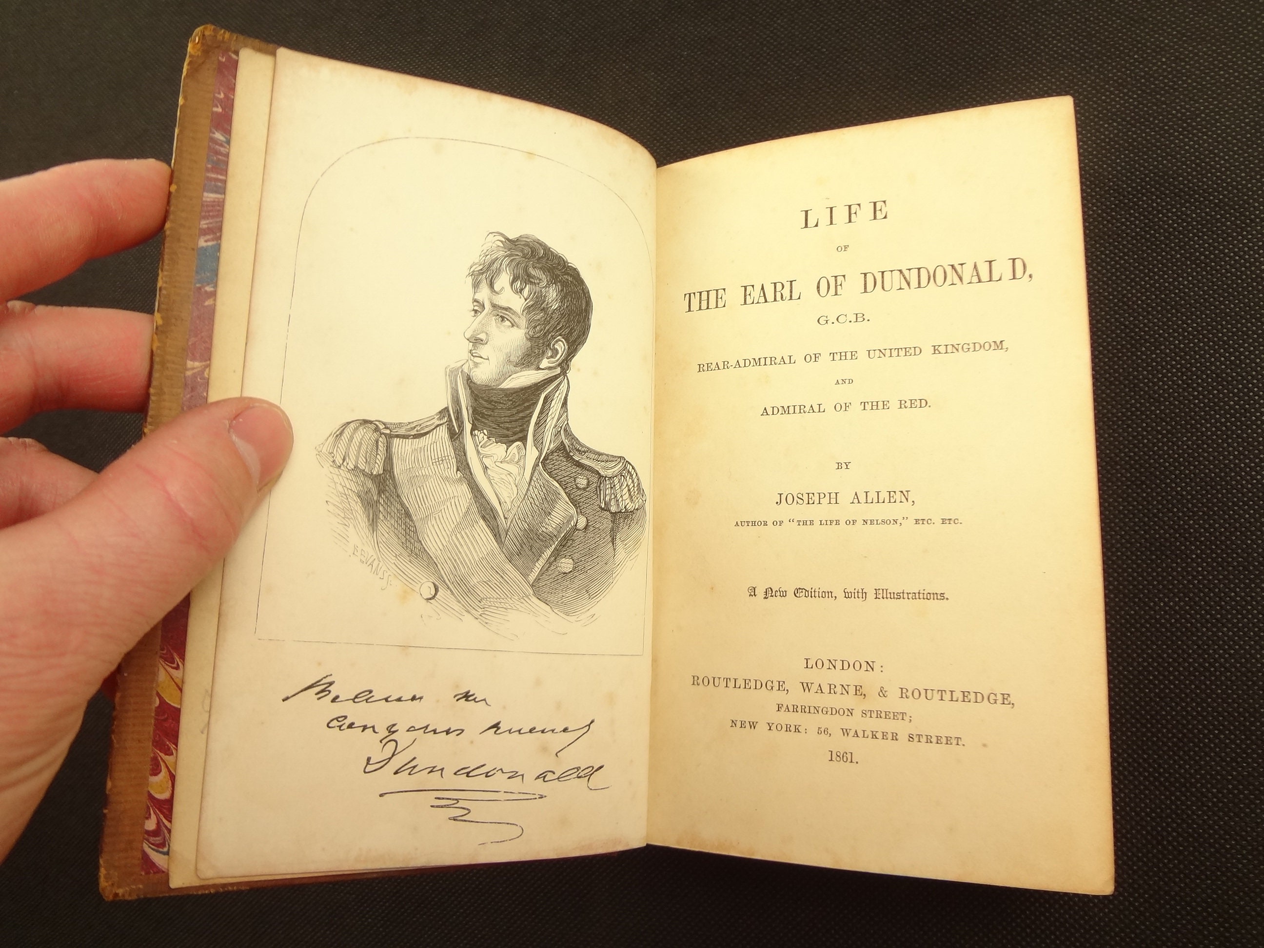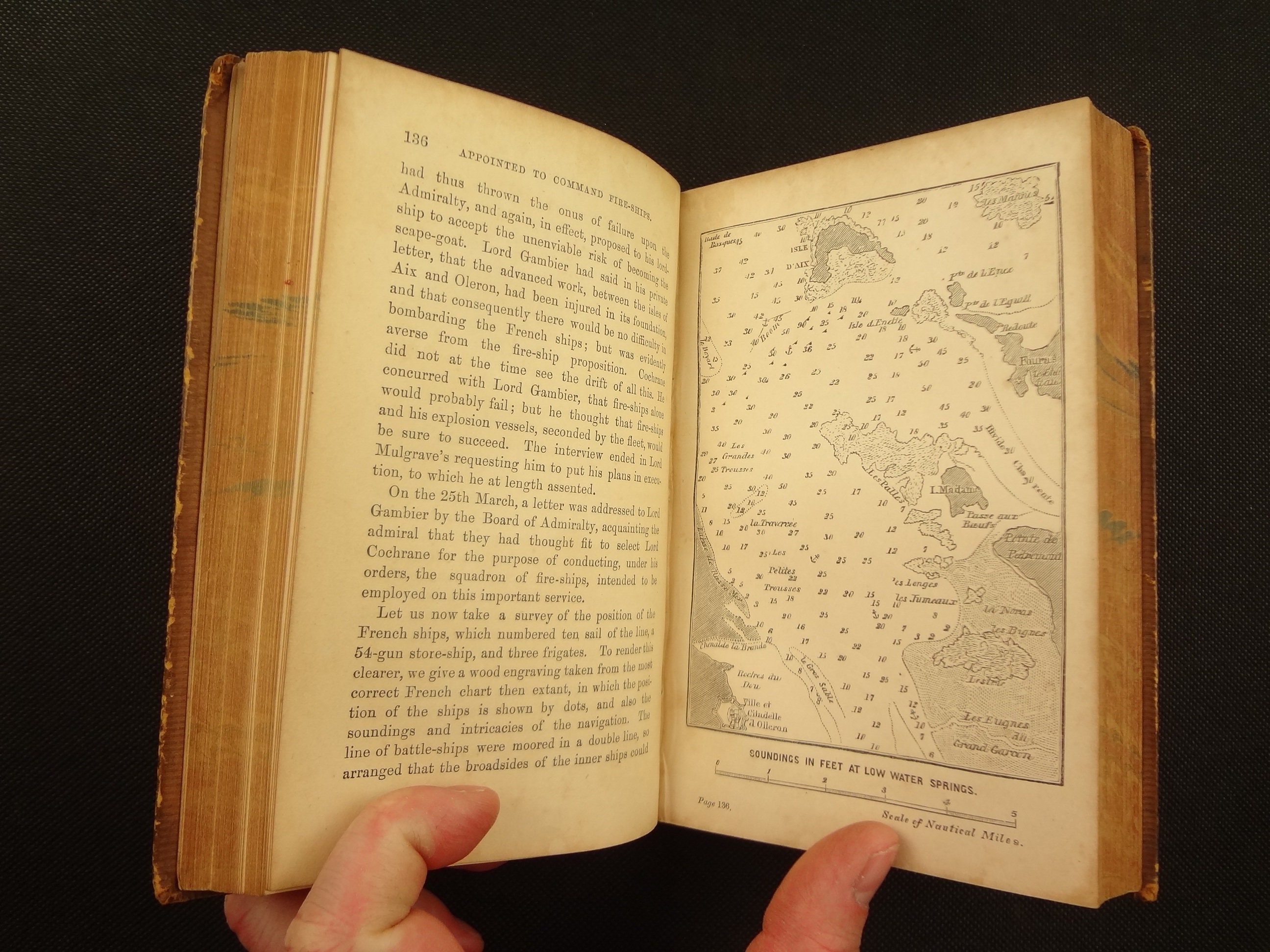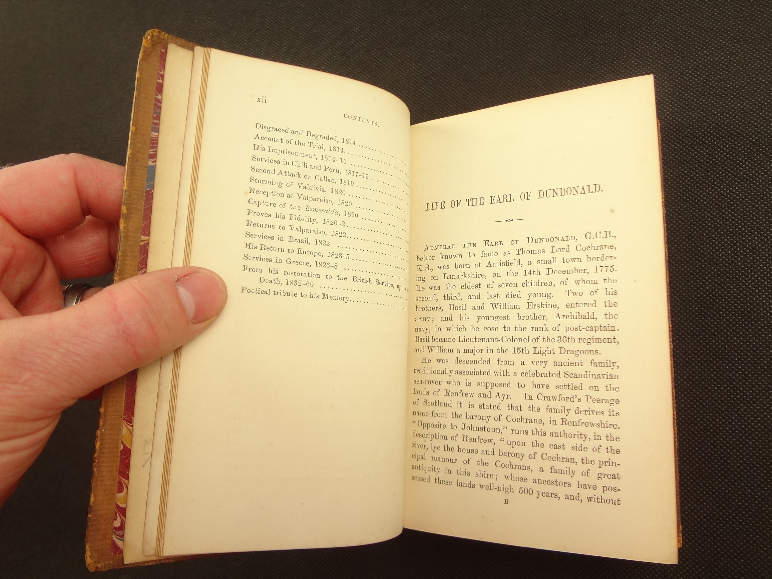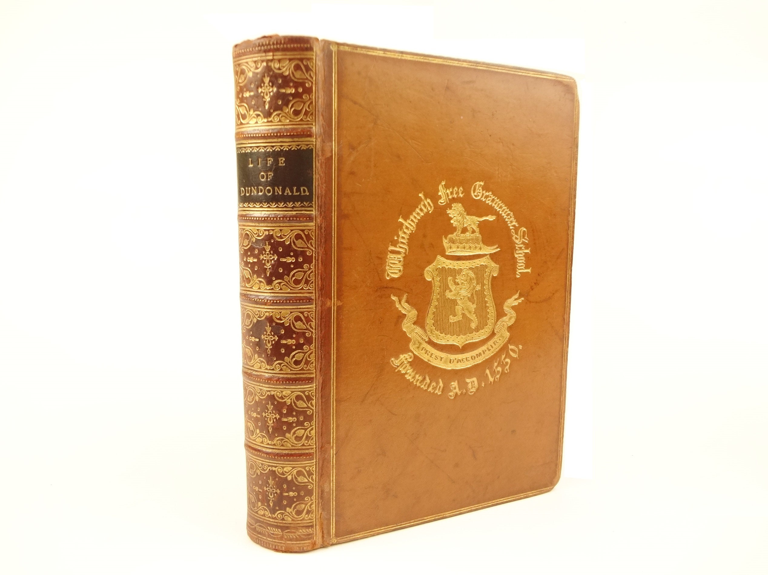 A handsome prize binding decorates this biography of The Earl of Dundonald, nicknamed by Napoleon "The Sea Wolf", Rear-Admiral of the United Kingdom, who was successful in virtually all of his naval actions, his career being ended only by a stock exchange scandal. He is described as a "daring and succesful Captain of the Napoleonic Wars".