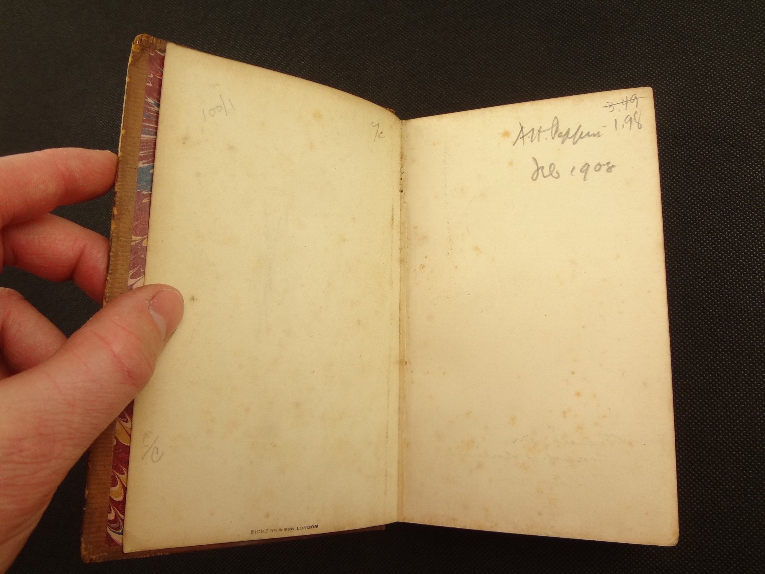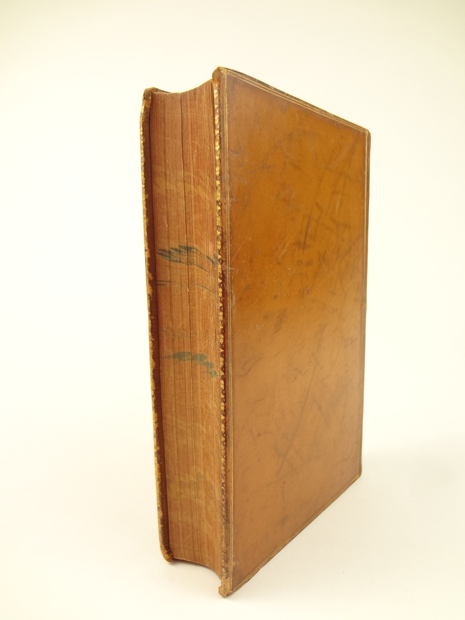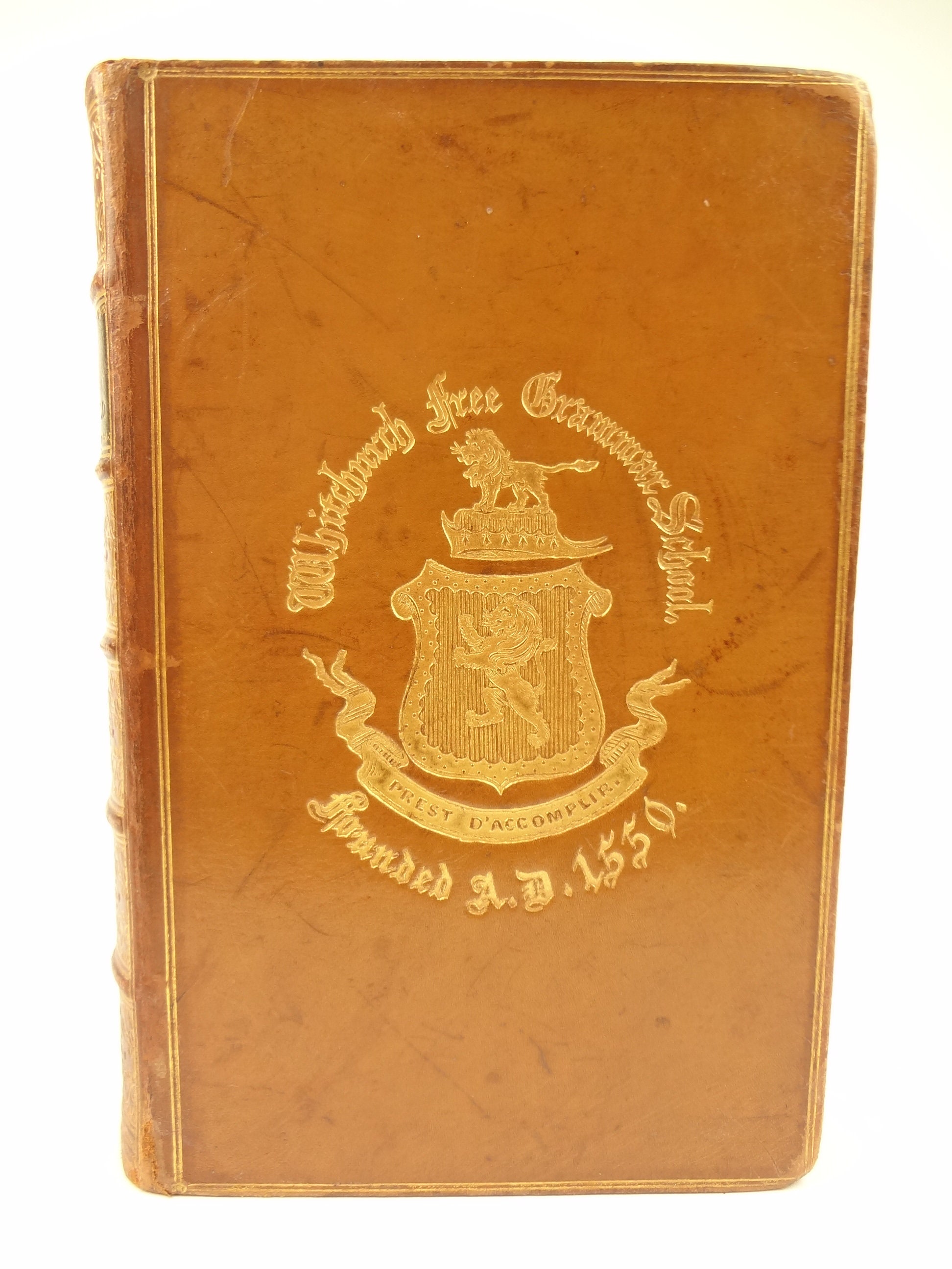 Measures 17 x 11 x 3 cm. Full leather binding. Five raised bands to spine, title in gilt on black Moroccan in one compartment; others have a central floret surrounded by sprays and are ruled in gilt. Boards are ruled in gilt, center medallion armorial of Whitchurch Free Grammar School. All edges marbled. Marbled endpapers. Pages - frontis, xii, 362 (1).
