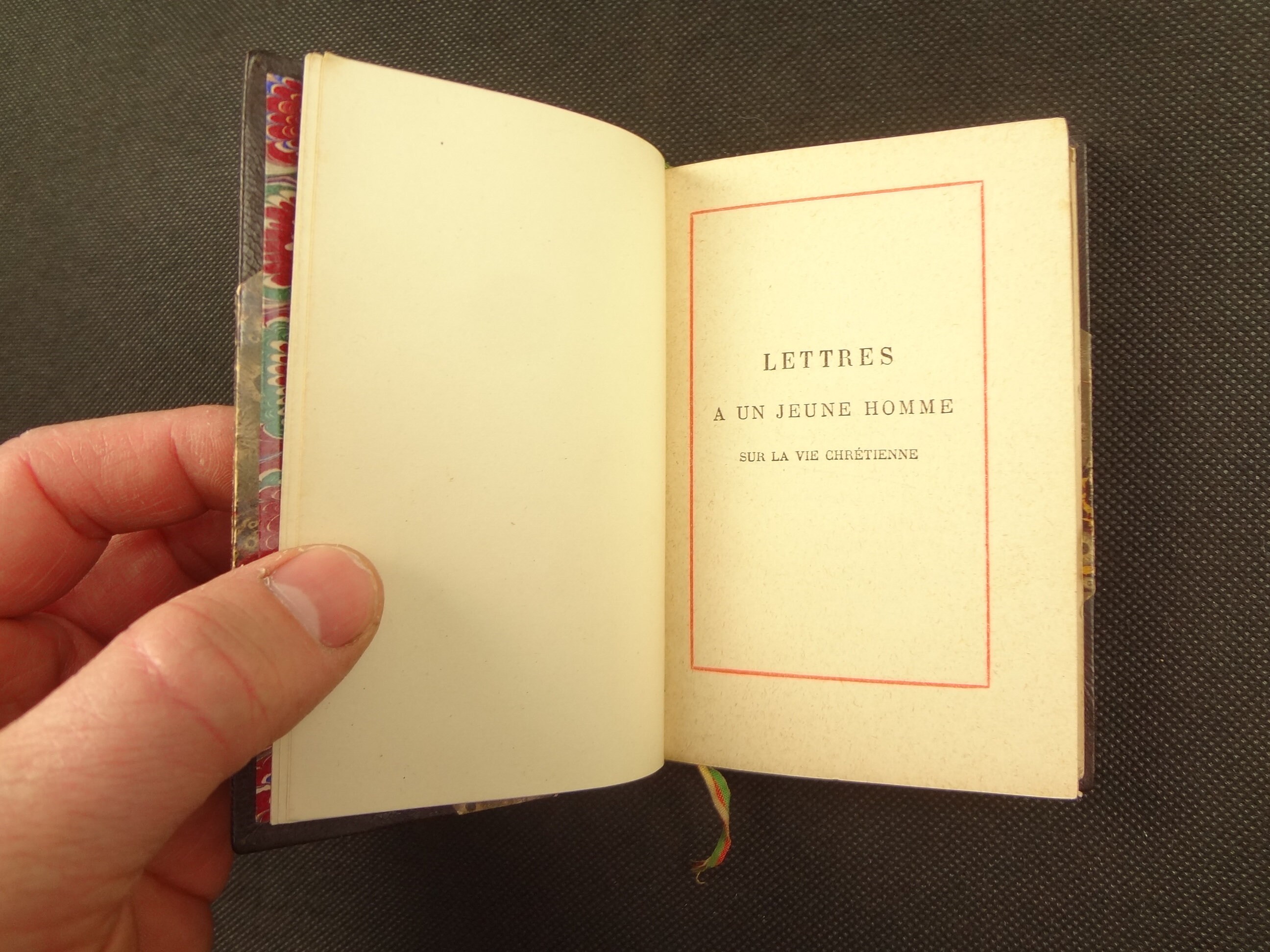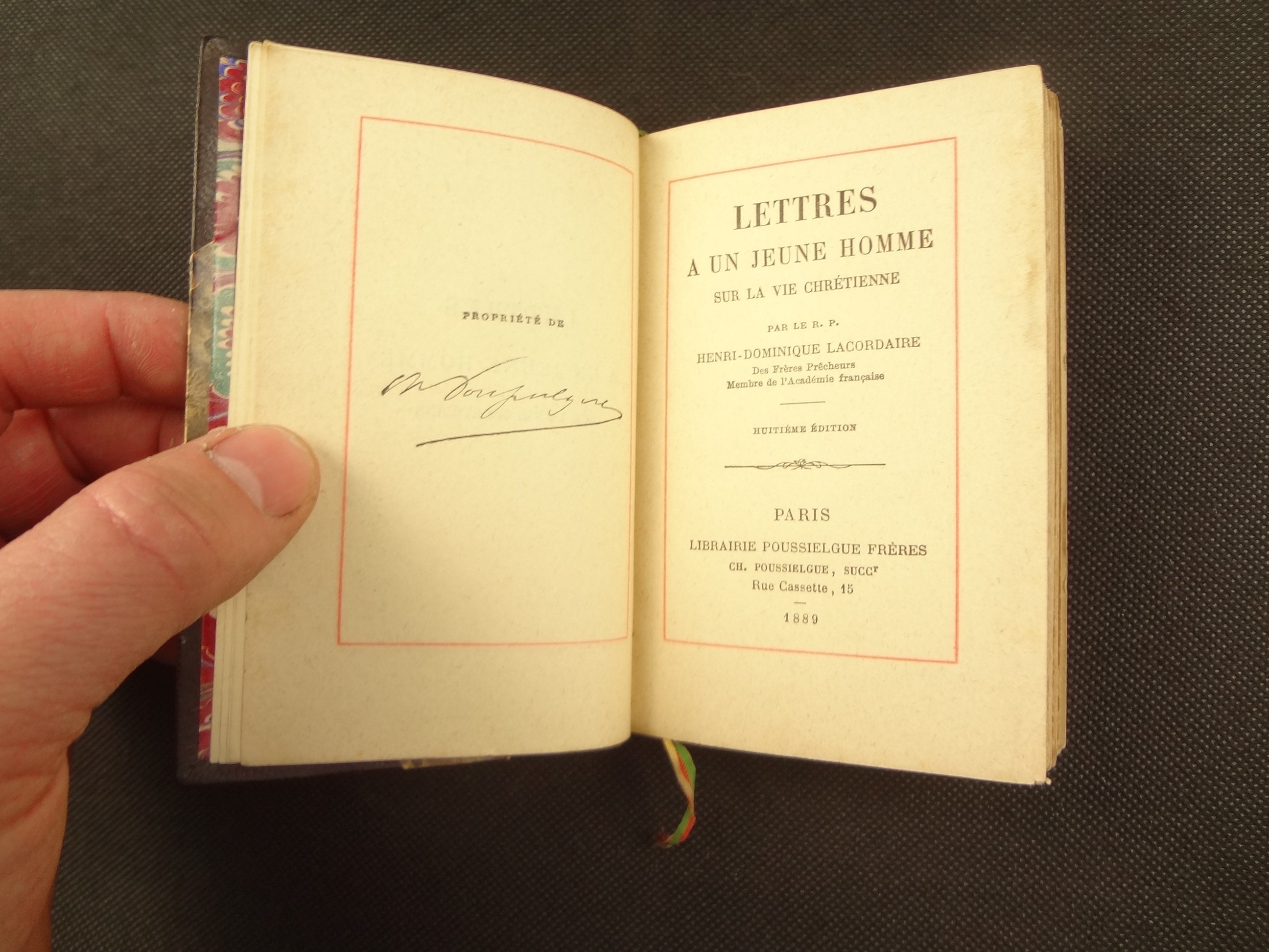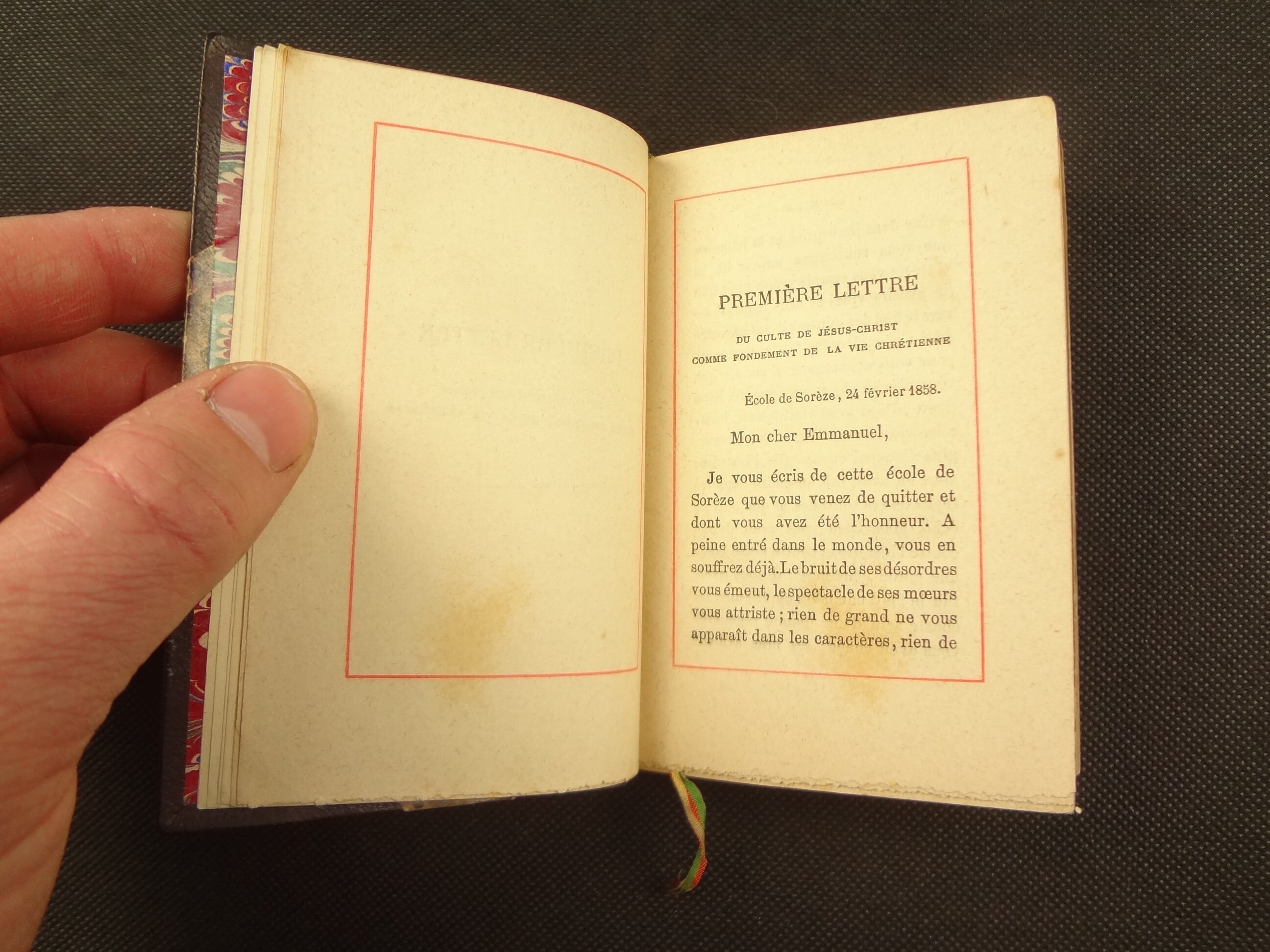 A very handsome, if watchful, little fine binding graces this petite printing of a 19th century French work from a well-regarded orator and preacher Jean-Patiste Henri-Dominique Lacordaire.