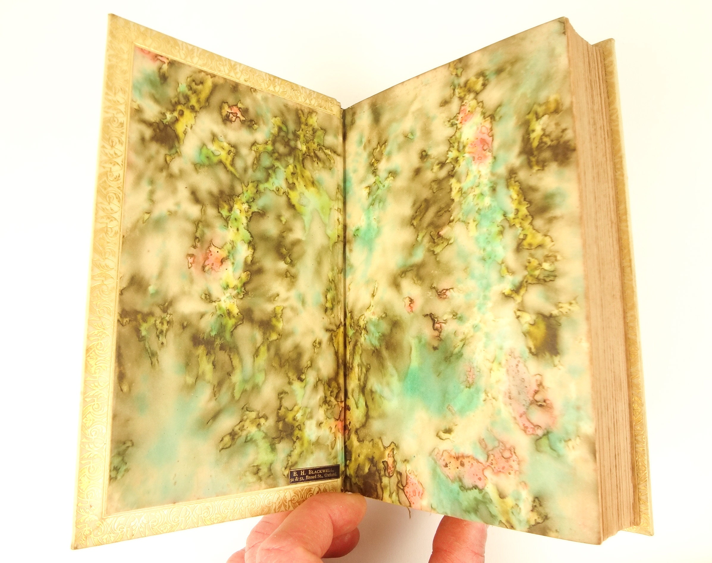 Measures 17 x 10.5 x 3.5 cm. Parchment over hardcovers. Boards are gilt ruled. Art deco style flower decoration in gilt on the spine; also the title in gilt on green Moroccan. Gilt roll decoration on the turn-ins. Decorative endpapers. Top edge gilt. Pages - (2), LXXXII, 403, (2).