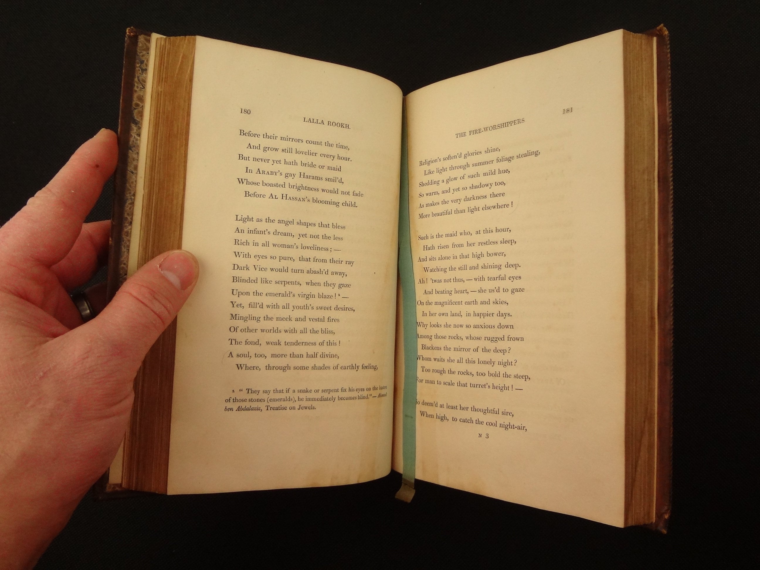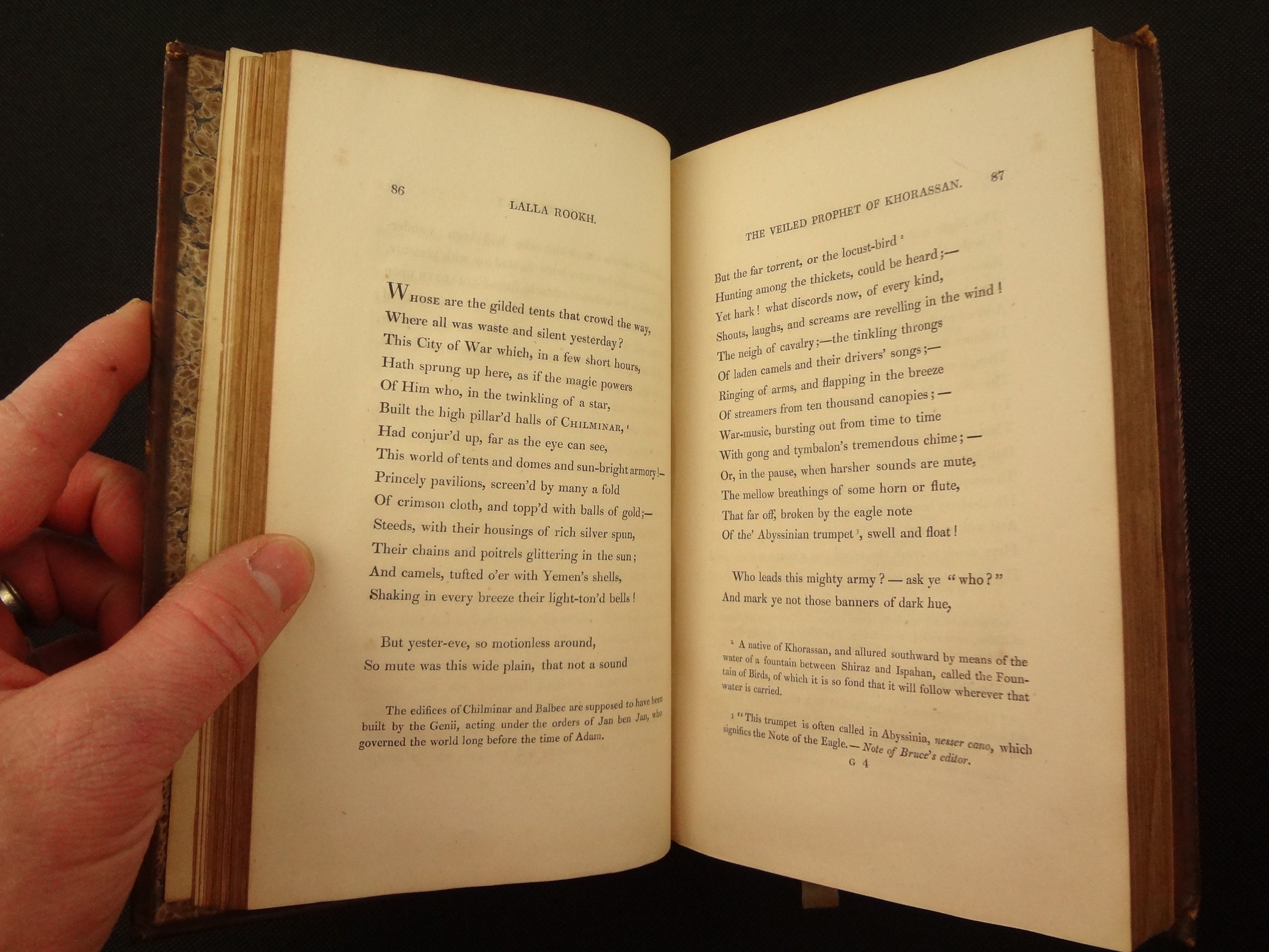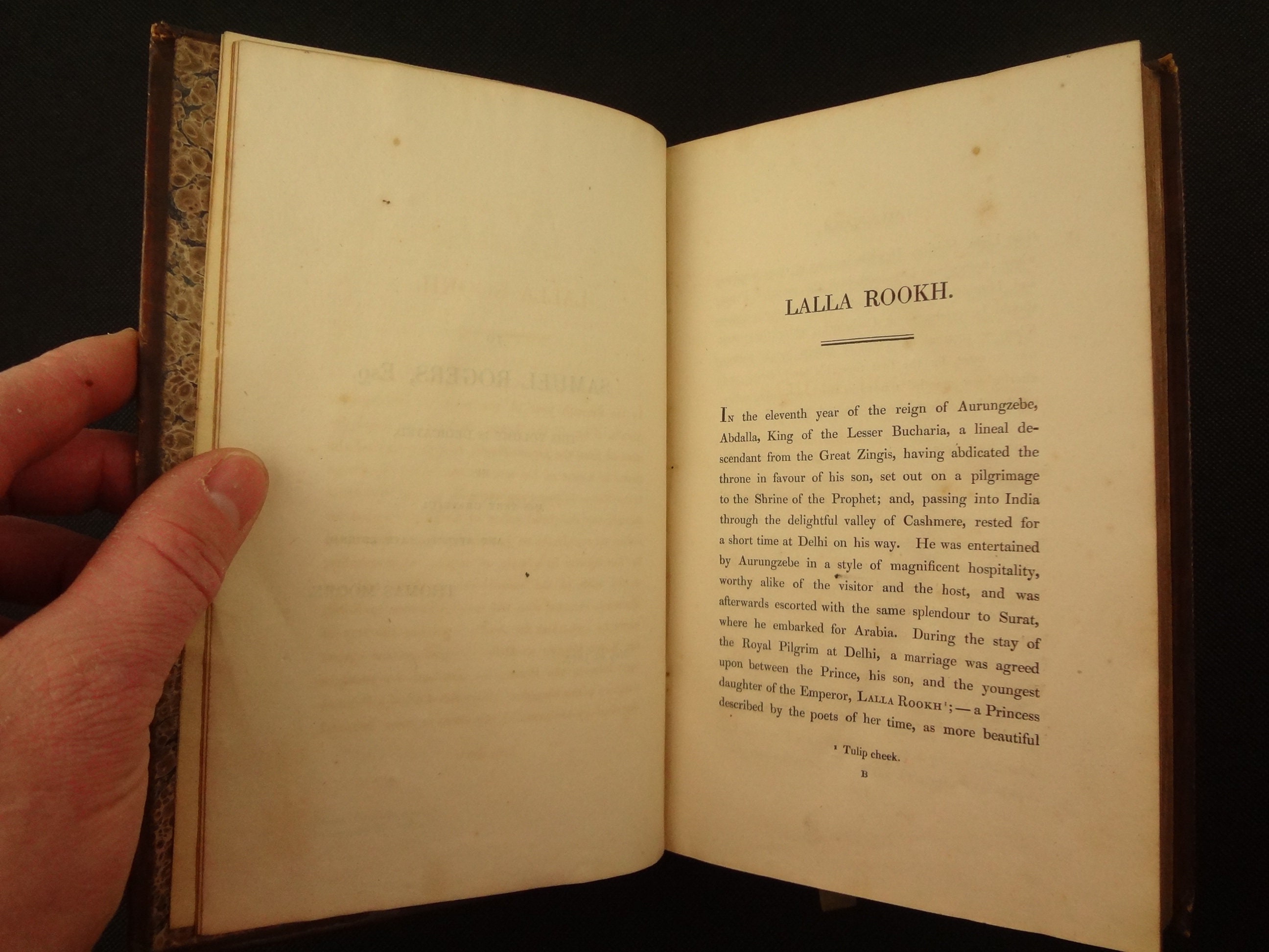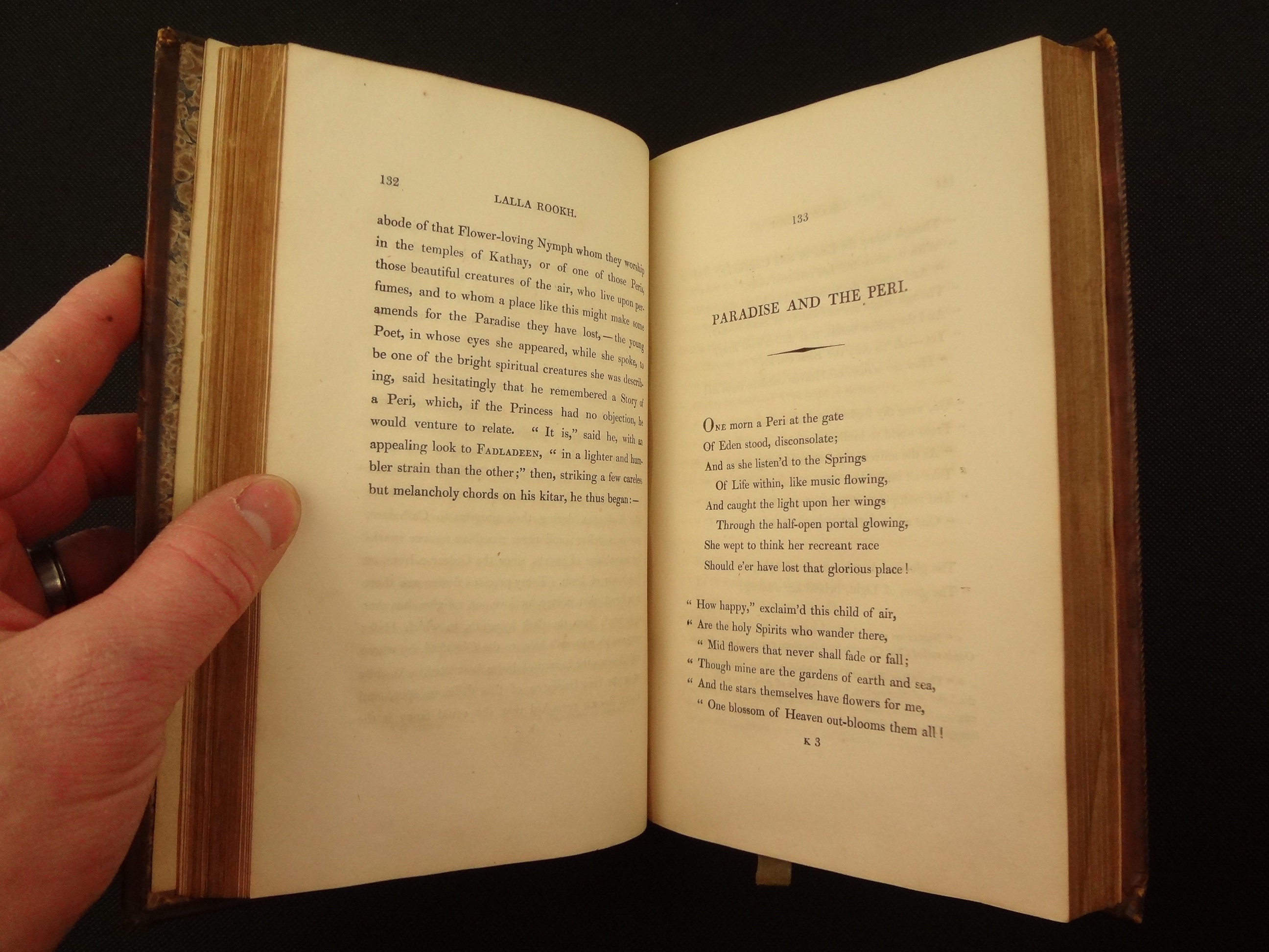 Measures approx. 21 x 13 x 3 cm. Calf, with four wide raised bands to spine. Five compartments of the spine have beautiful floret dentelle-like motifs, and one has "Lalla Rookh" in gilt. Boards are ruled in double gilt, with cross-hatch of blind ruling within the frames. Board edges rolled with gilt. Marbled endpapers. Pages - (2), iv, 397, (2).