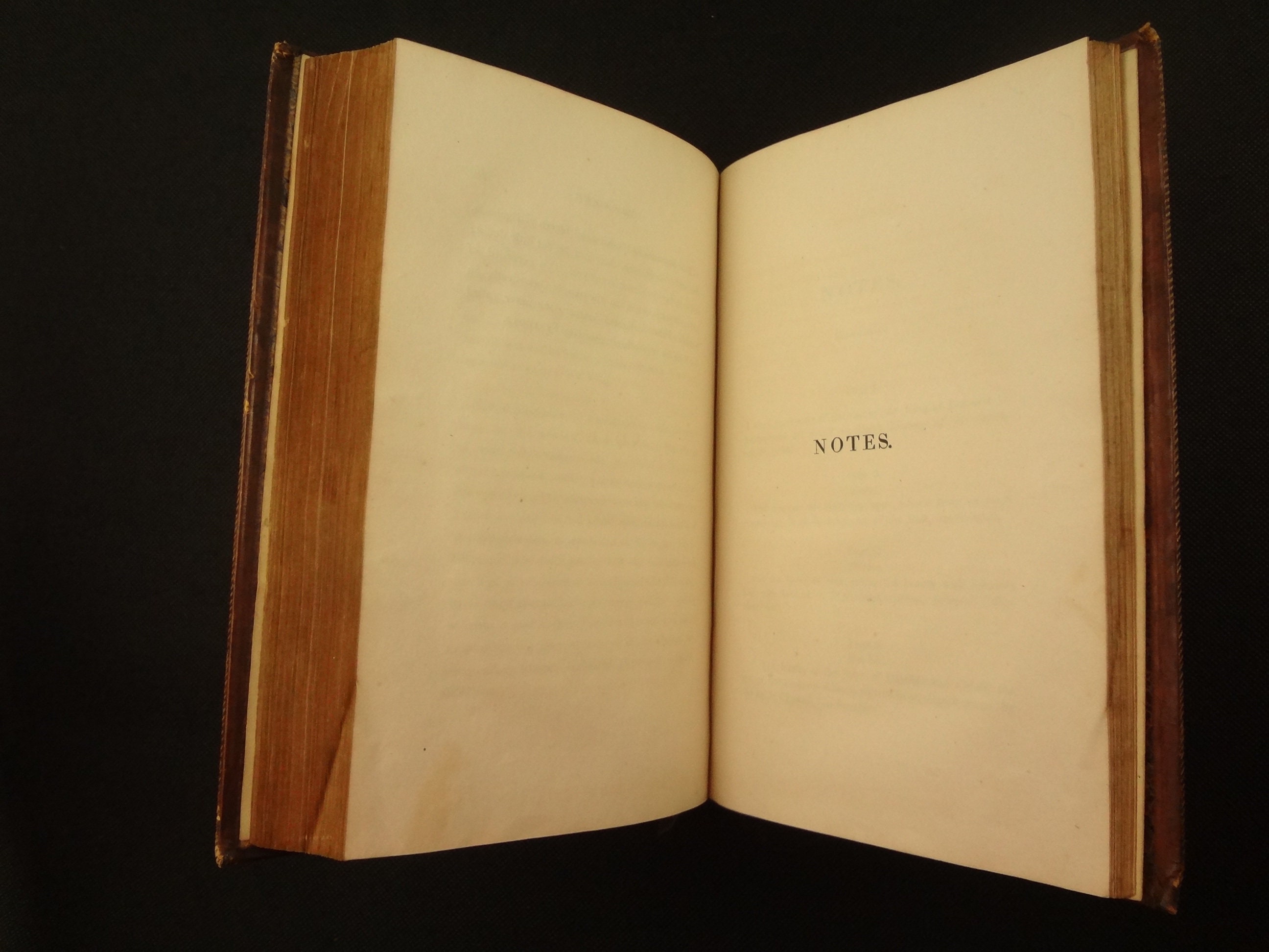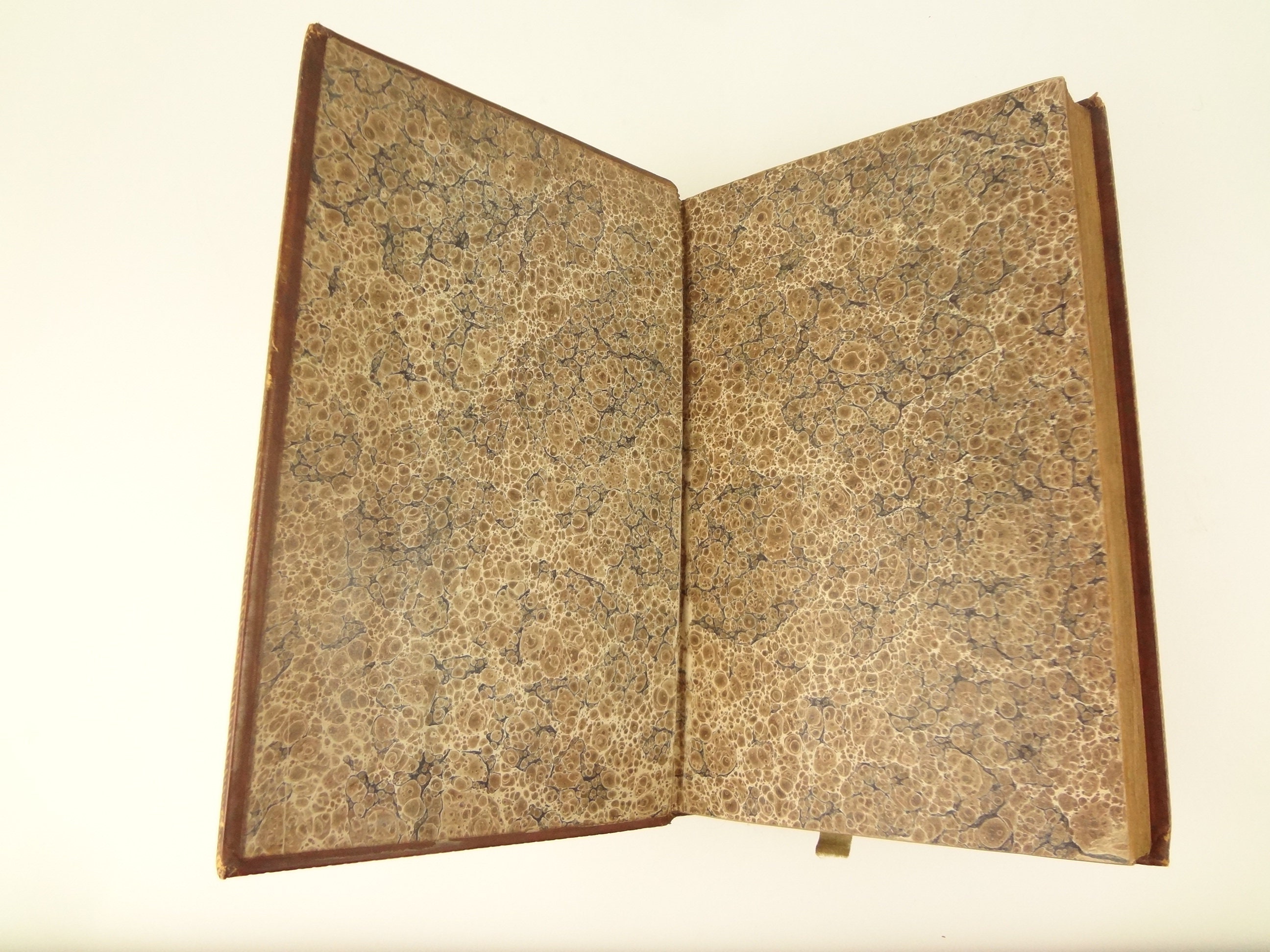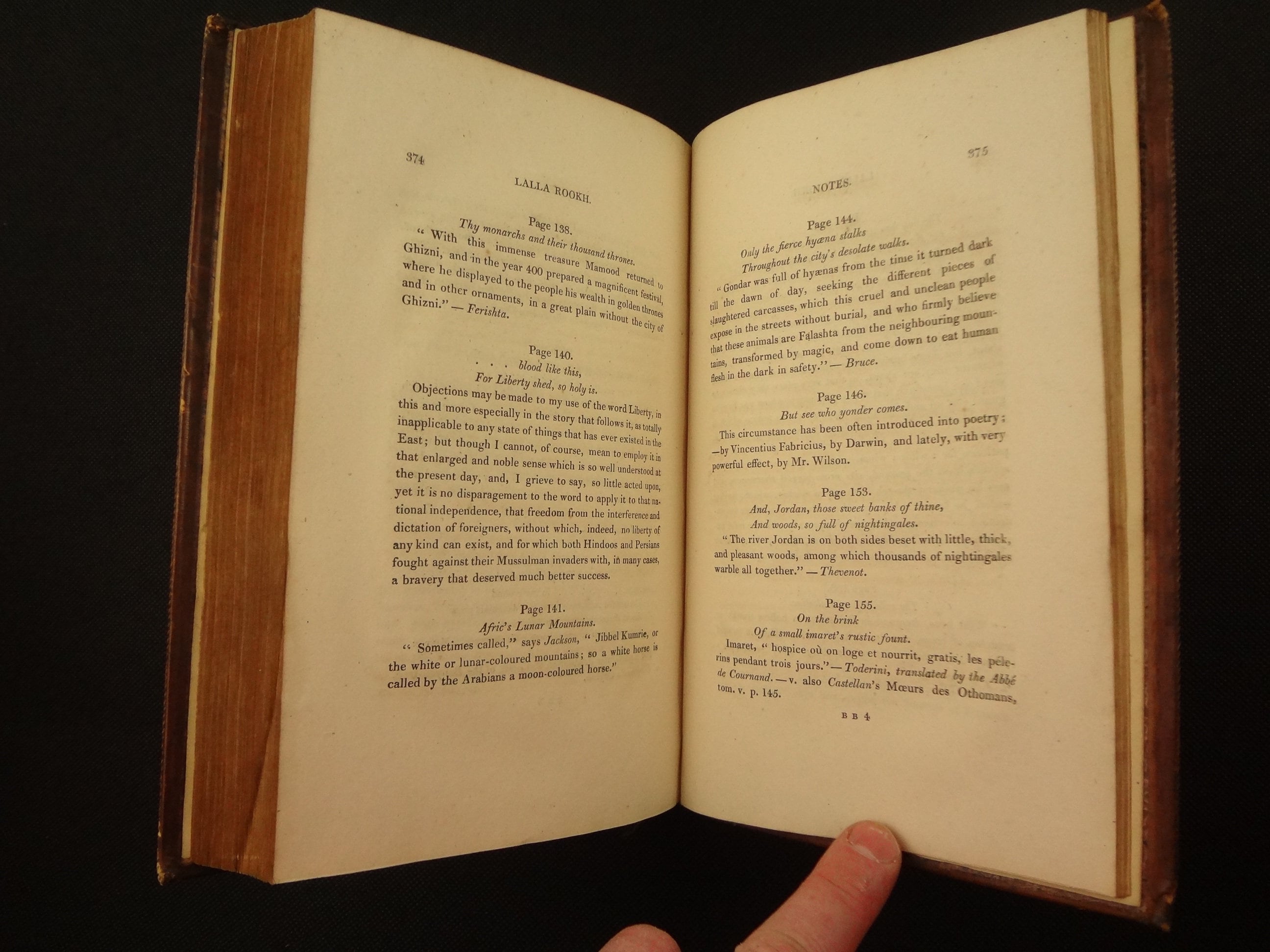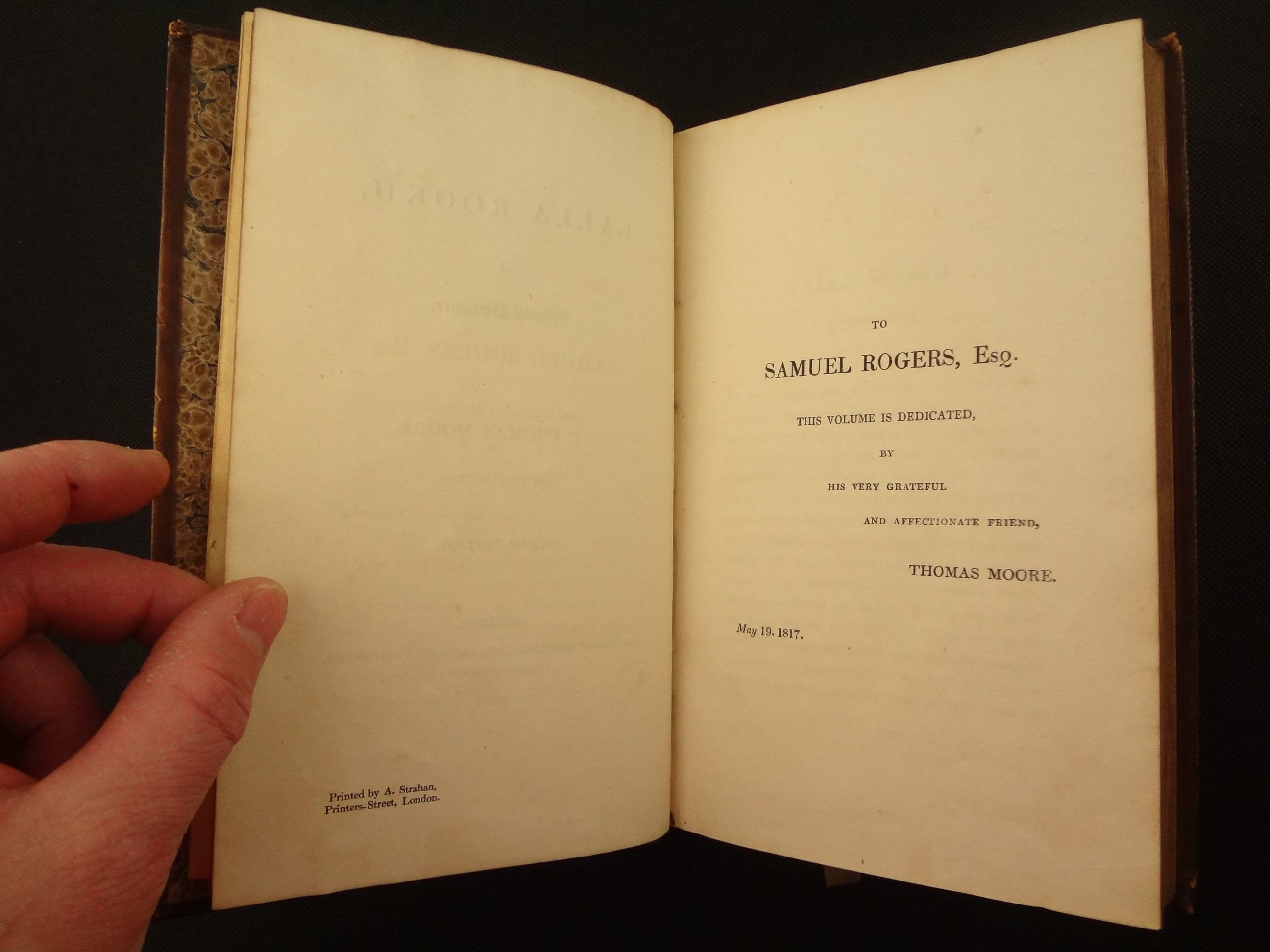 Measures approx. 21 x 13 x 3 cm. Calf, with four wide raised bands to spine. Five compartments of the spine have beautiful floret dentelle-like motifs, and one has "Lalla Rookh" in gilt. Boards are ruled in double gilt, with cross-hatch of blind ruling within the frames. Board edges rolled with gilt. Marbled endpapers. Pages - (2), iv, 397, (2).