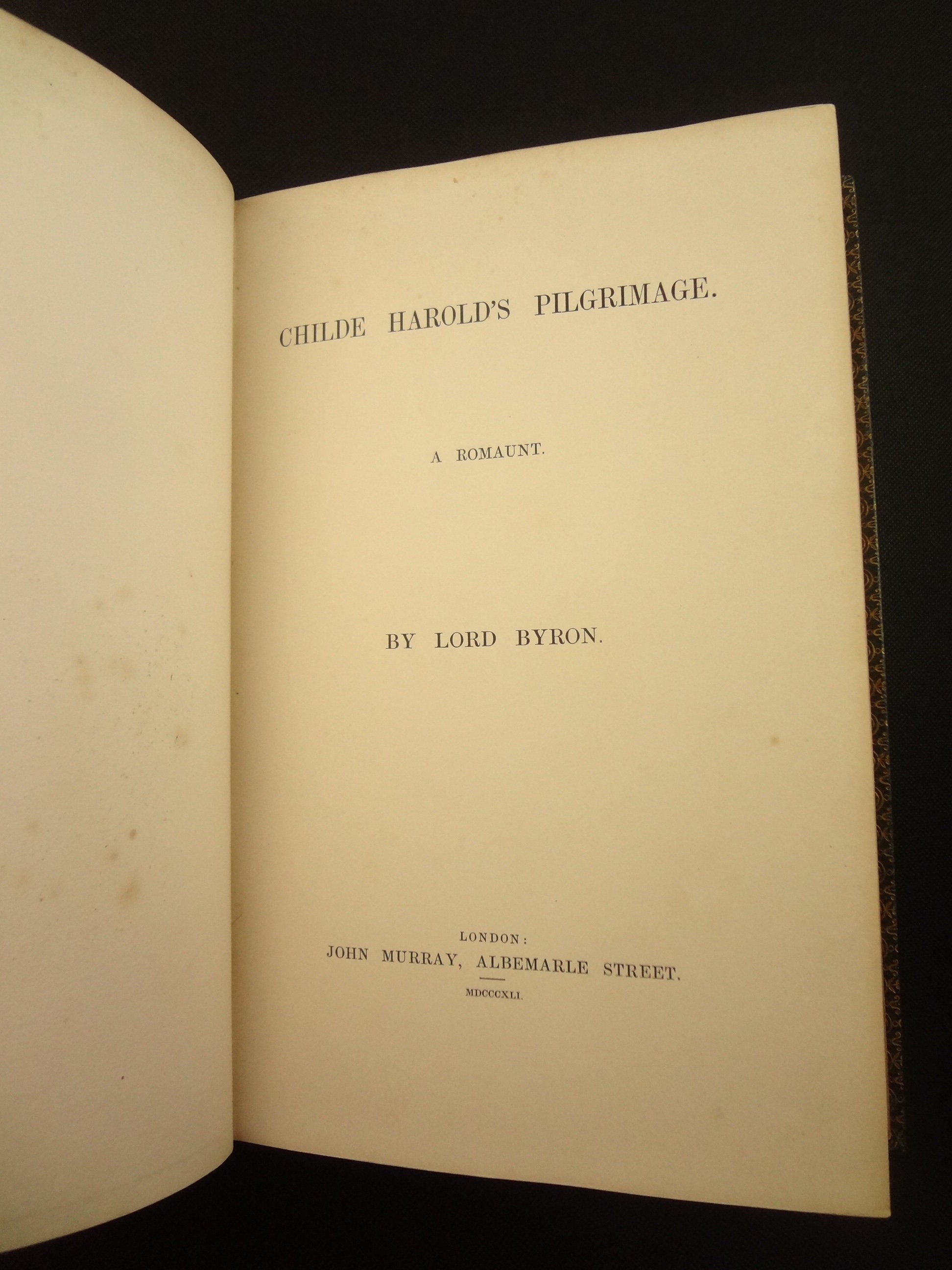 A strong handsome signed Zaehnsdorf fine binding houses this richly illustrated edition of Lord Byron's Childe Harold's Pilgrimage, containing 62 "embellishments". Some bibliophile history with this copy too, as the 1st blank page is stamped (at the top edge) by publisher and bookshop owner John Camden Hotten.
