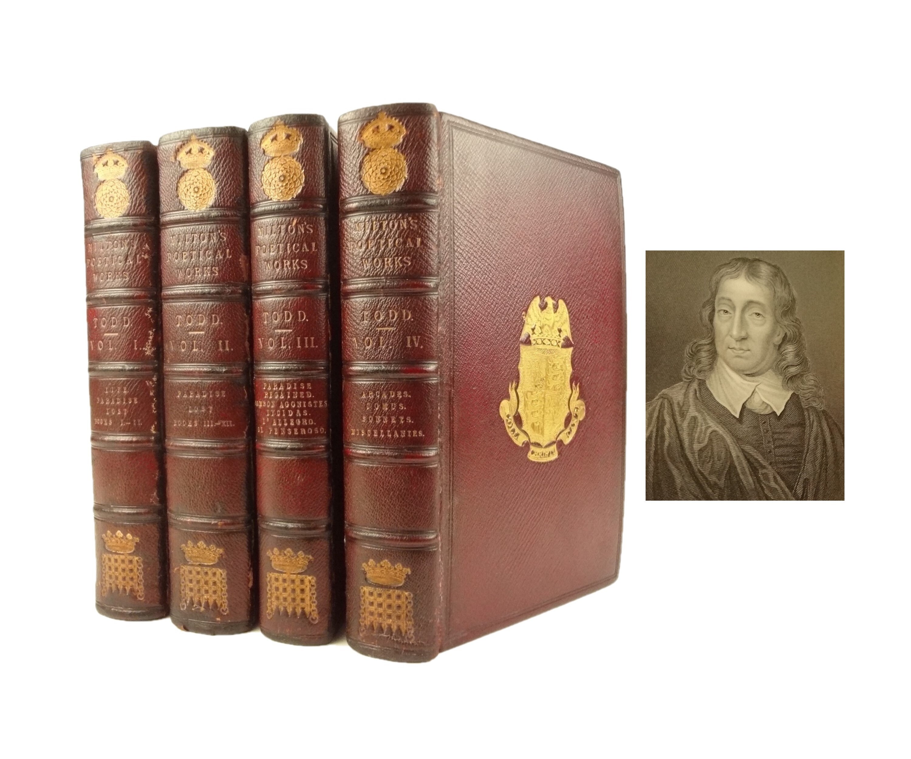 Each measures approx. 22 x 13 x 3.5 cm. Full burgundy leather bindings with a central armorial medallion to the front and rear board. Spine has five raised bands, with the title editor, and works within in three compartments in gilt, one compartment blanks, one compartment with the tudor rose, and one compartment with a portculis. All edges gilt. Complete in four volumes.
