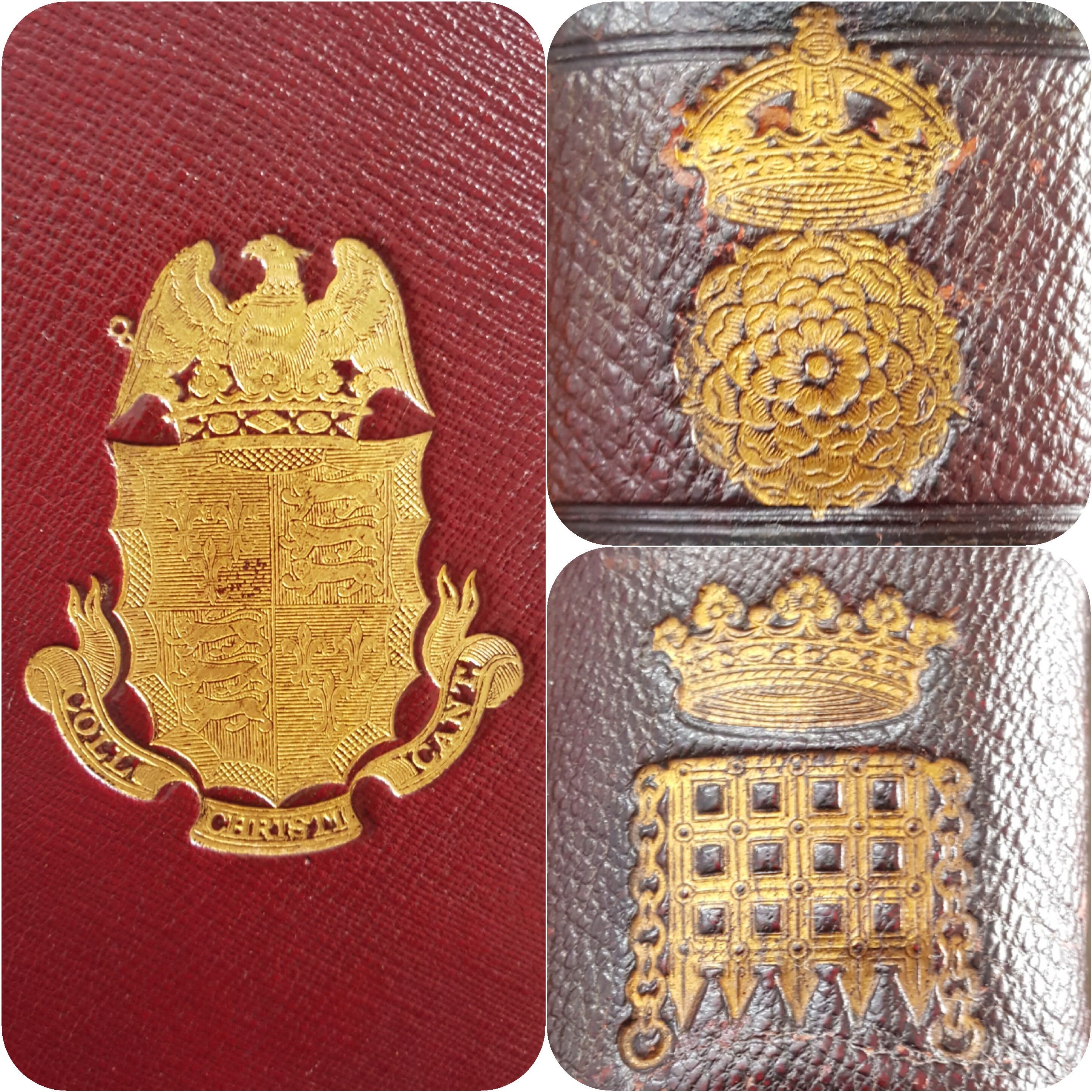 The bindings are not in the best condition (see condition notes) but notable. There is a school crest on the front board, with the motto "Coll. Christi. Cant.". For me, more enjoyable is the Tudor rose at the top of the spine, and the portcullis at the bottom, both crowned. These bindings aren't signed, but an entry in Worldcat (#25235339) says that Wiseman stamped a matching binding.