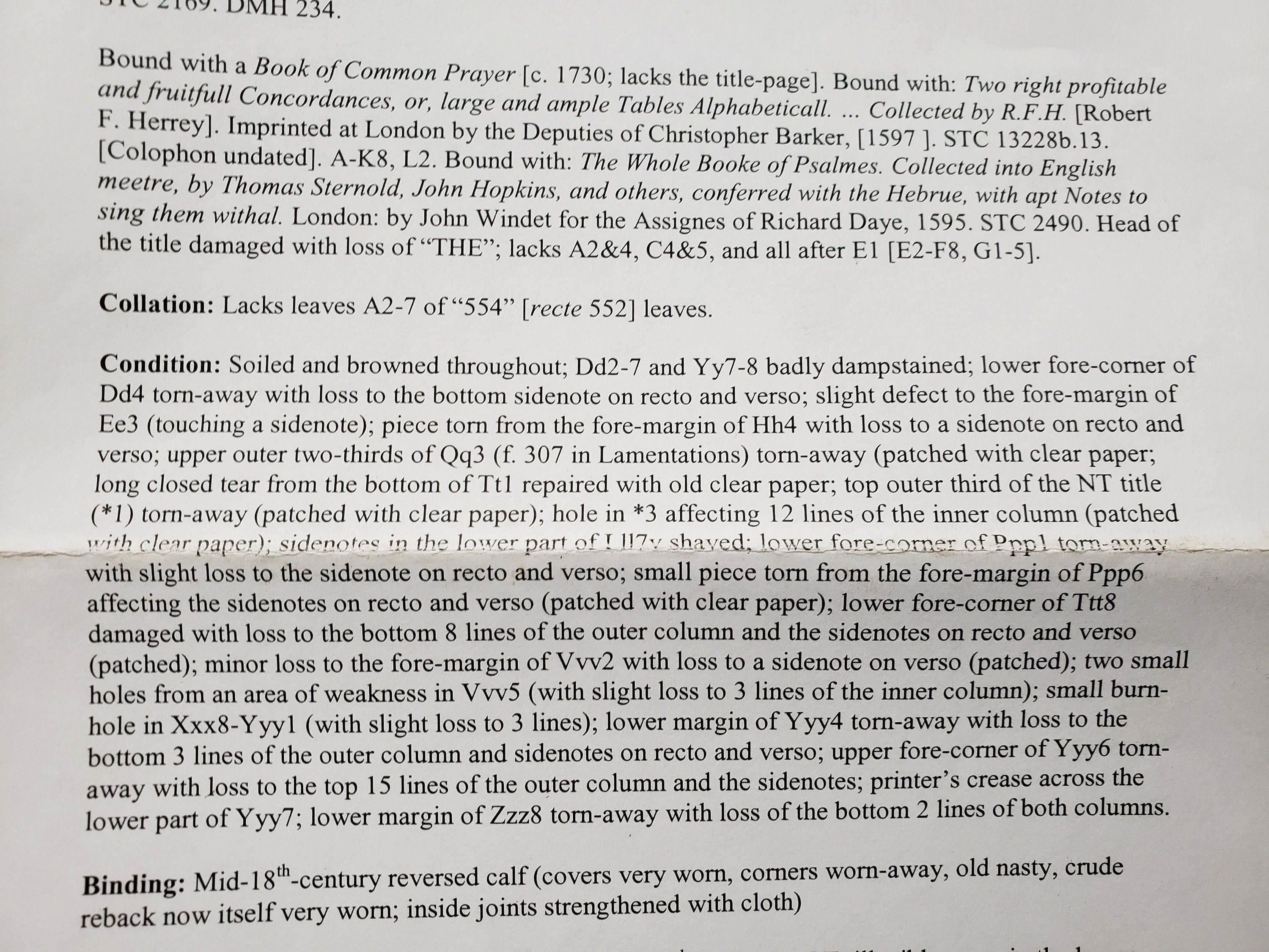 Pages: Book of Common Prayer (missing title page) - P4, Bible - Title, [1], 554 (but 552, two numbers unassigned at transition to NT, and missing 2-7 (collated A2-7)), Concordances - A-K8, L2, Hebrews - lacking A2&4, C4&5, and all after E1 (E2-F8, G1-5).