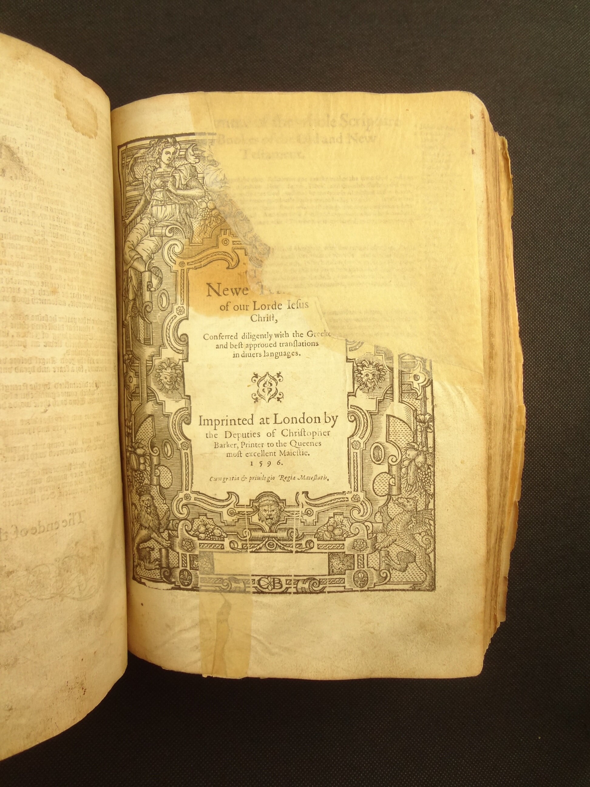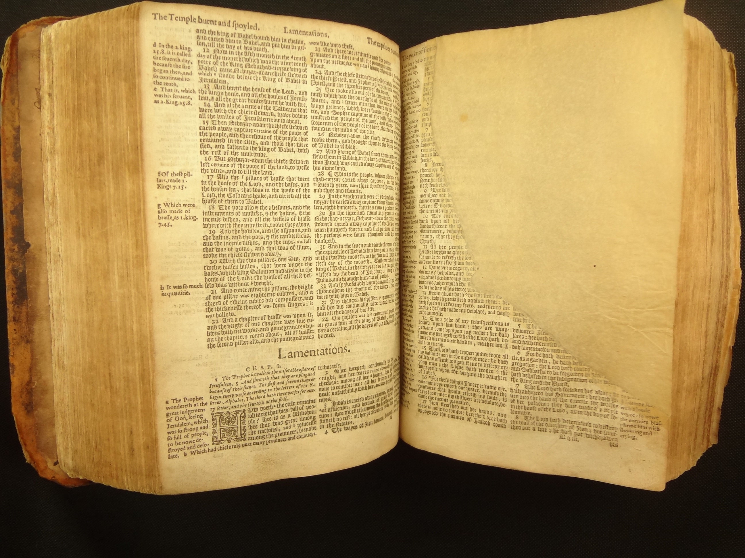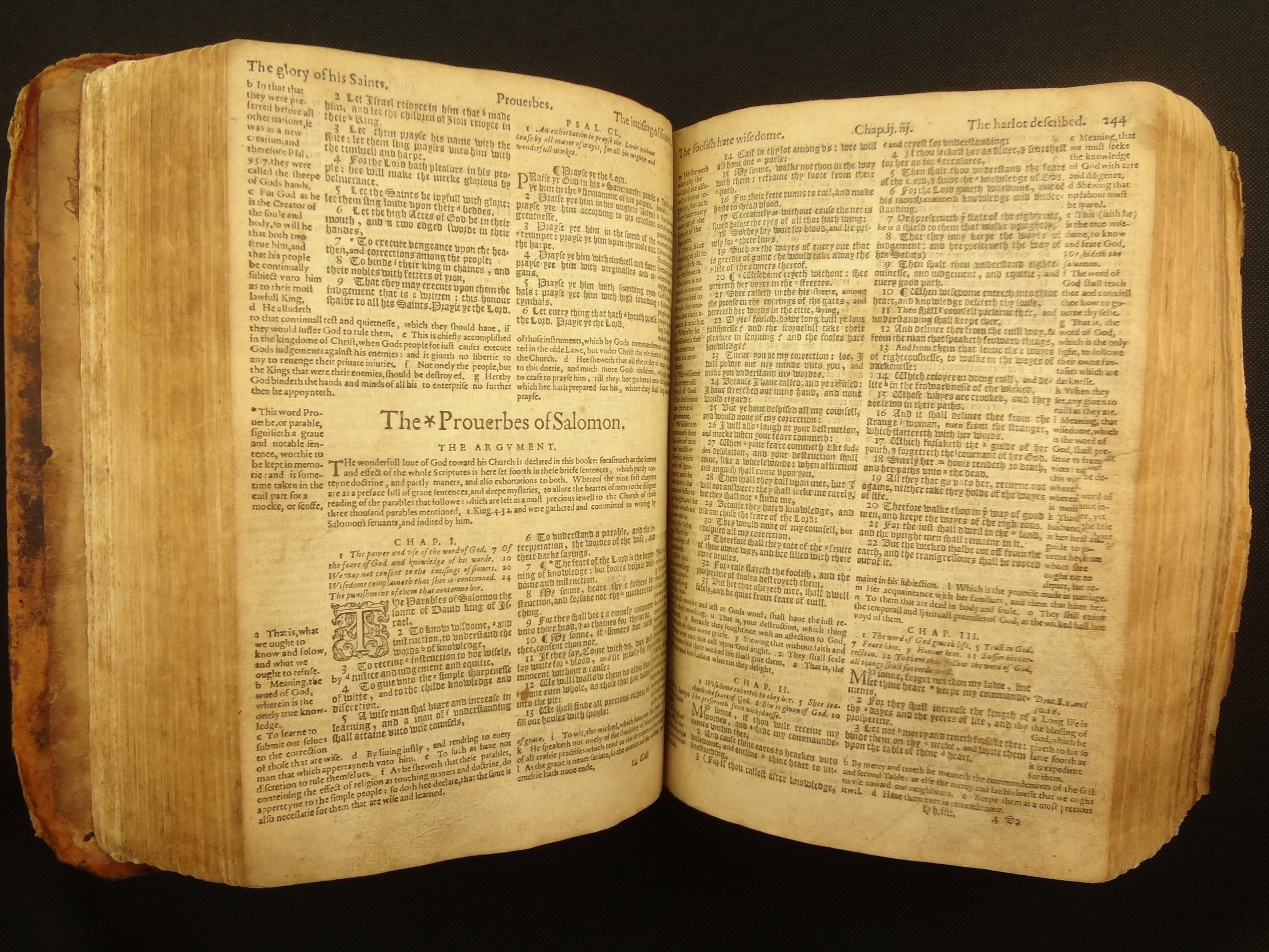 Inside, well loved. Browned and soiled throughout. Missing leaves collated A2-7 (Genesis Chapter 2 to 20). Dd2-7 and Yy7-8 dampstained. A number of chipped and torn leaves, many repaired with a paper. Top 2/3 of NT title page torn away and repaired with blank paper; several other similar examples. Some marginal notes trimmed. I'll post a photo of an in-depth condition report. To summarize, this Bible was well used for hundreds of years, and bears evidence of that use. Conversely, at some point, someone with some little skill in paper restoration went about cleaning up the page edges, tears, chips, etc.. The book presents delightfully as a well used survivor of the common people, unlike many examples that sat unloved in a library at an estate.