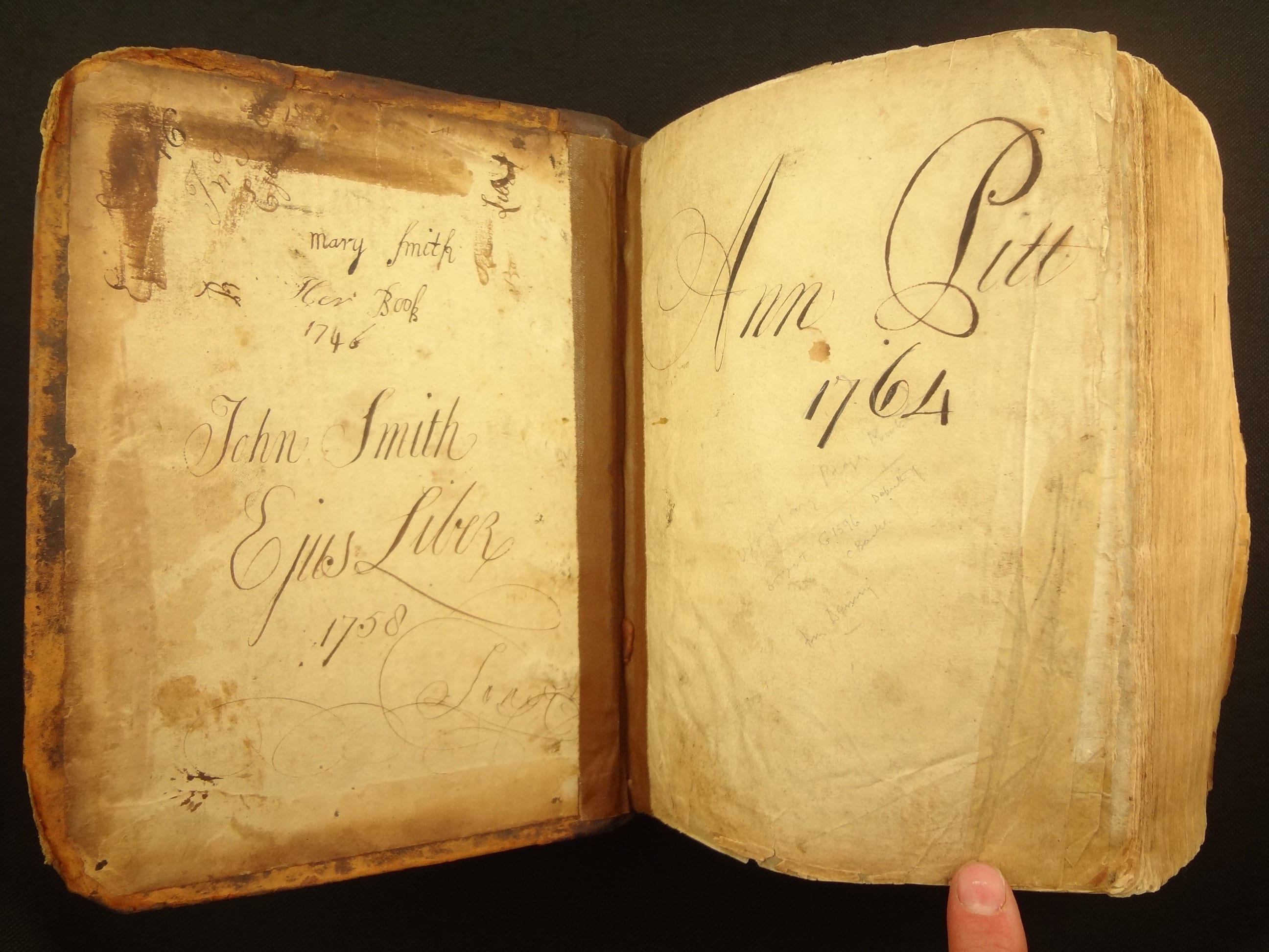 I've tried to research the provenance names and found little. Amos Parkes is the only signature that has a history I have possession of; he is listed in the tenant rolls of the Lyttelton Family of Halesworth Manor. Amos wrote a dated inscription of 1703. The oldest names in this Bible are William & Margaret Hildif (1642 date). There is also a "Richard Dudley" that appears 17th century in writing style. After Amos Parkes possessed the Bible, it passed into the Smith family (John, Mary, Ann Smith, & Elizabeth Forest, from the recorded births sheet). The the Pitts (Ben and Ann) took possession in the later 18th century (dates of 1758 and 1764). Both John Smith and Ben Pitts wrote their names on the binding's boards (front and rear).